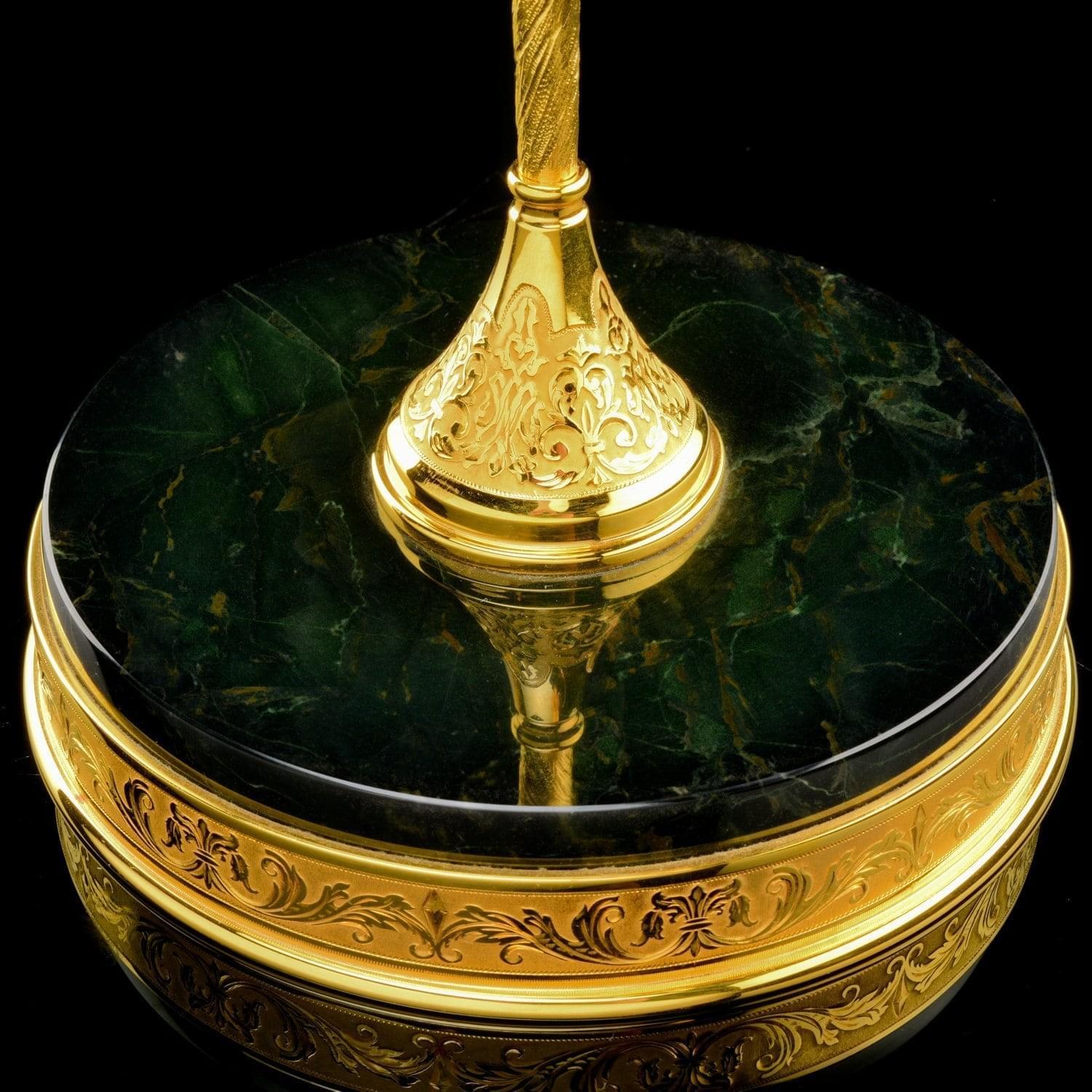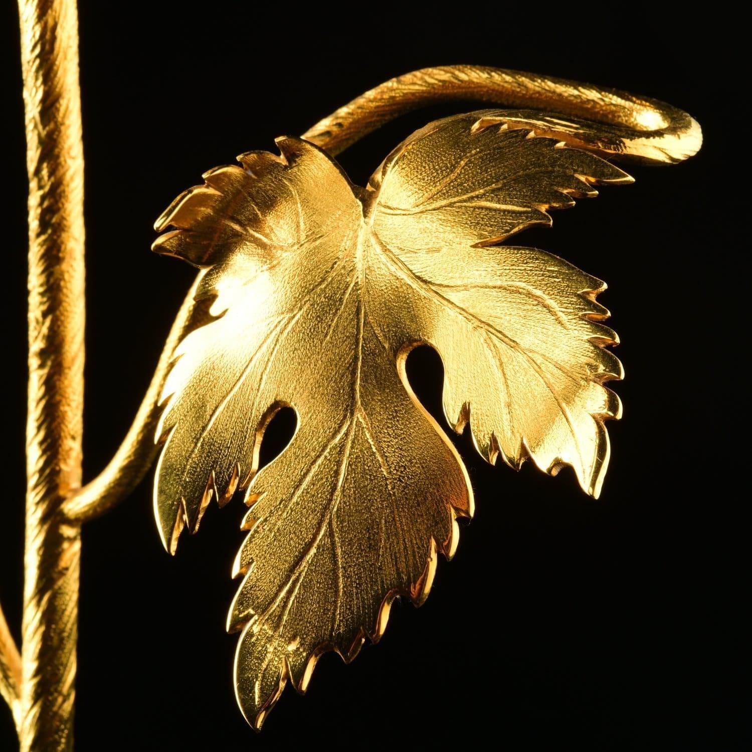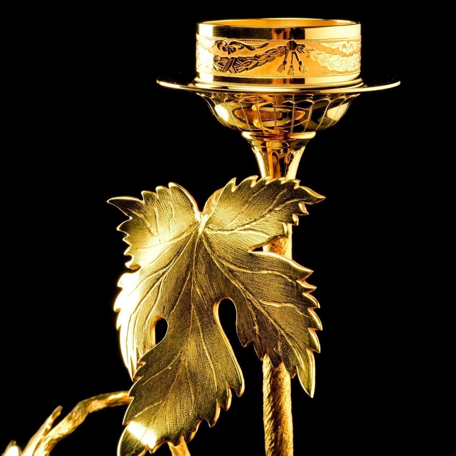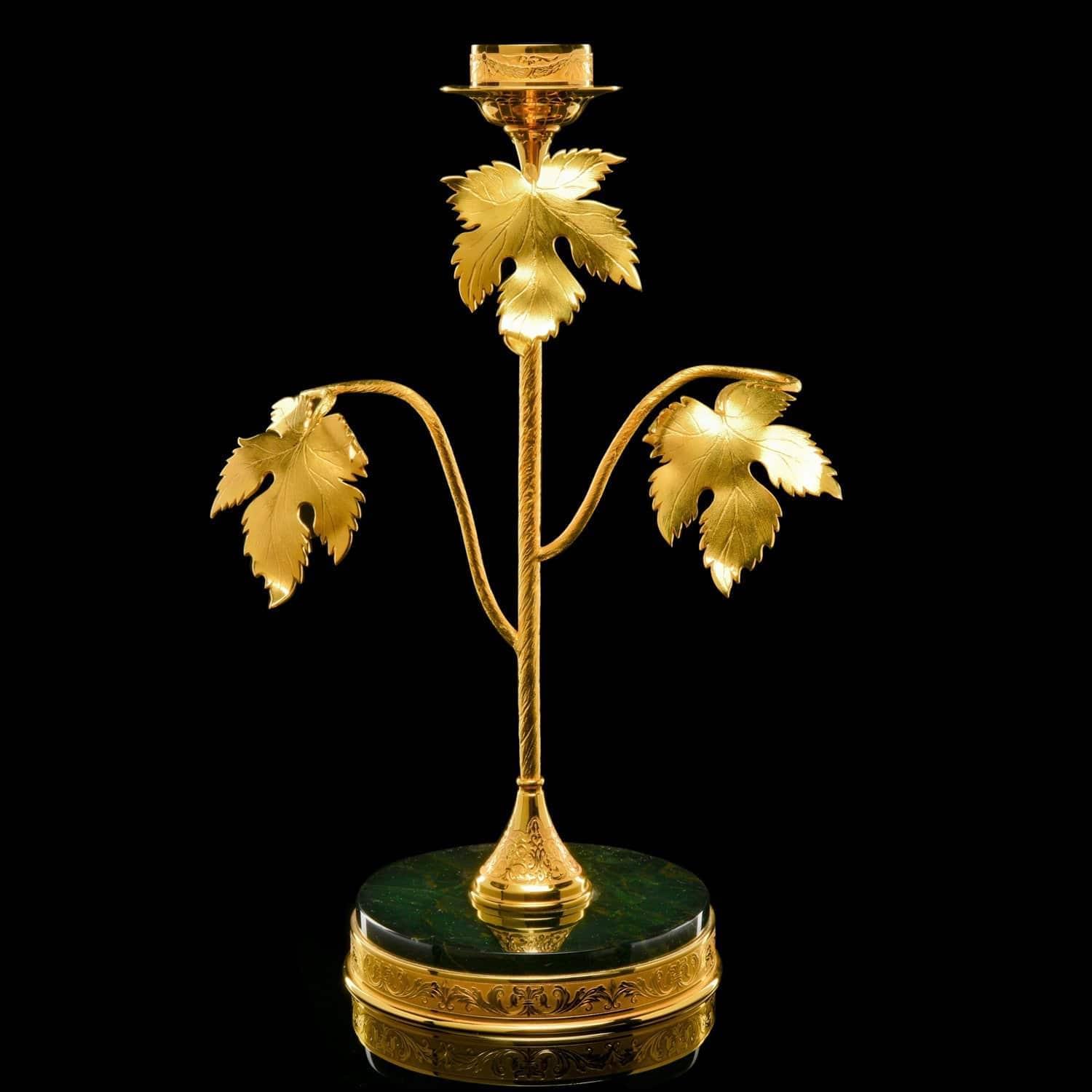 Набор из подсвечника и бокалов для коньяка декорированы христианским символом, виноградной лозой в качестве художественного лейтмотива. Виноградная лоза во всех культурах символизирует плодородие и изобилие. Лоза, увешанная кистями винограда, олицетворяет обильное здоровое потомство. радость созидания, укрепления семьи, продолжение рода. В Ветхом Завете (Псалтыри) написано: «Жена твоя, как плодовитая лоза, в доме твоем». Ухоженный заботливыми руками человека виноградник означает мир и благополучие. Наши предки, имевшие дом и надел плодородной земли, считали себя обеспеченными и благополучными. Но из-за регулярных войн люди теряли имущество, а многие становились вынужденно рабами. В связи с этим фраза «каждый будет сидеть под своею виноградною лозою» стала обозначать символ мира. Техника исполнения: токарные работы, рисовка кистью, гравировка иглой по лаку, травление, гравировка резцом, полировка, никелирование, золочение. В изделии использовались традиционные методы обработки и украшения Златоустовской гравюры на металле. ....