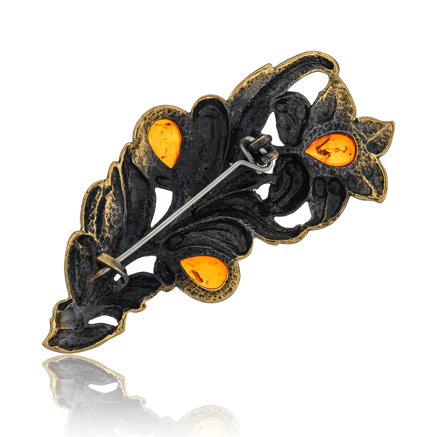 Брошь с янтарем "Букет лилий".Материалы: латунь, янтарь.