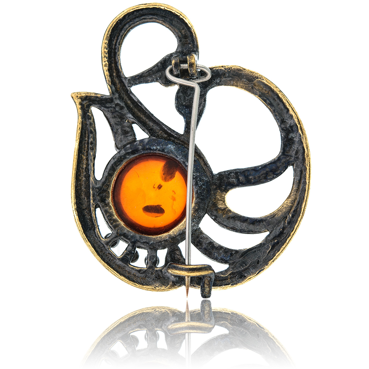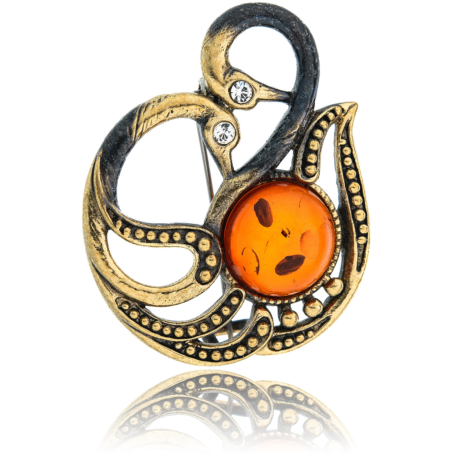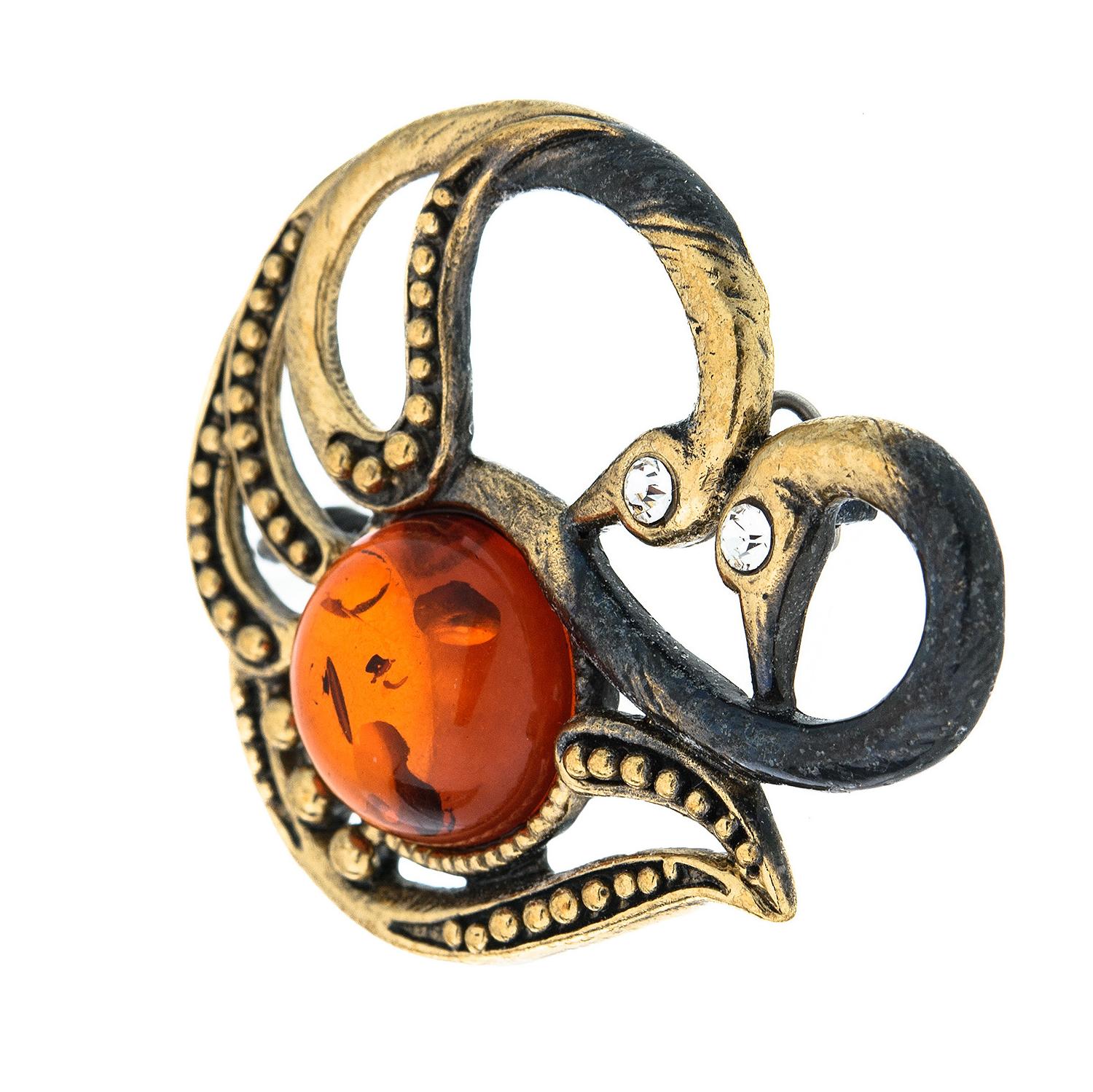 Брошь с янтарем "Пара лебедей".Материалы: латунь, янтарь.