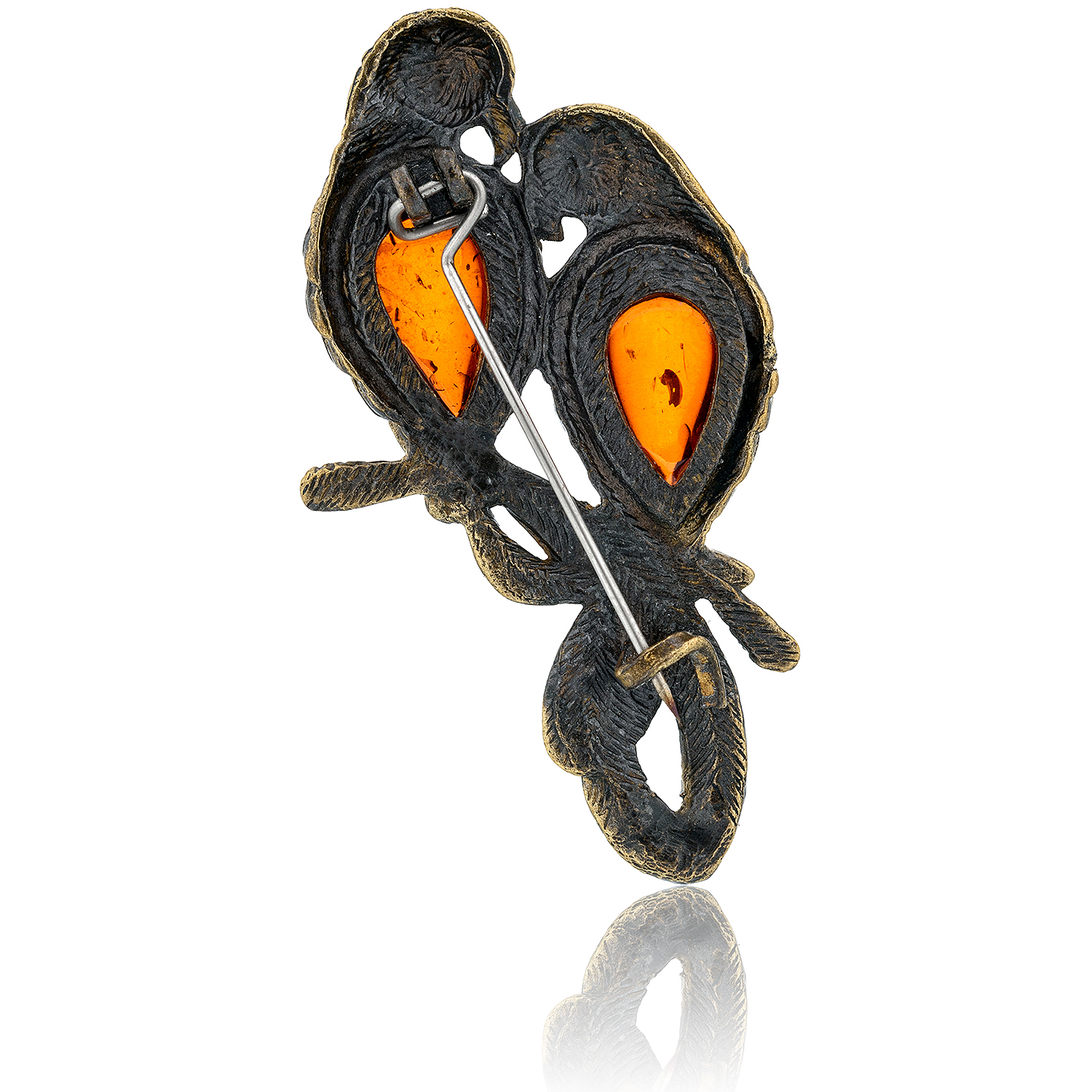 Брошь с янтарем "Попугайчики Неразлучники".Материалы: бронза, янтарь.