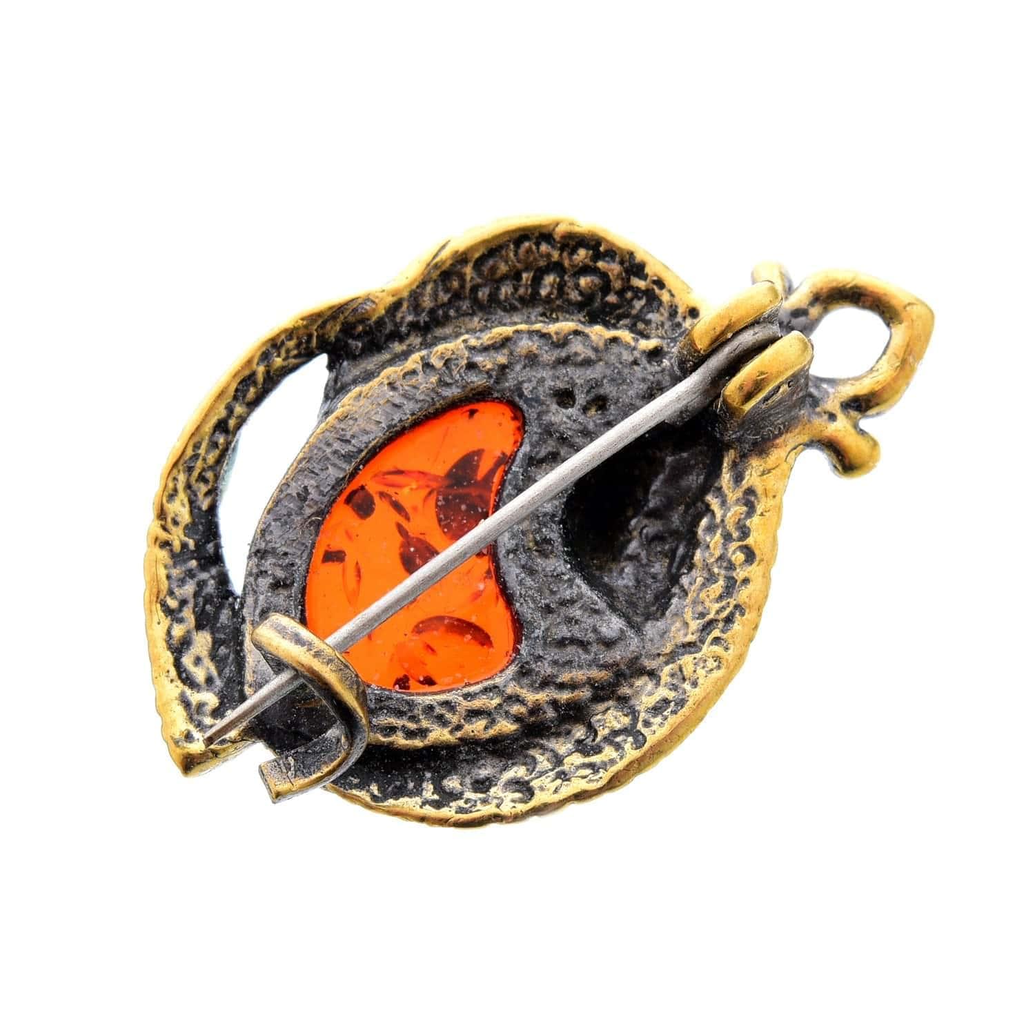 Брошь с янтарем "Винтажный листик 5". Коньячный