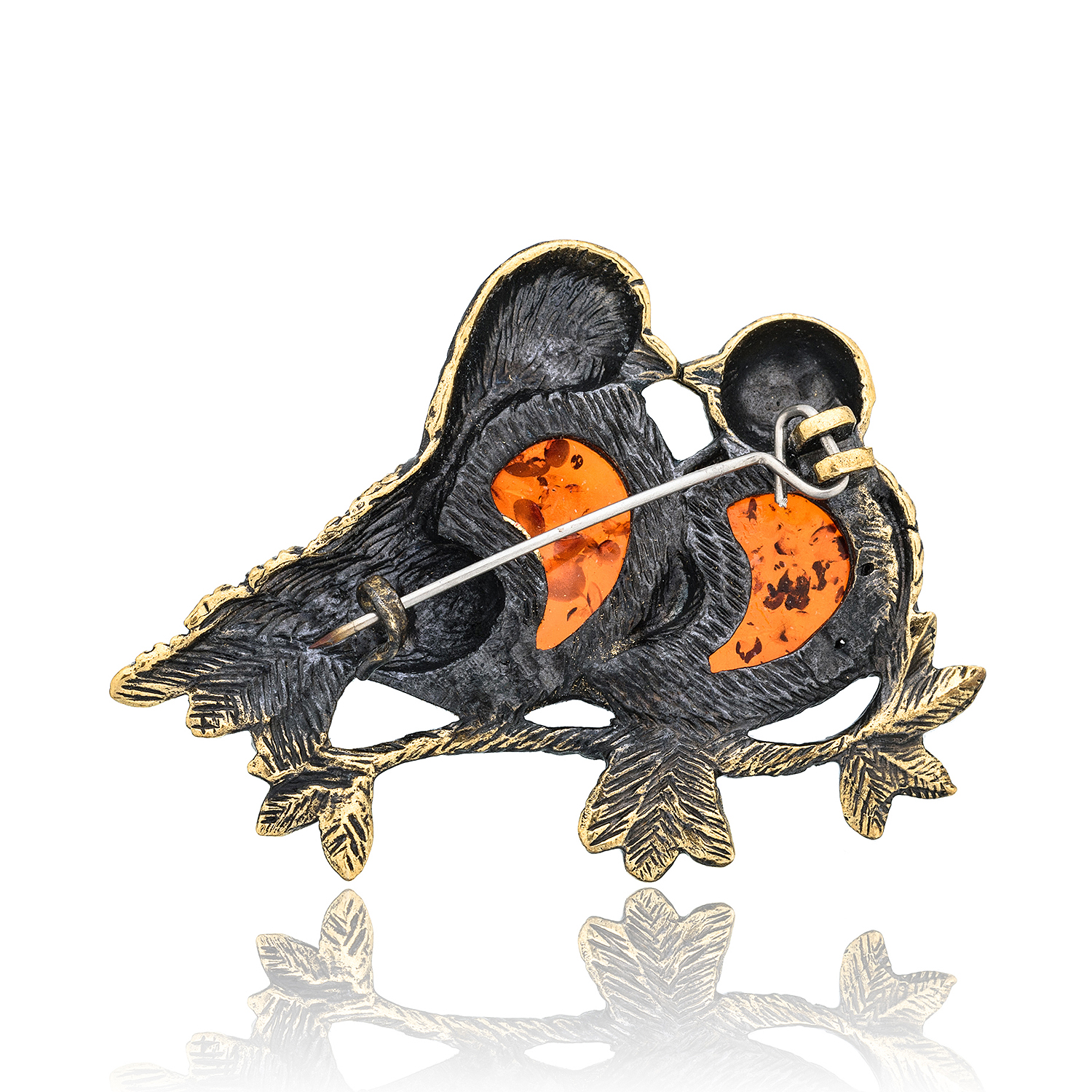 Брошь с янтарем "Влюбленные голубки".Материалы: латунь, янтарь.
