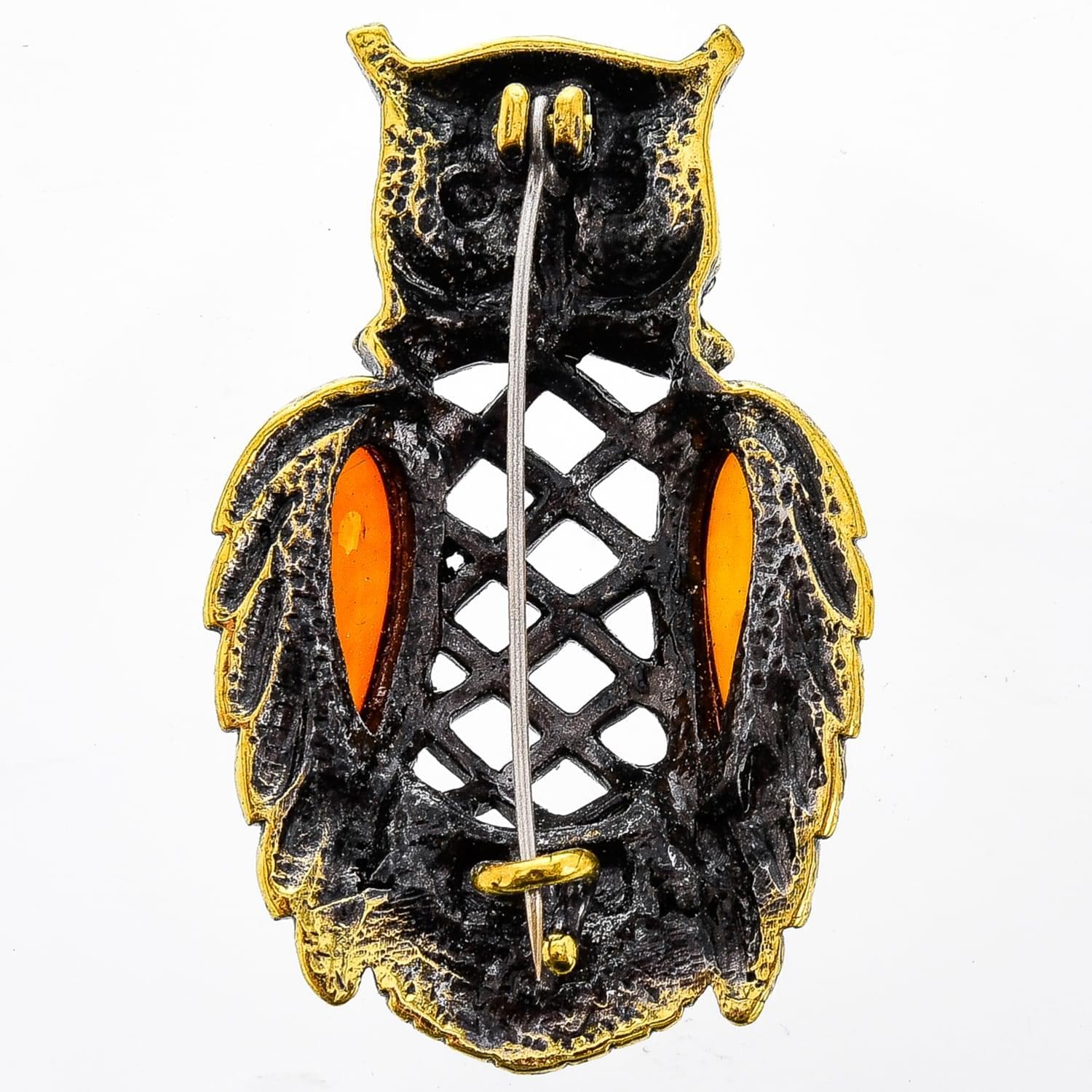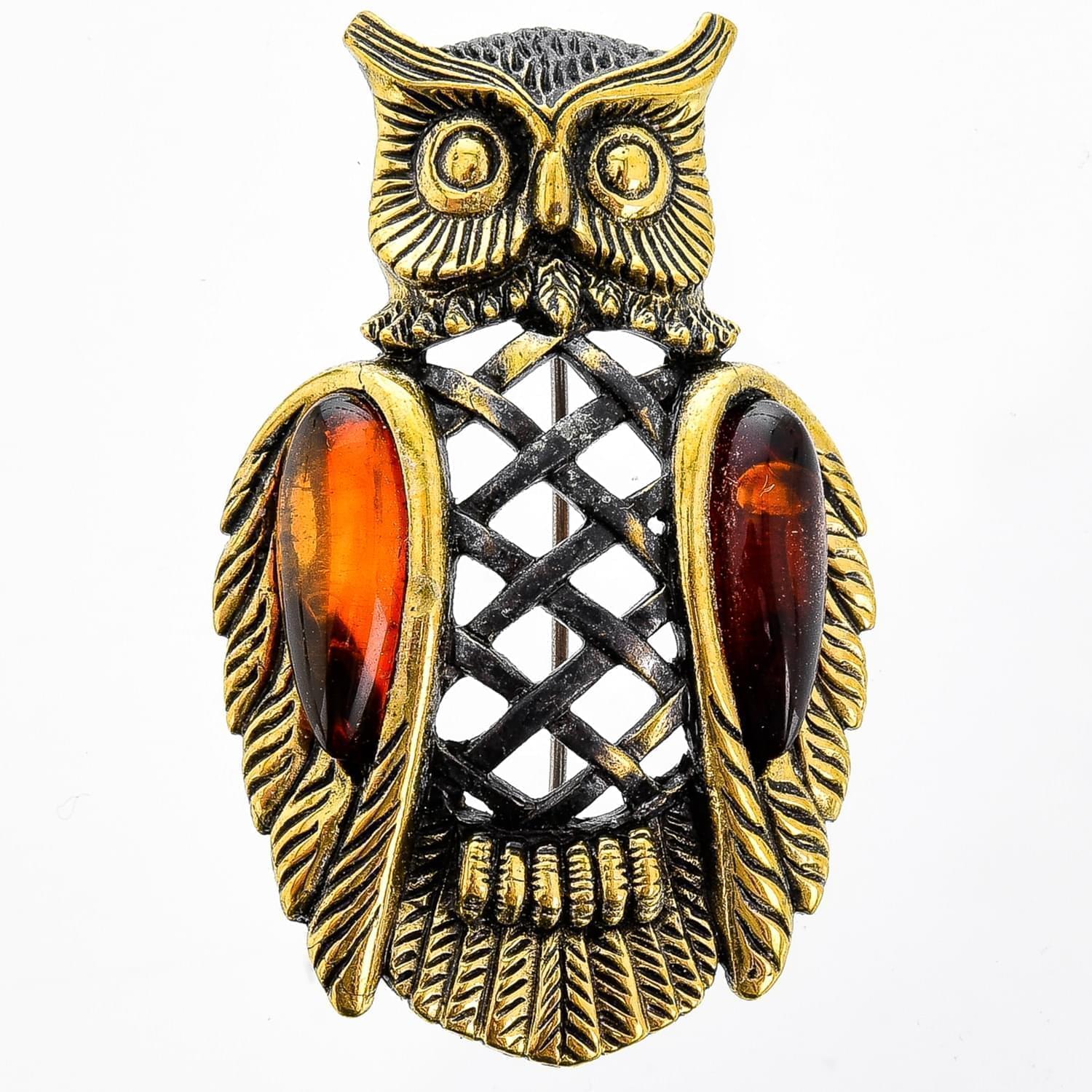 Брошь с янтарем "Филин в жилетке". Коньячный