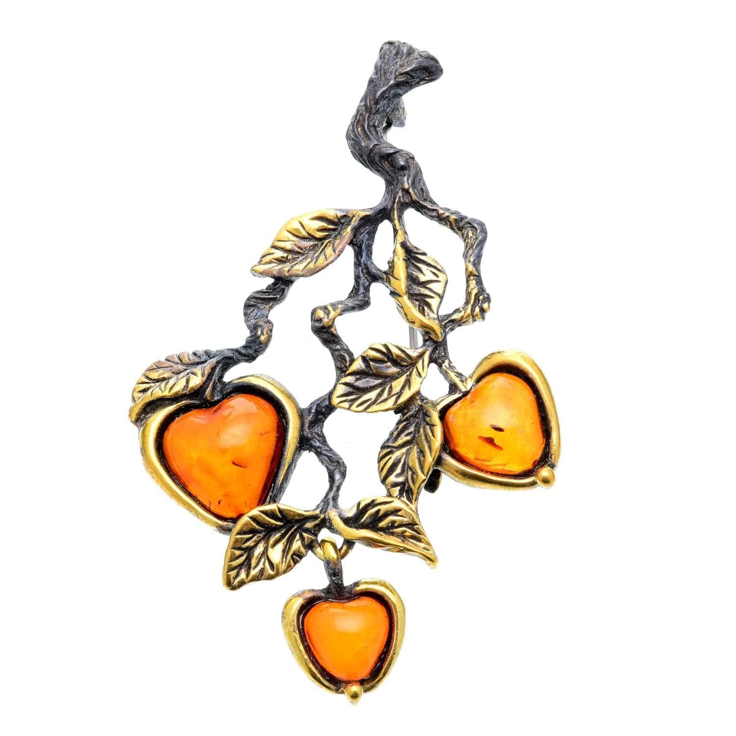 Брошь с янтарем "Яблочки на ветке". Коньячный