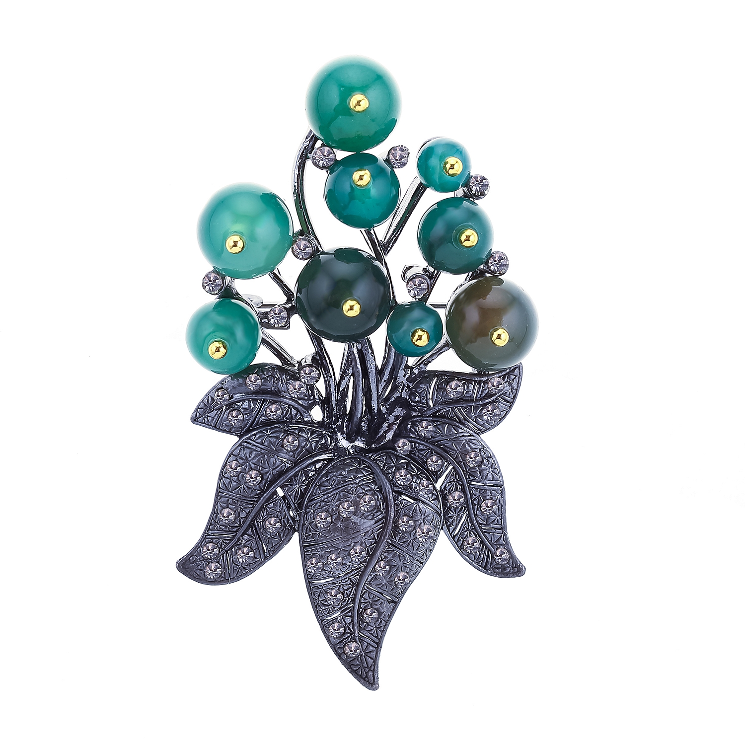 Металлическая брошь с хризопразом и стразами.