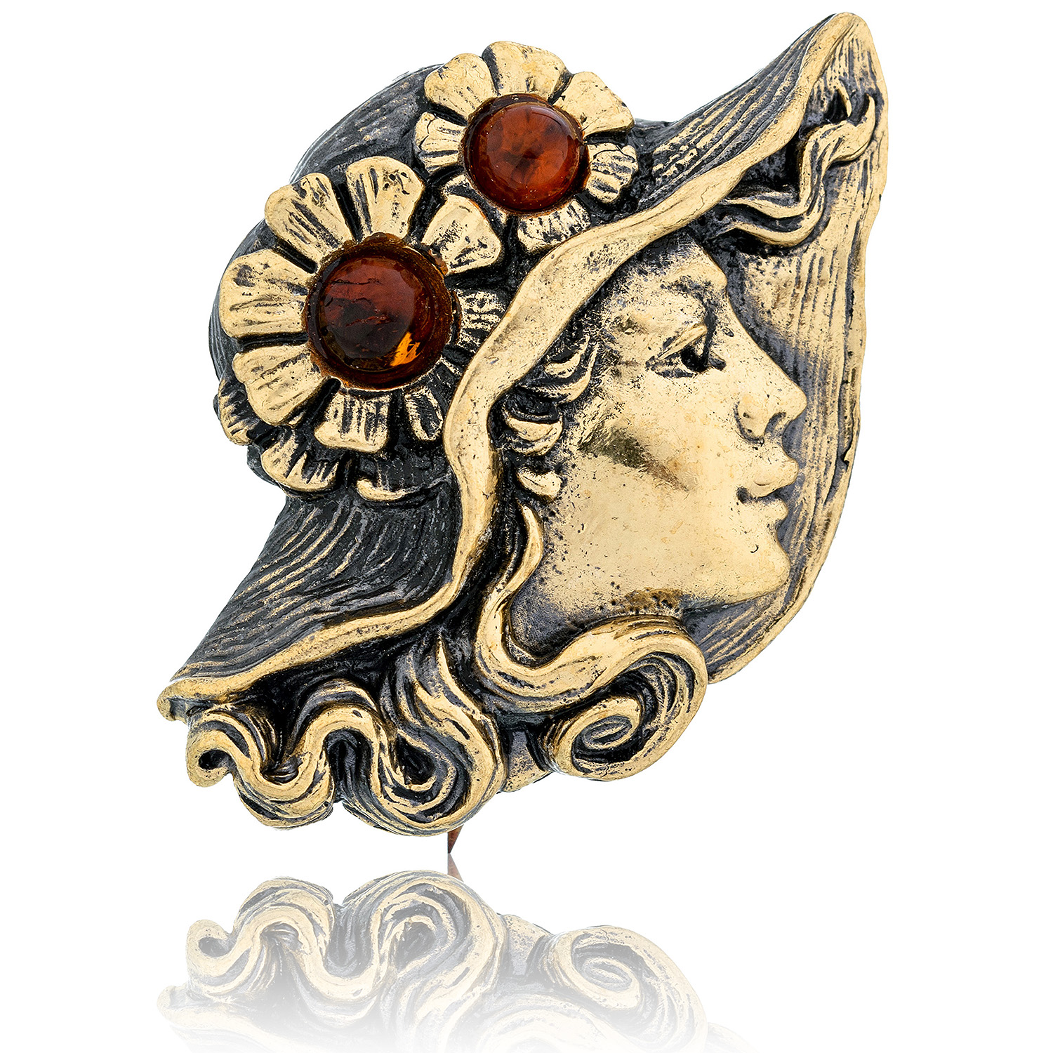 Русские подарки и сувениры → Украшения → Броши → Брошь с янтарем "Дама в цветочной шляпе" (коньячный)