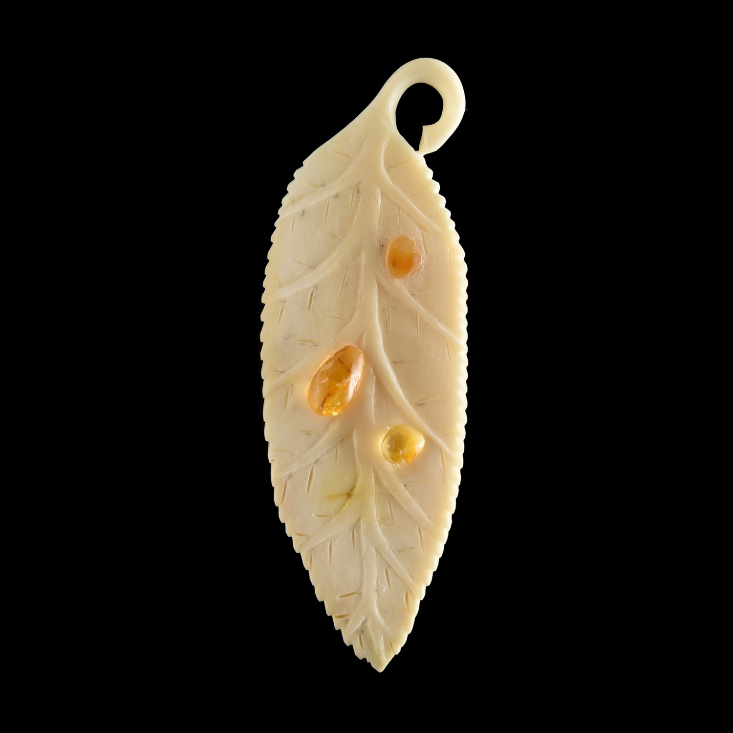 Брошь из бивня мамонта "Ивовый листок".Материалы: бивень мамонта, янтарь.
