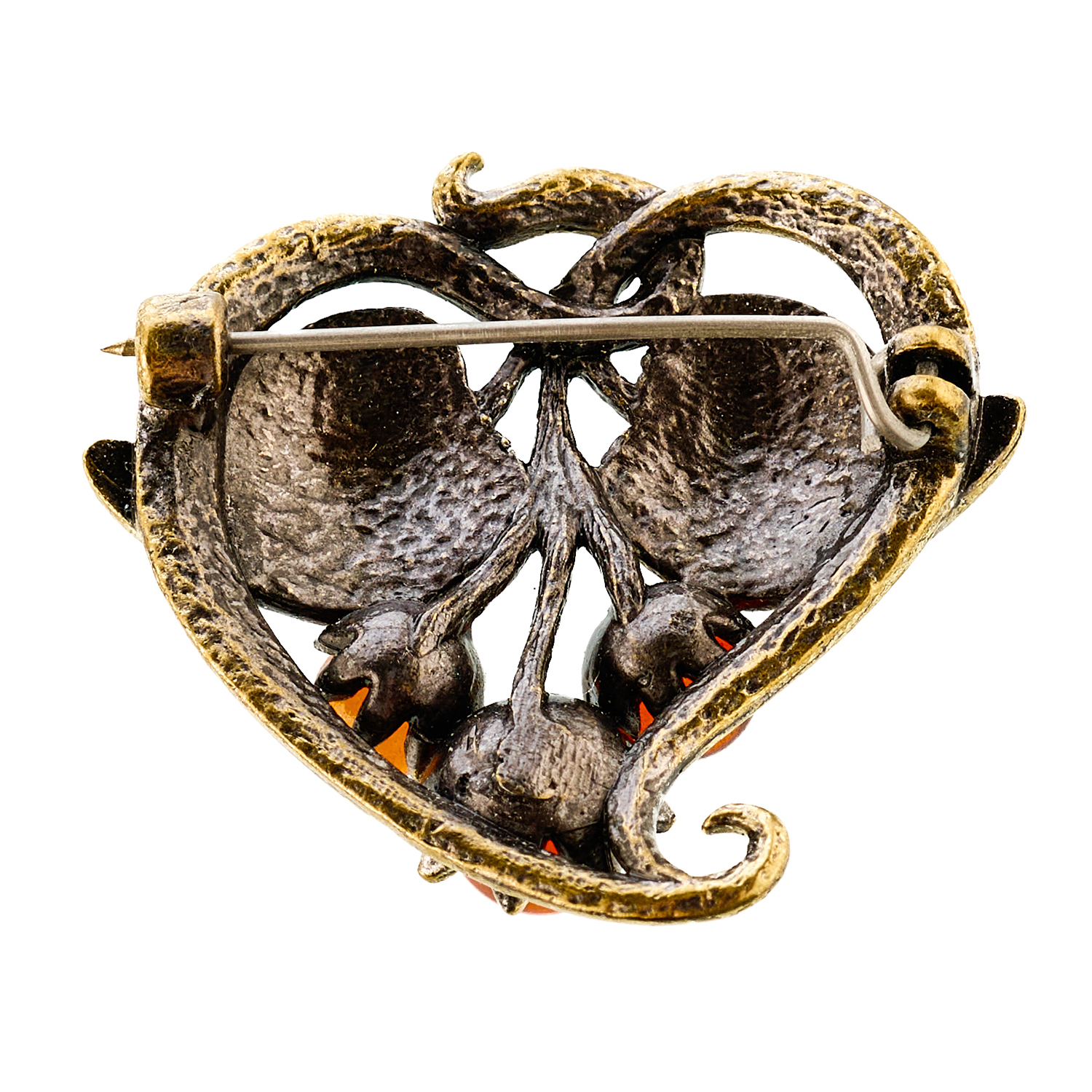 Брошь с янтарем "Листик. Сердце".Материалы: бронза, янтарь.