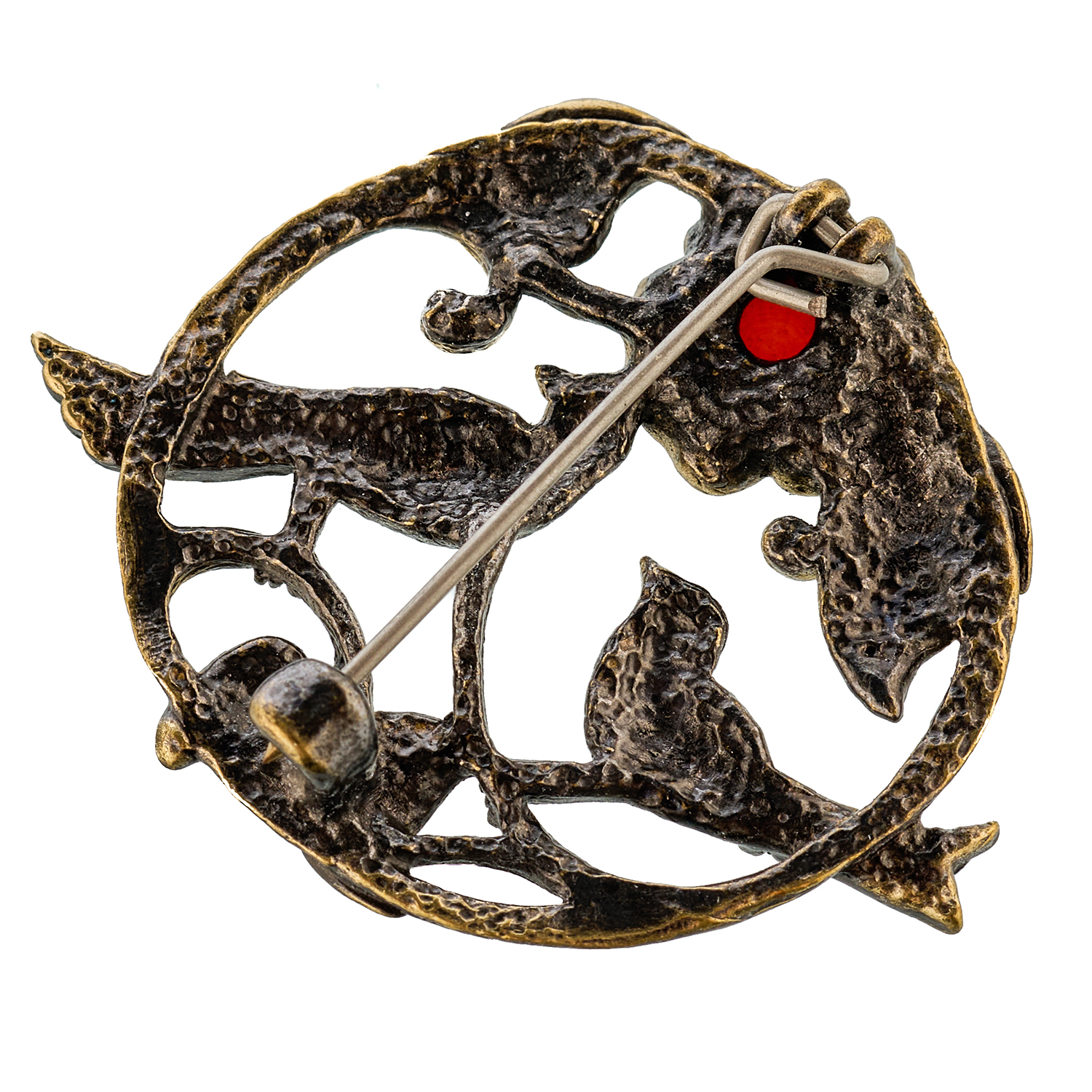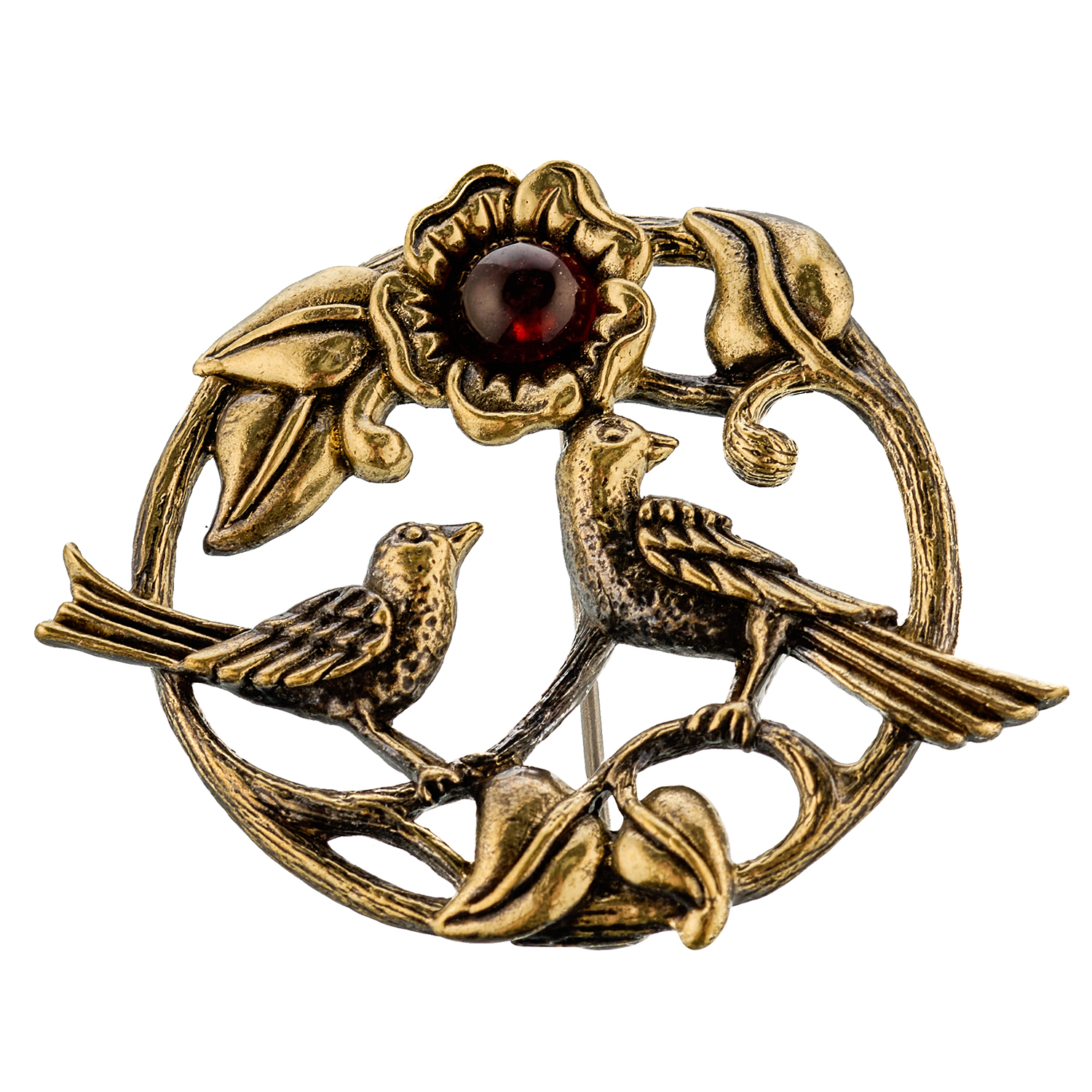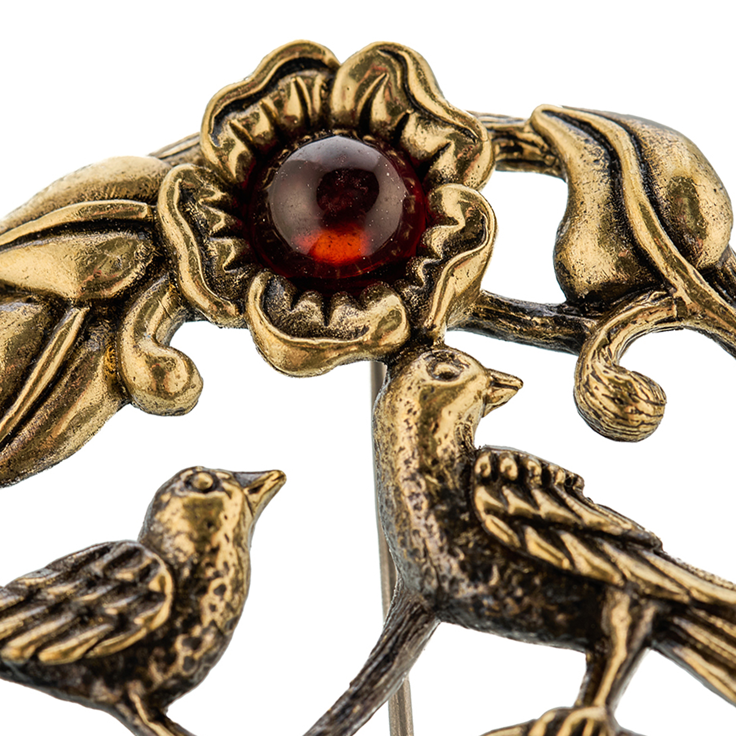 Брошь с янтарем "Птички. Сад чудес".Материалы: бронза, янтарь.