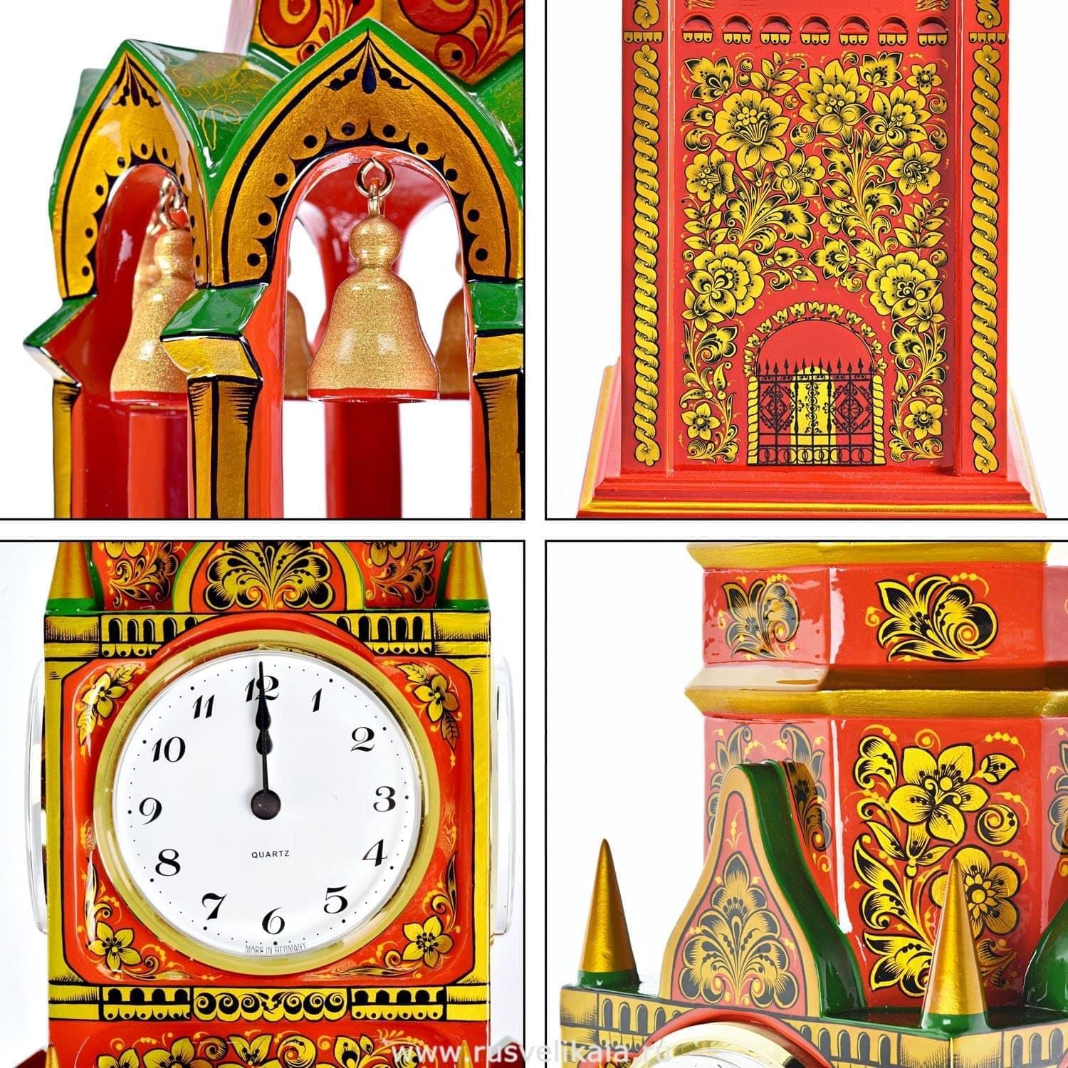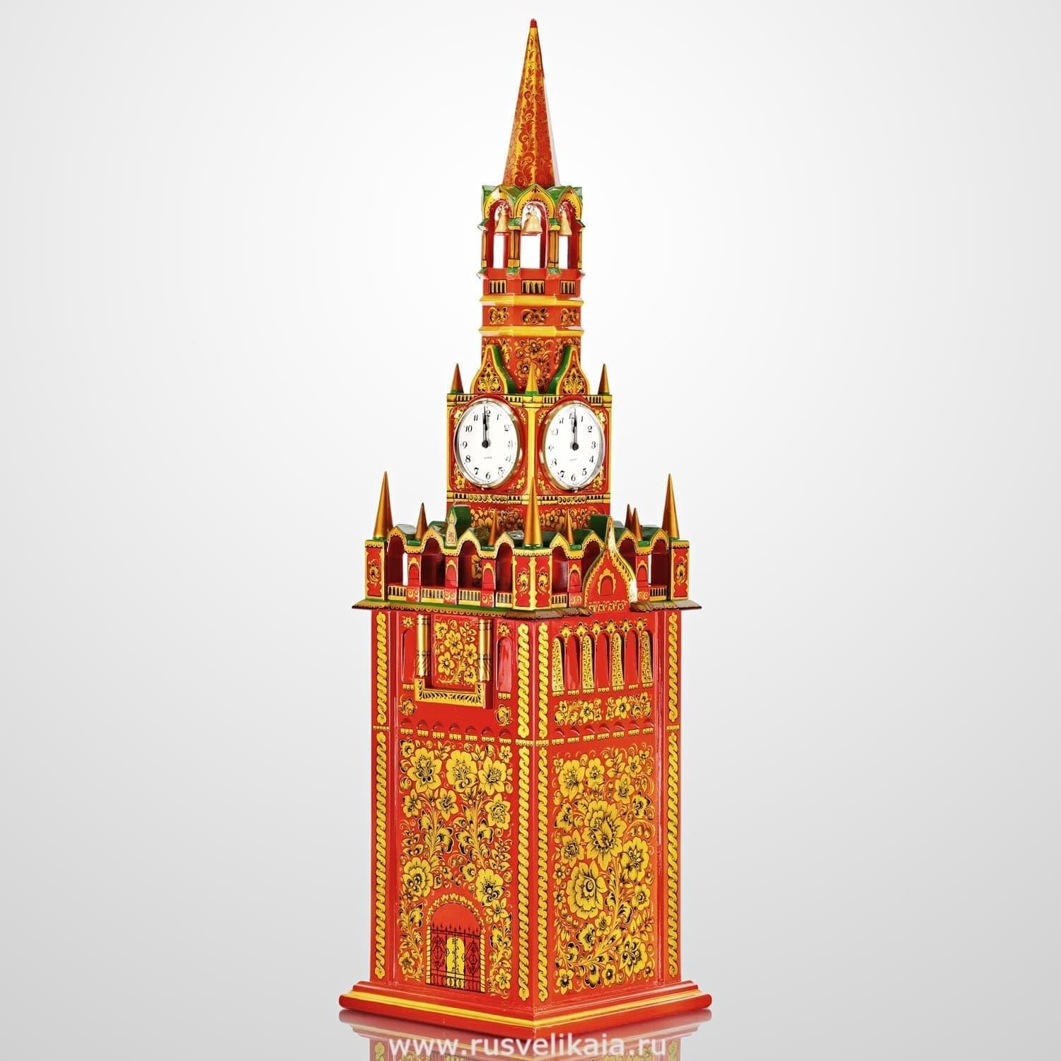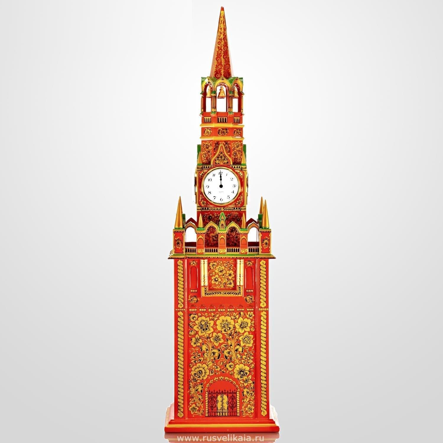 Деревянный корпус часов в виде башни Московского Кремля - главной резиденции президента России - высотой 1 м 10 см искусно выточен токарем по дереву из массива легкой и твердой древесины, липы, оформлен художником-рисовальщиком по красному фону ярким и детальным растительно-цветочным орнаментом с золотой краской в хохломской технике свободно-кистевой росписи - без предварительной прорисовки рисунка...