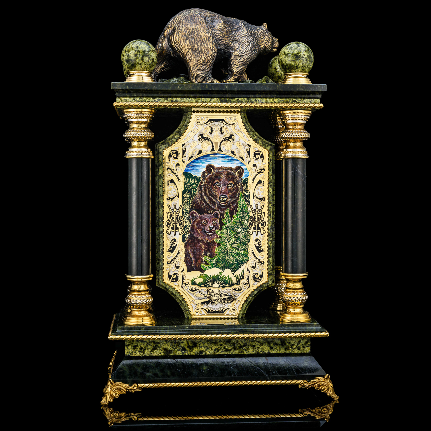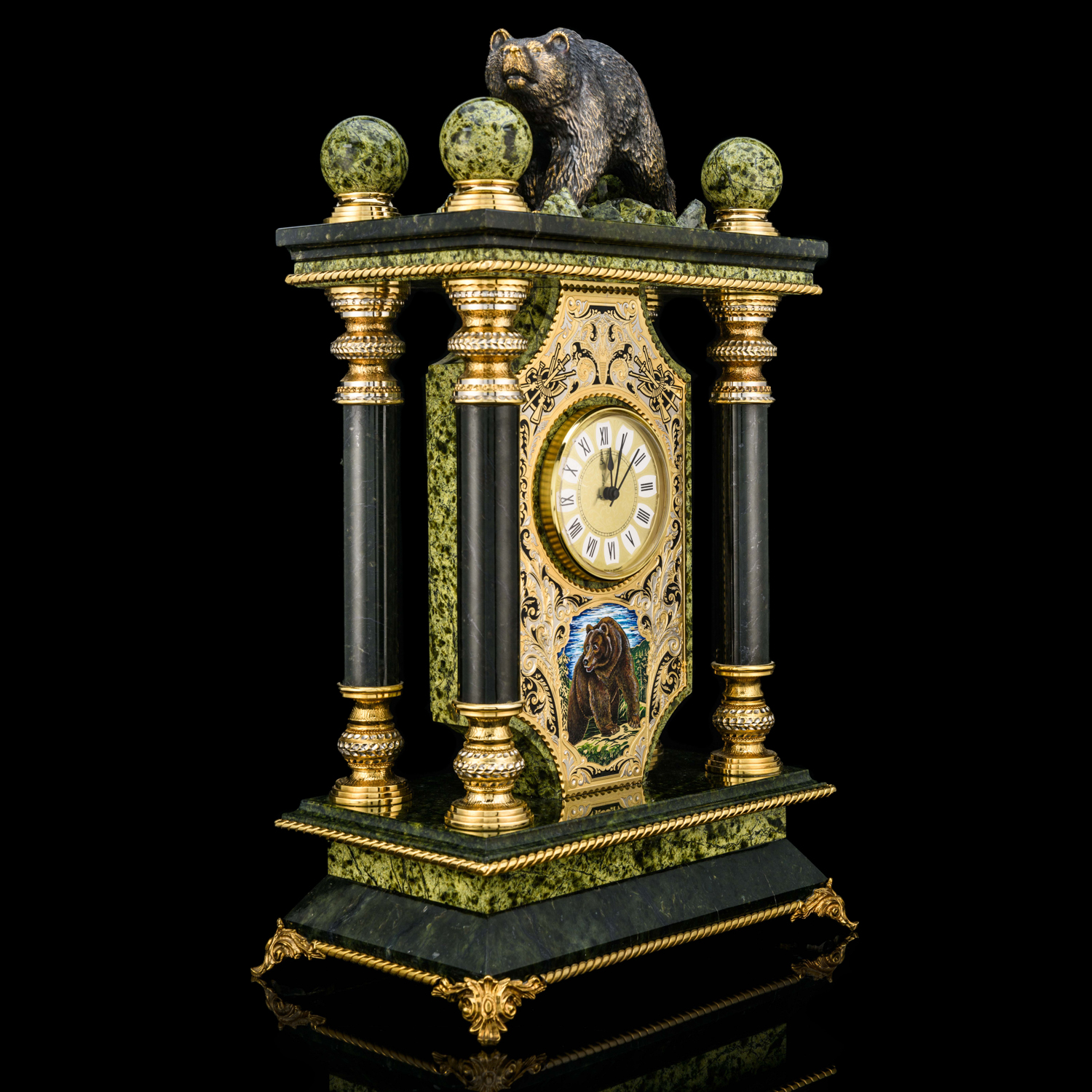 Часы каминные "Медведь". Златоуст.Материалы: змеевик, бронза, латунь, никель, золото 999,9*, эмаль.