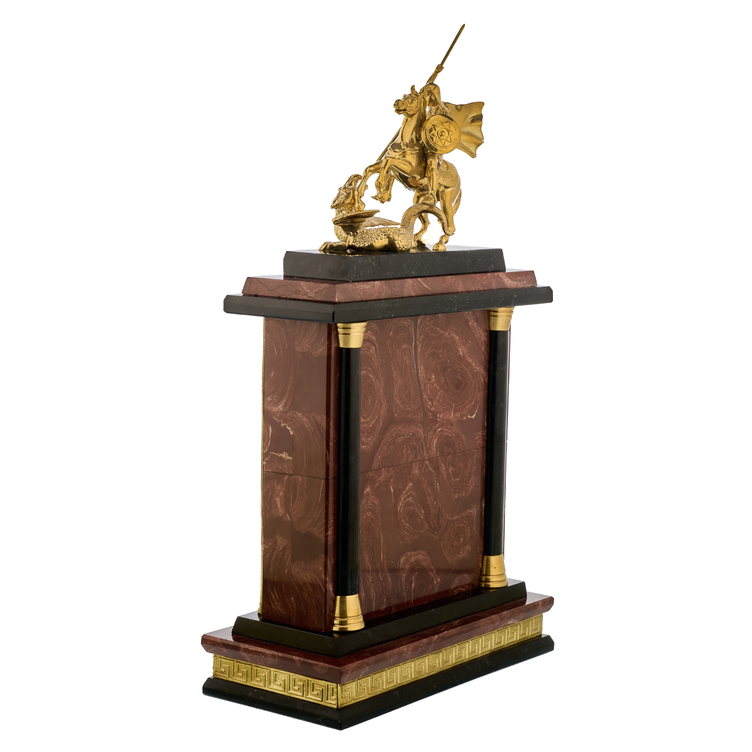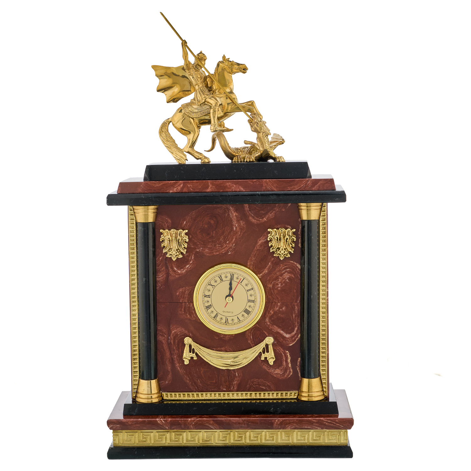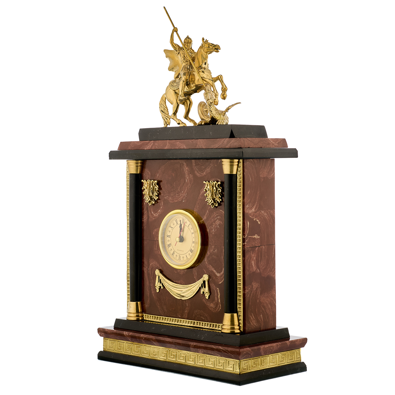 Часы настольные из камня "Георгий Победоносец". Златоуст.Материалы: яшма, бронза, золото 999,9*.