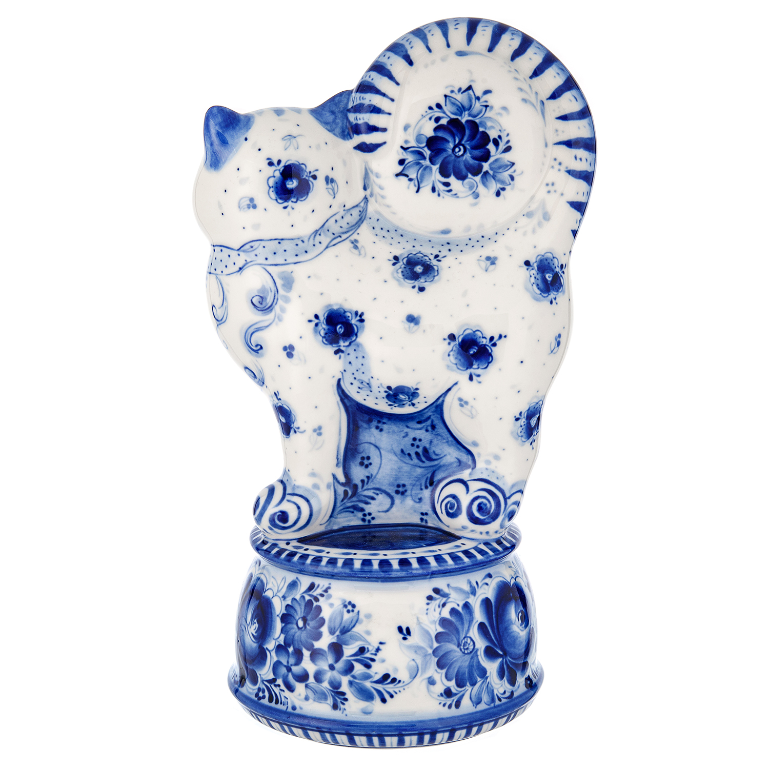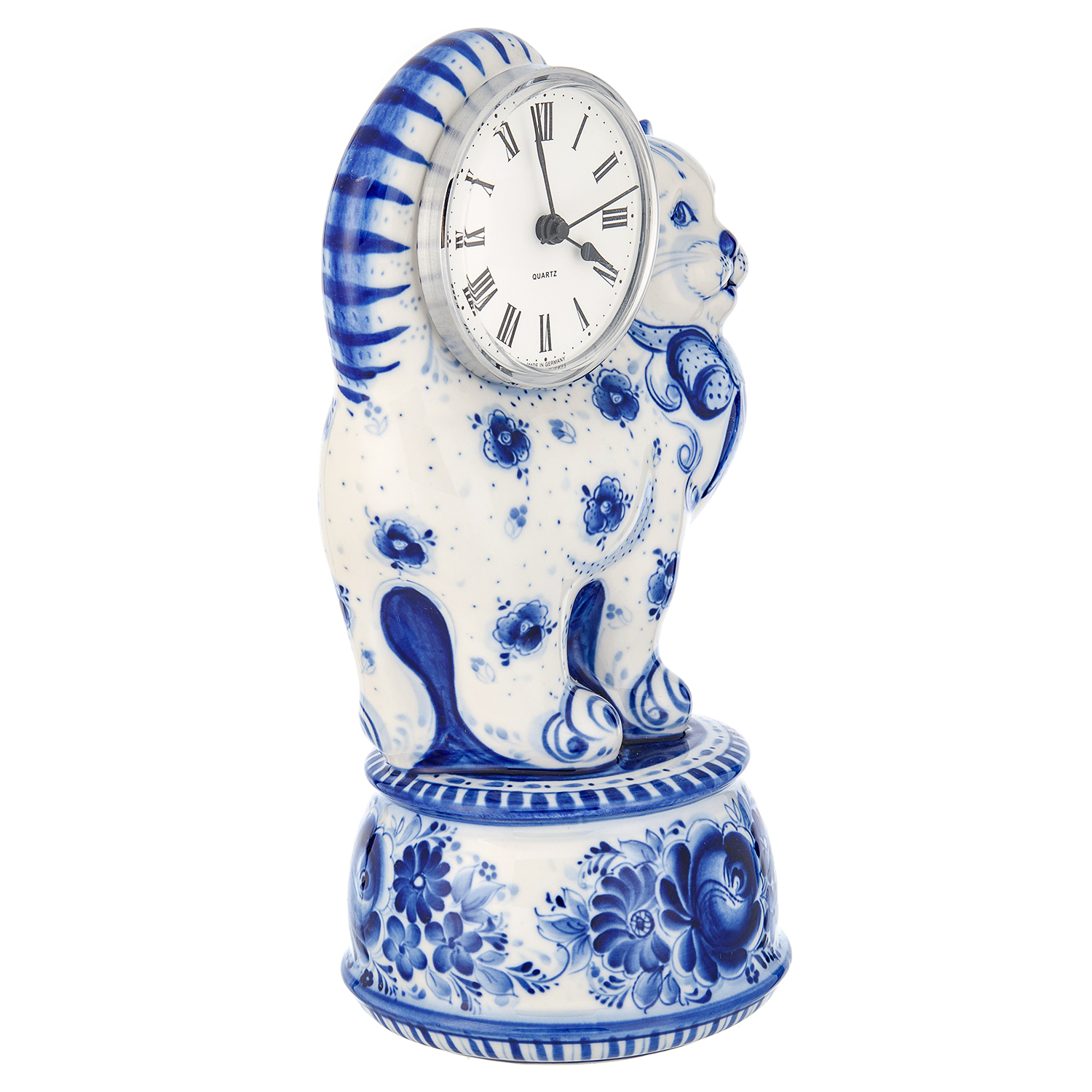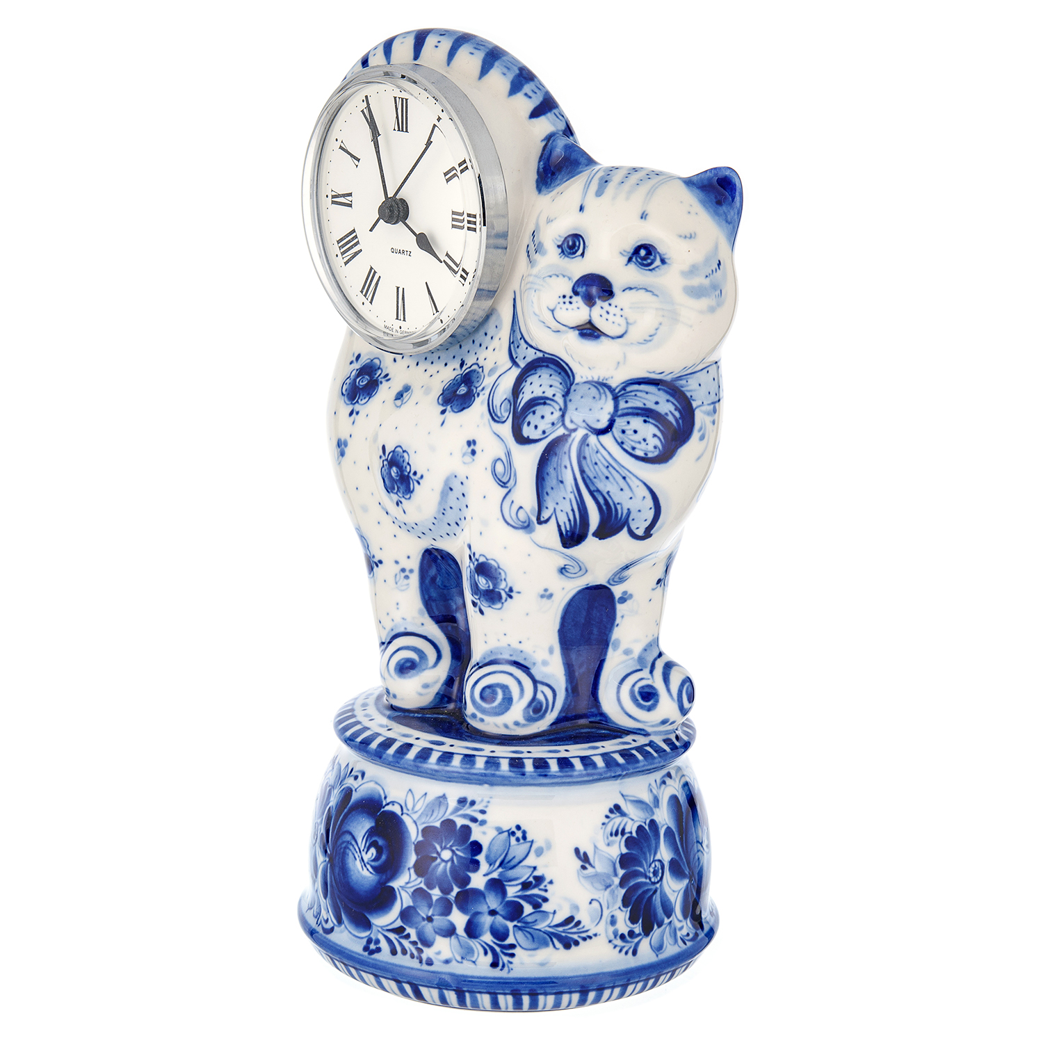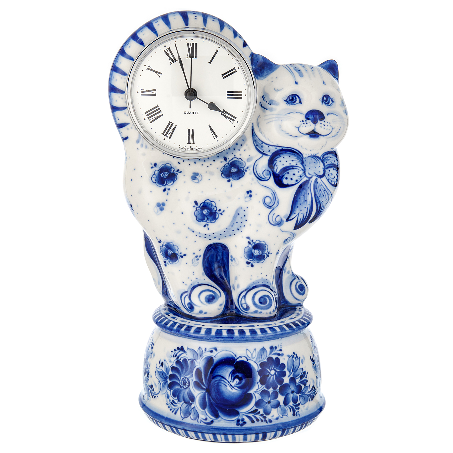 Красивые часы в фарфоровой оболочке - новинка нашего собрания оригинальных украшений для интерьера. Часы с округлым циферблатом (кварцевый механизм) совмещены с выразительной фарфоровой скульптурой кота. Скульптура расписана вручную в старинной художественной технике подглазурного кобальта (традиционная Гжель). Великолепный фарфоровый аксессуар - то, что нужно, если вы подыскиваете стильный памятный подарок на новоселье или день рождения близкому человеку. Кстати, часы-кошка могут стать хорошим презентом любителю этих животных на Международный день кошек, который отмечается 1 марта.