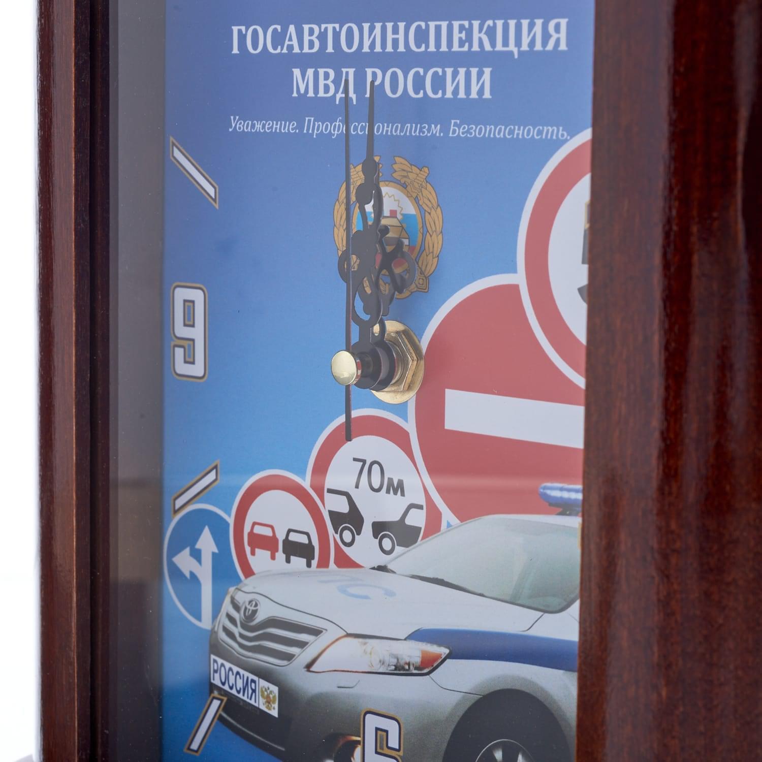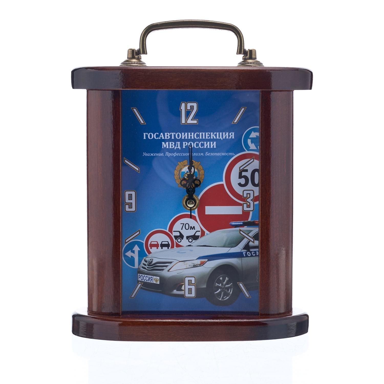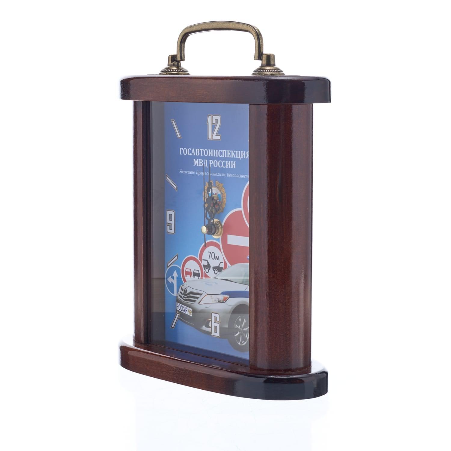 Основа короба создана из натурального дерева приятного кофейного цвета. Передняя часть занята циферблатом с цветной подложкой - ее украшает тематическая надпись и герб. Часы станут хорошим памятным подарком работнику ГИБДД на профессиональный или личный праздник. Стильный аксессуар с необычным дизайном украсит рабочую или домашнюю обстановку, на протяжении многих лет будет дарить приятные воспоминания.