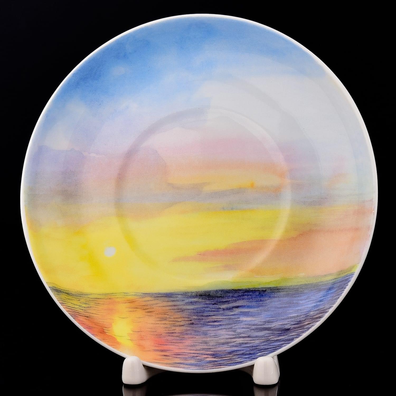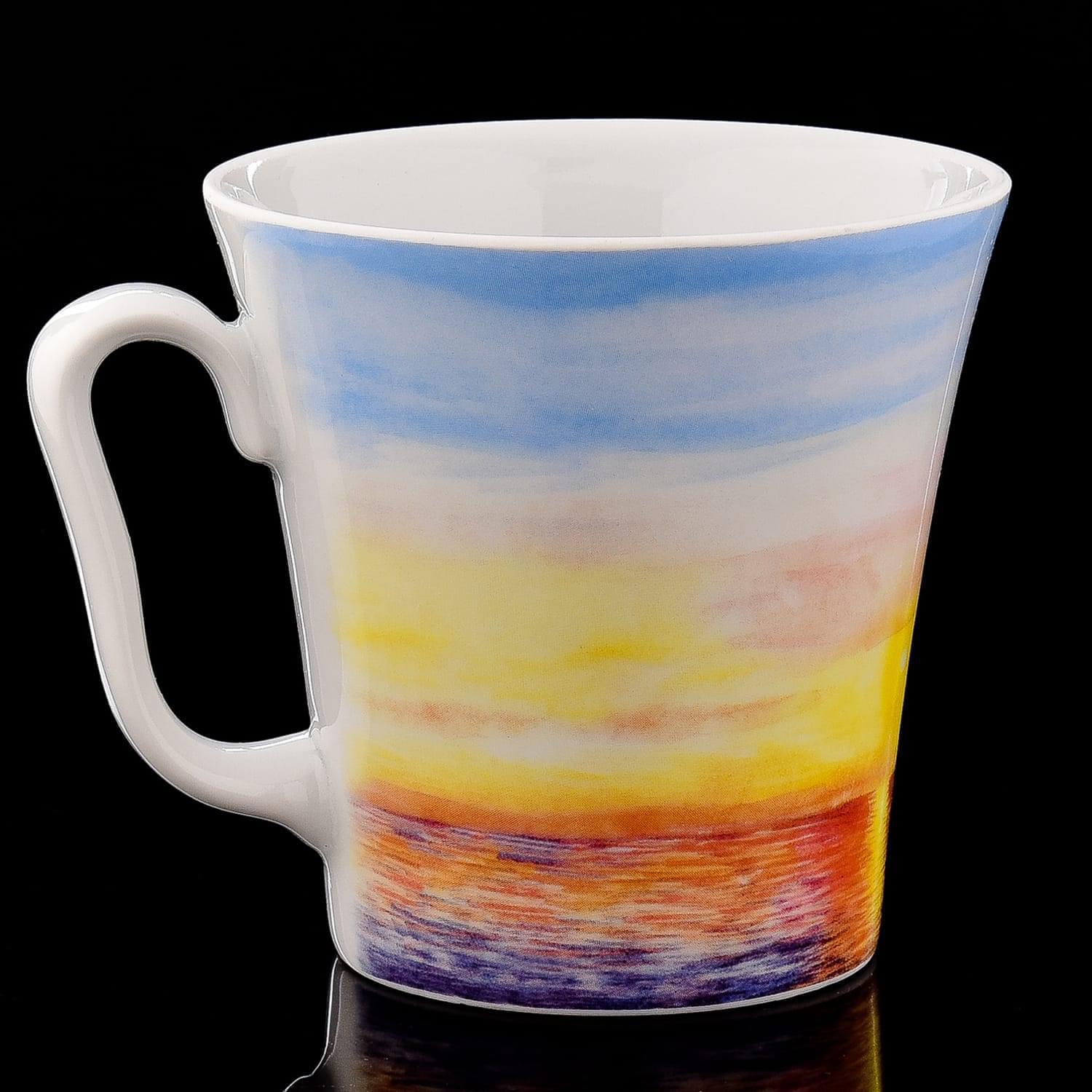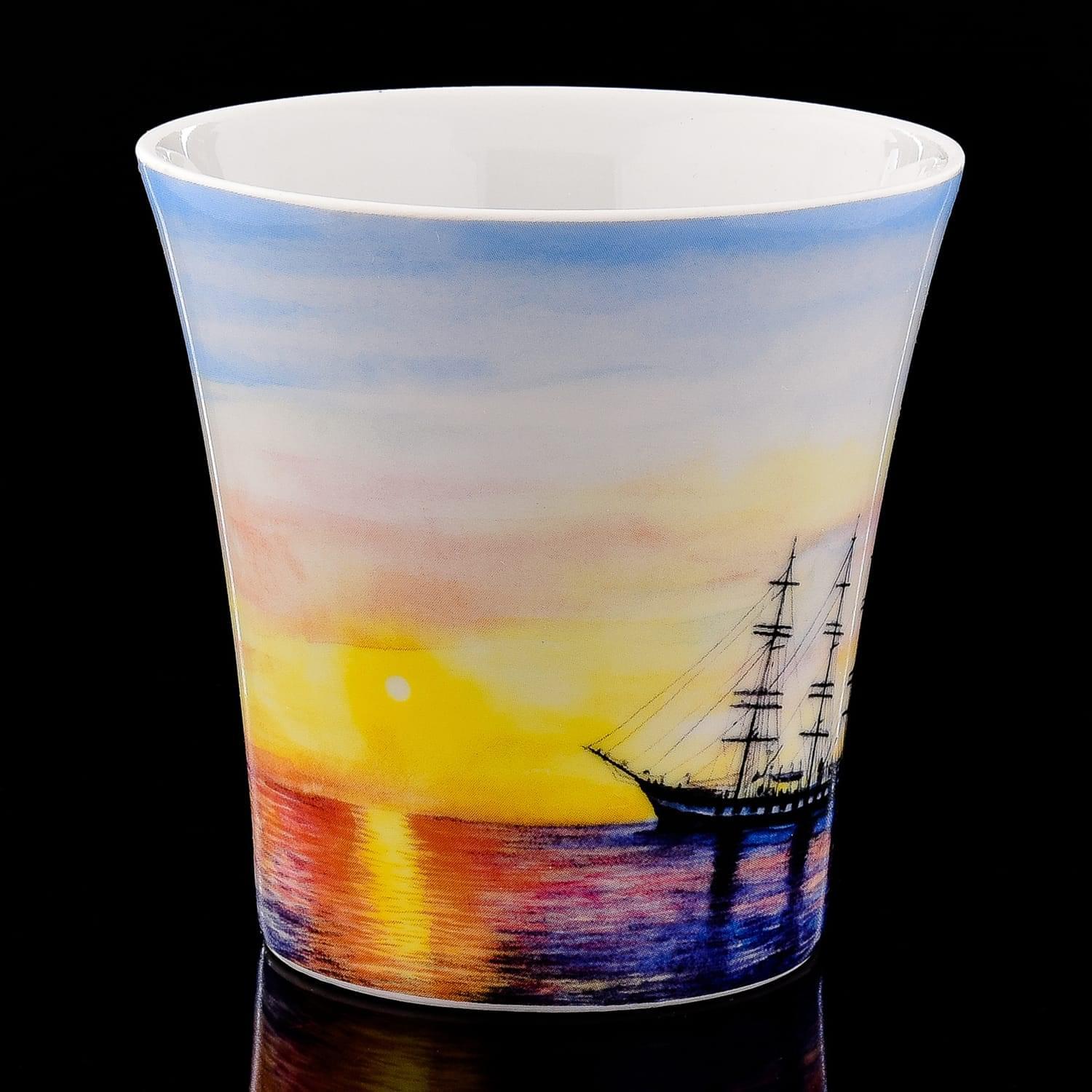 Фарфоровый бокал с блюдцем объемом 360 мл. изысканный, создан из твердого фарфора Императорского фарфорового завода.Рисунок придумал художник С.А. Грач, роспись сделана в технике деколь.