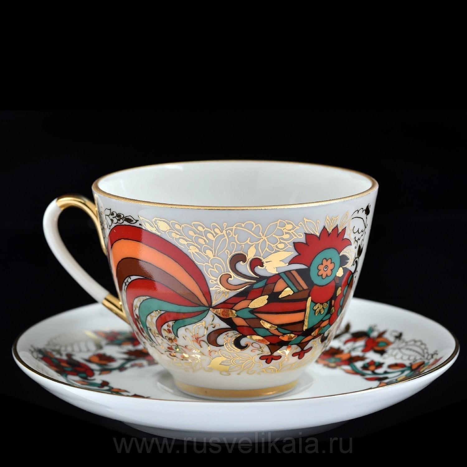 Чашка продается в наборе с блюдцем. Их корпуса оформлены из "русского белого золота", твердого фарфора в соответствии с формой "Весенняя". Поверхности корпусов украшены композициями с образом петуха. Петух - персонаж русских волшебных сказок. Образ этой птицы - символ Солнца и духовного возрождения. Роспись по поверхностям выполнена вручную. При декоре использована супер-краска на основе драгоценного металла.