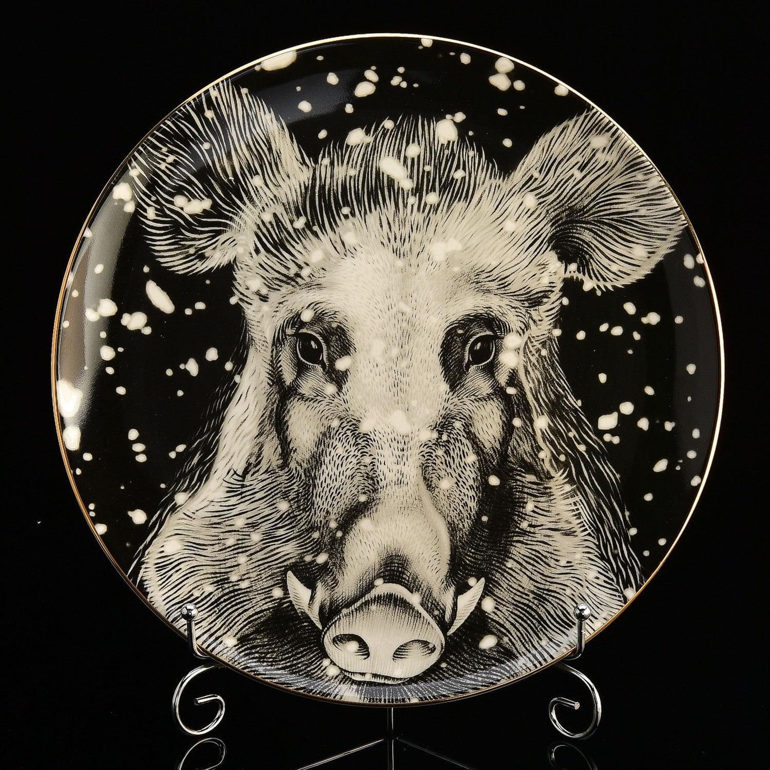Образ кабана - символ жизненной энергии и силы - украшает тарелку из "русского белого золота", фарфора.Декоративная тарелка - это классический элемент декора. Ее форма 100% гармонизирует пространство. Композиция на лицевой стороне тарелки создает мотивирующий акцент и позволяет удержать состояние радости.