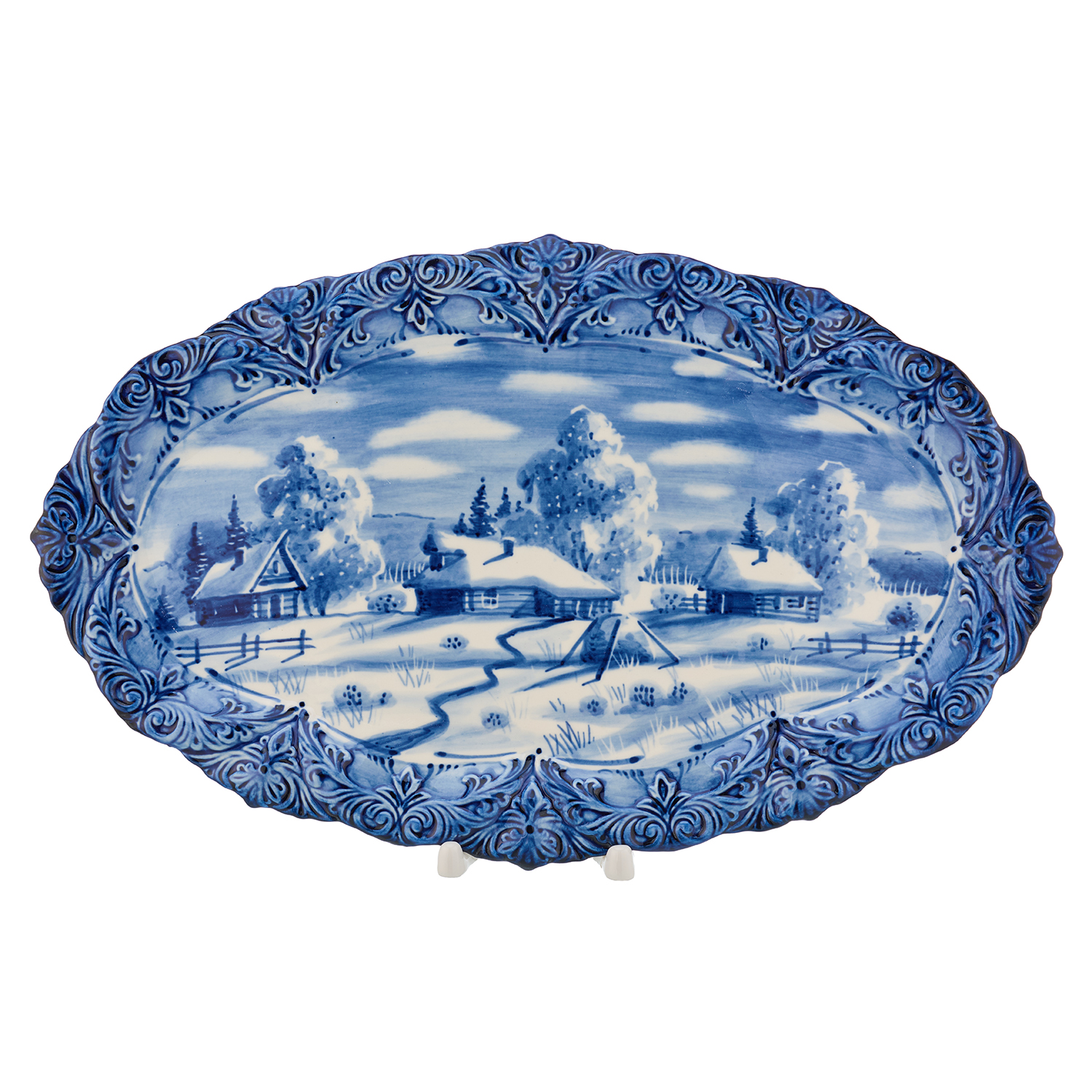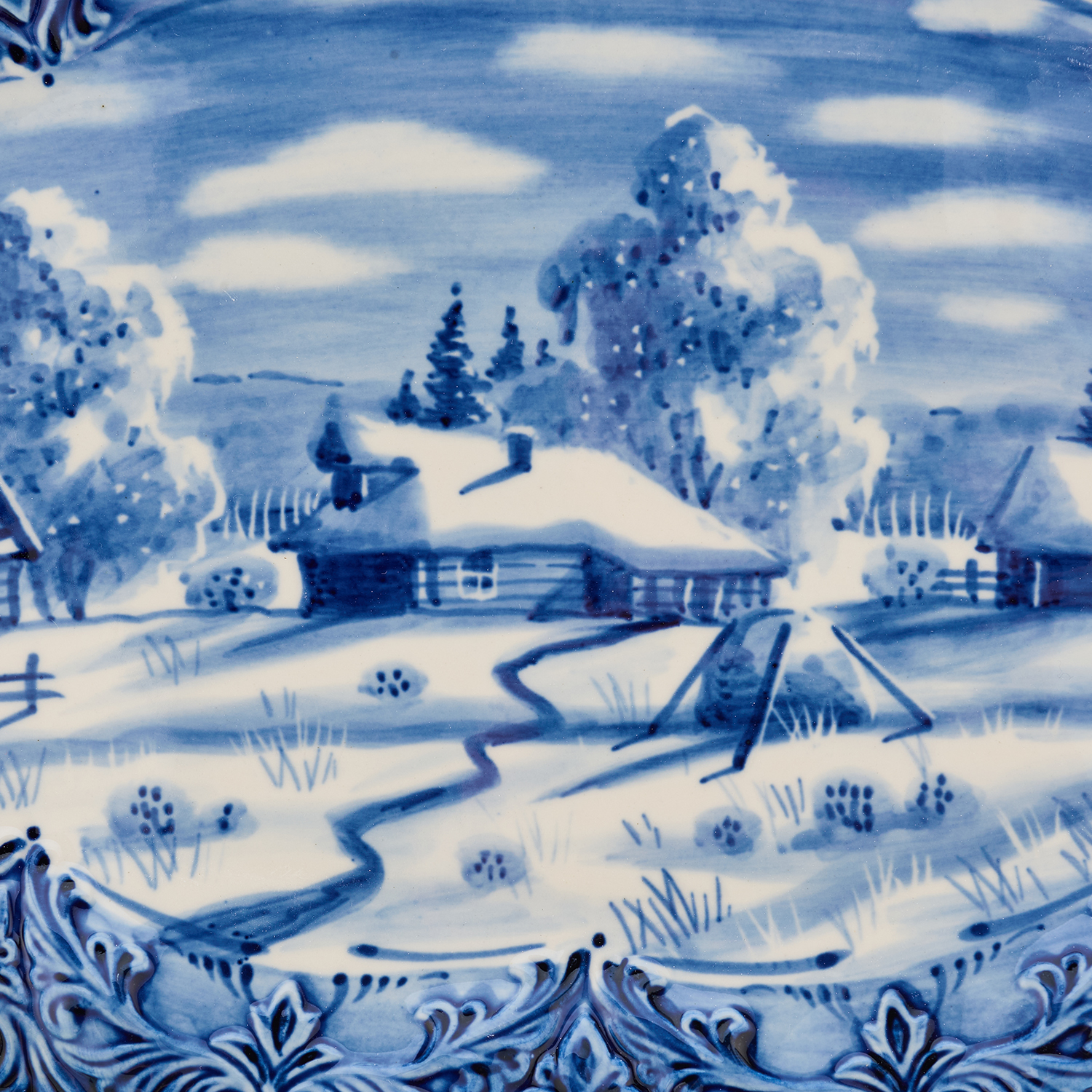 Русские подарки и сувениры → Интерьерные изделия → Декоративные тарелки → Тарелка декоративная "Зима в деревне". Гжель