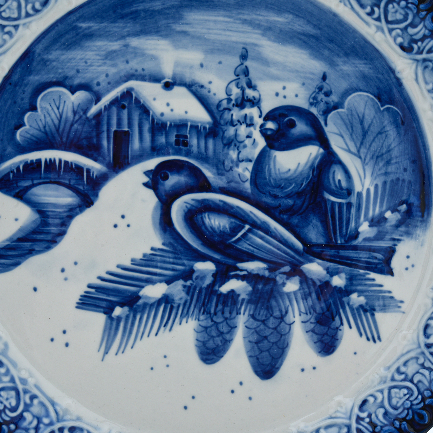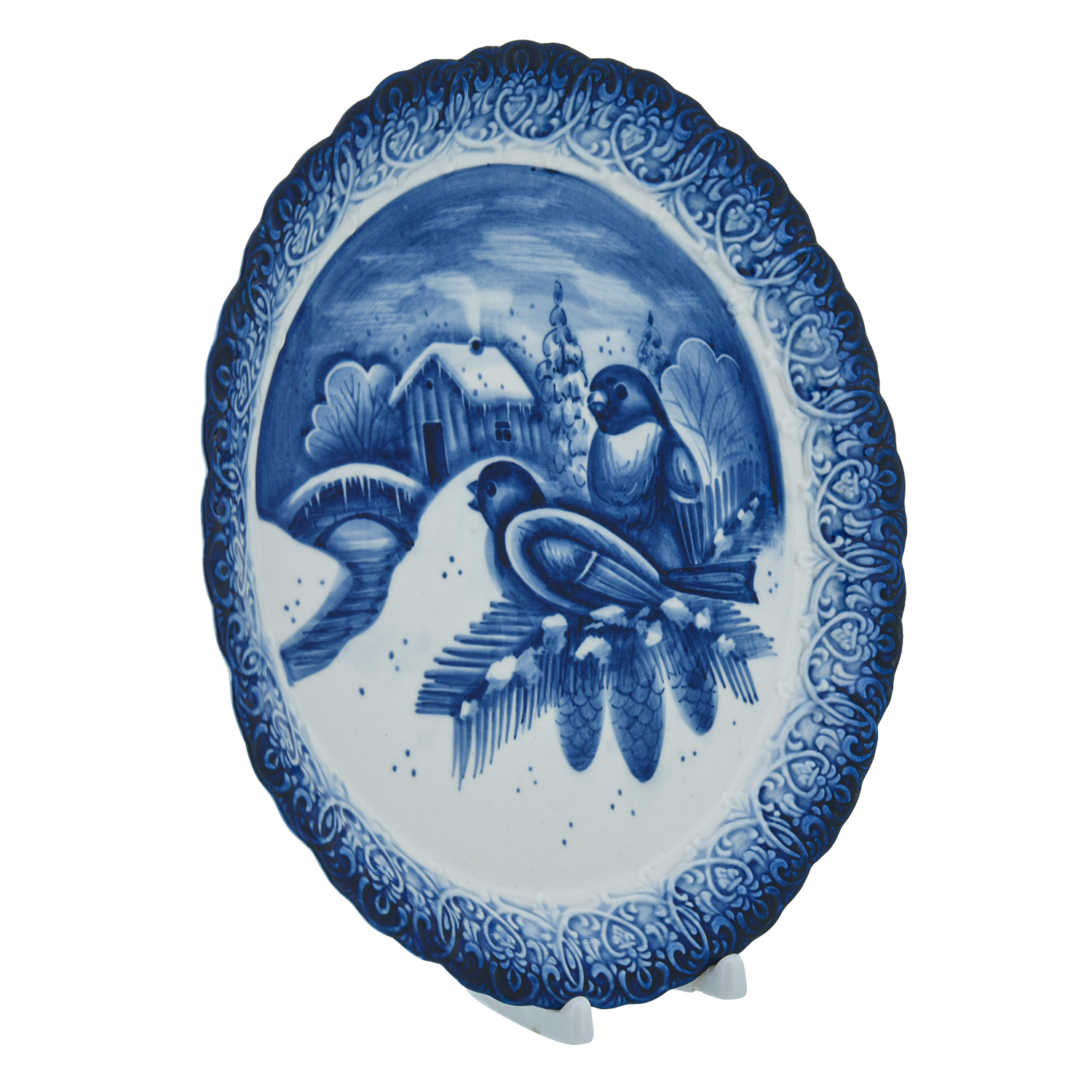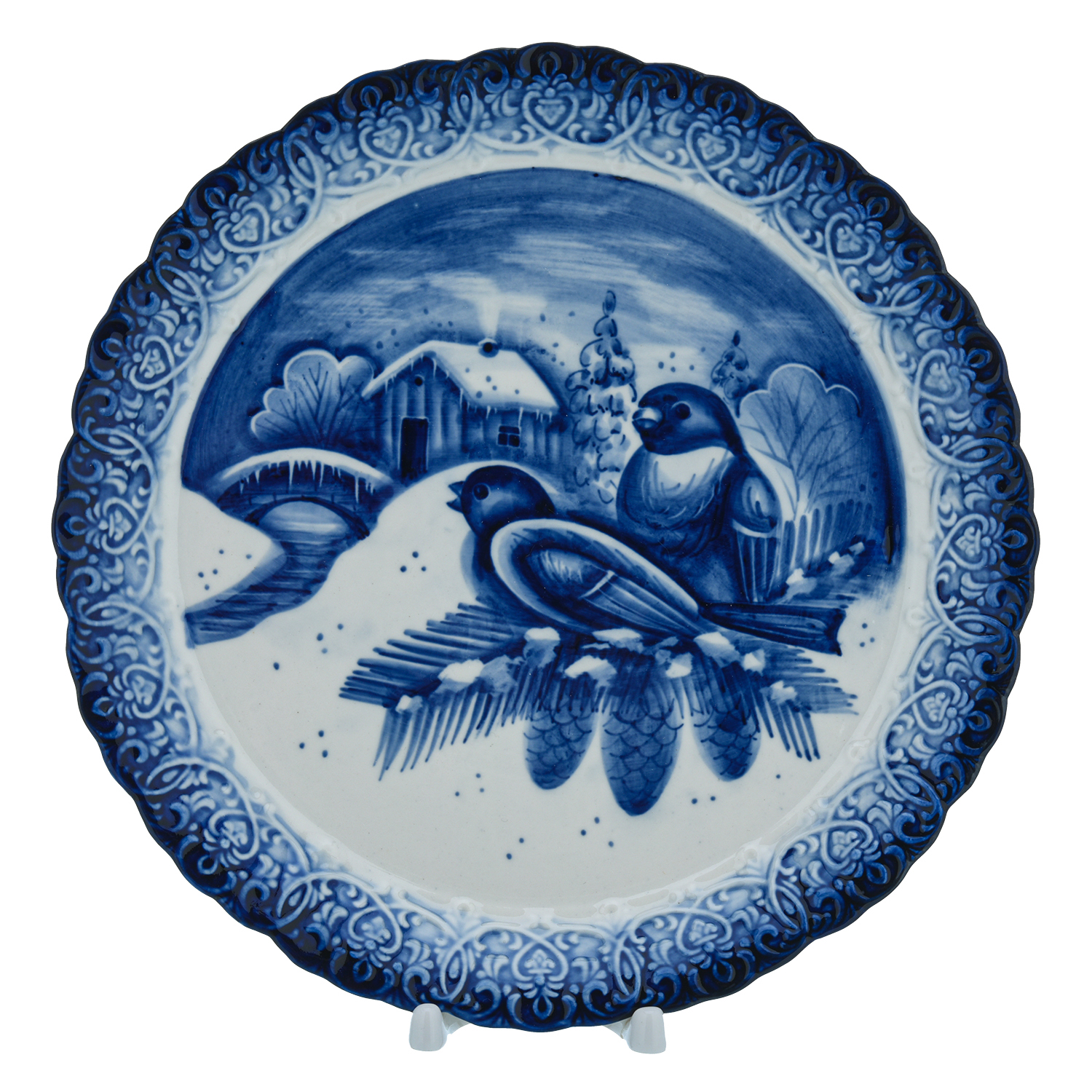Тарелка сувенирная настенная "Птицы снегири". Гжель