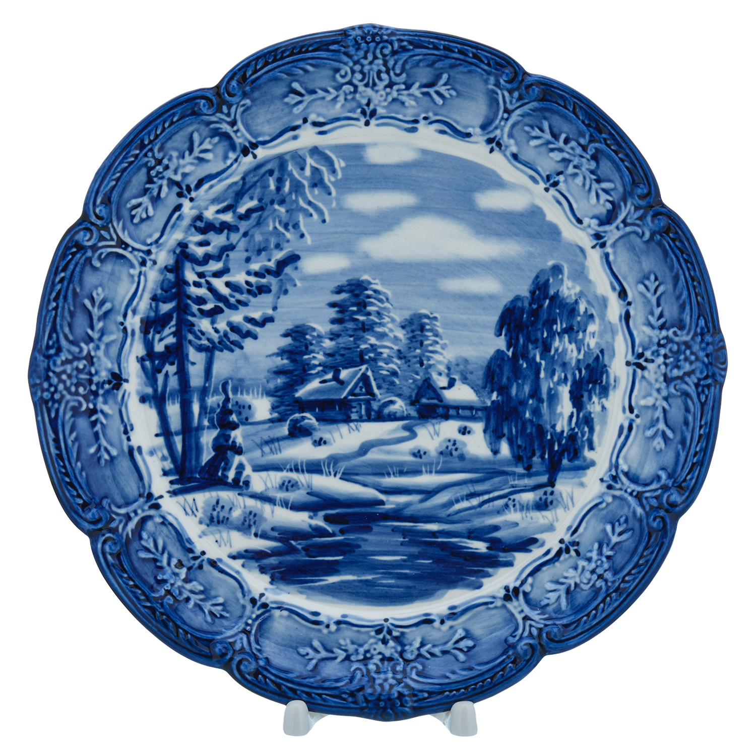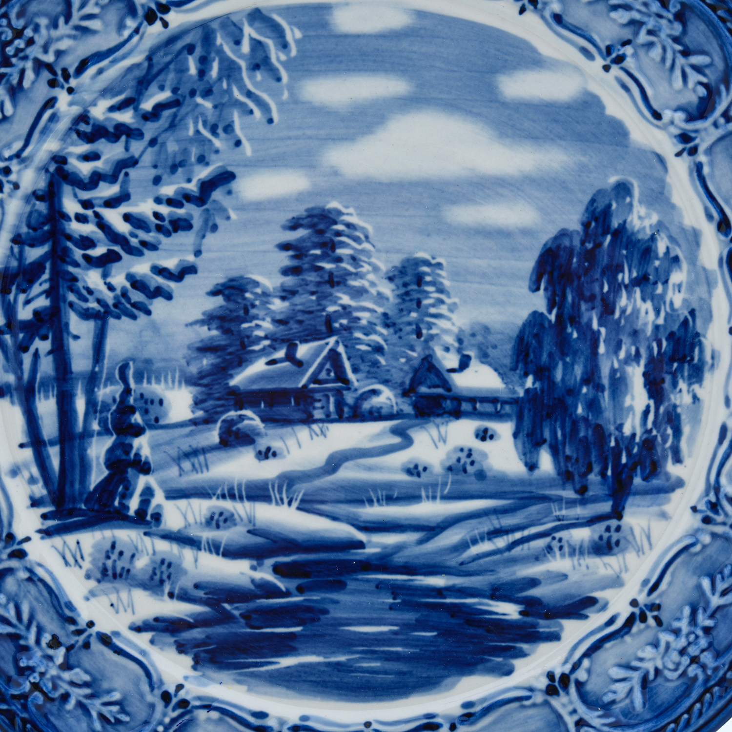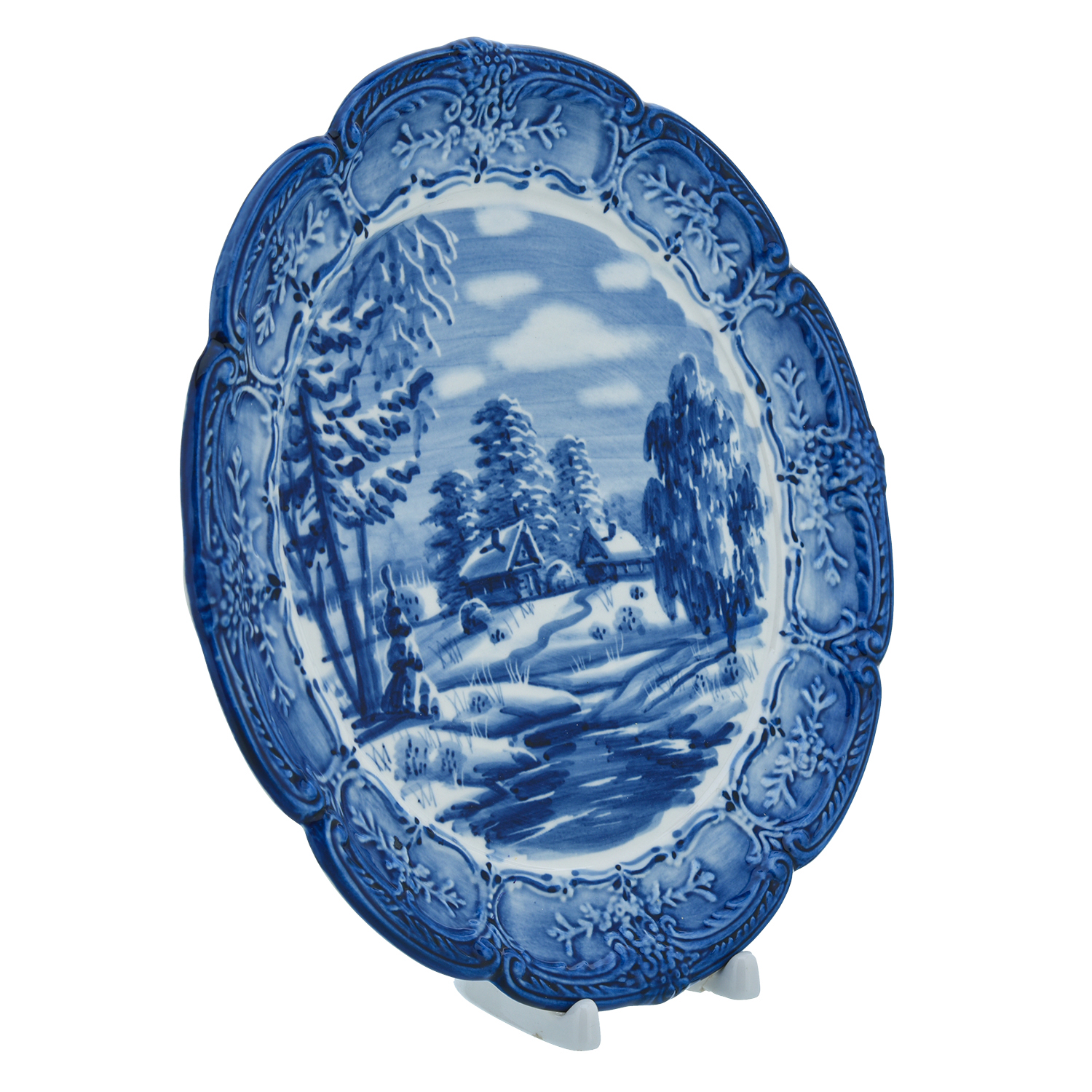 Русские подарки и сувениры → Интерьерные изделия → Декоративные тарелки → Тарелка сувенирная настенная "Зима в деревне". Гжель