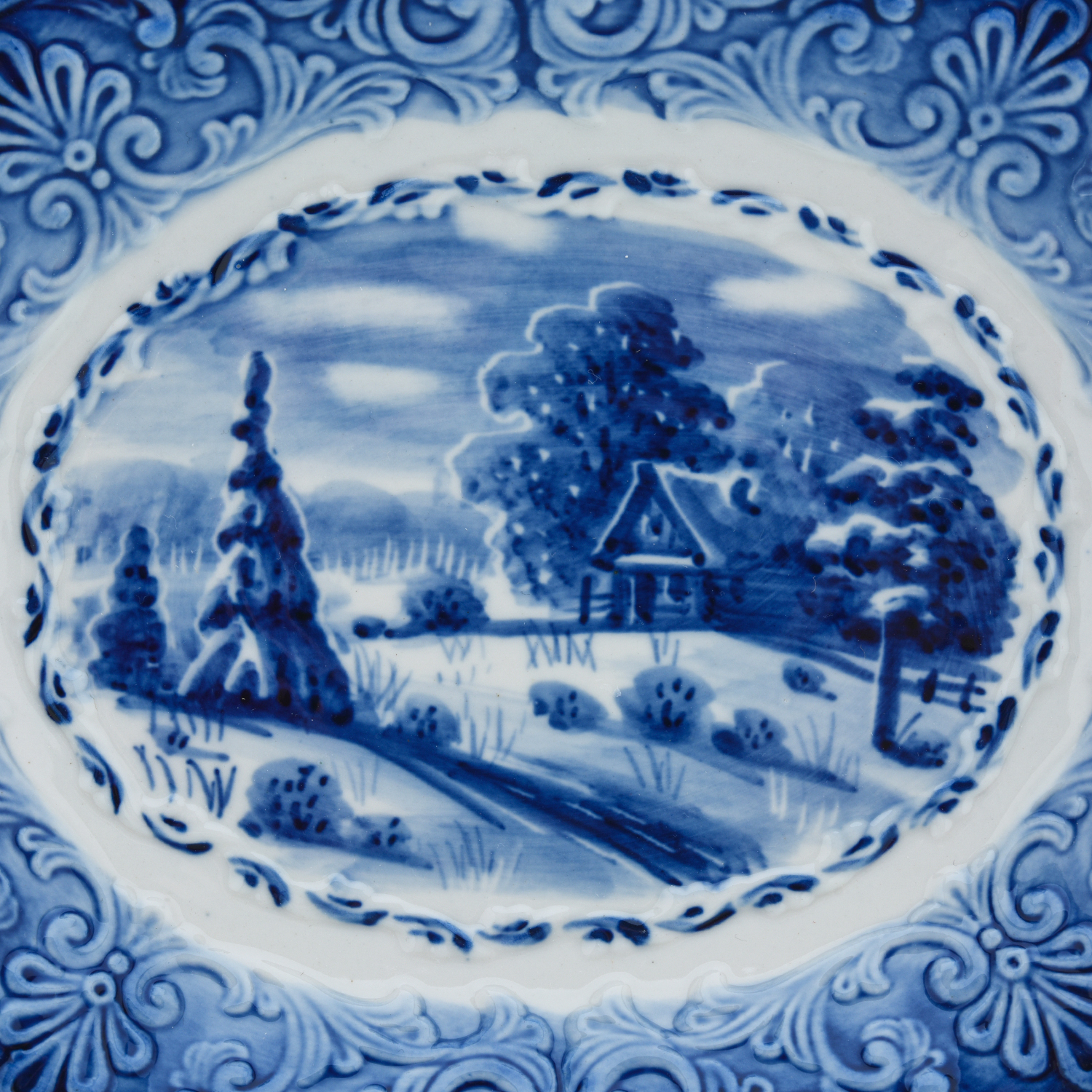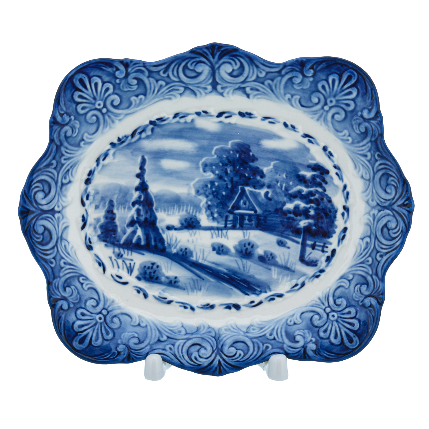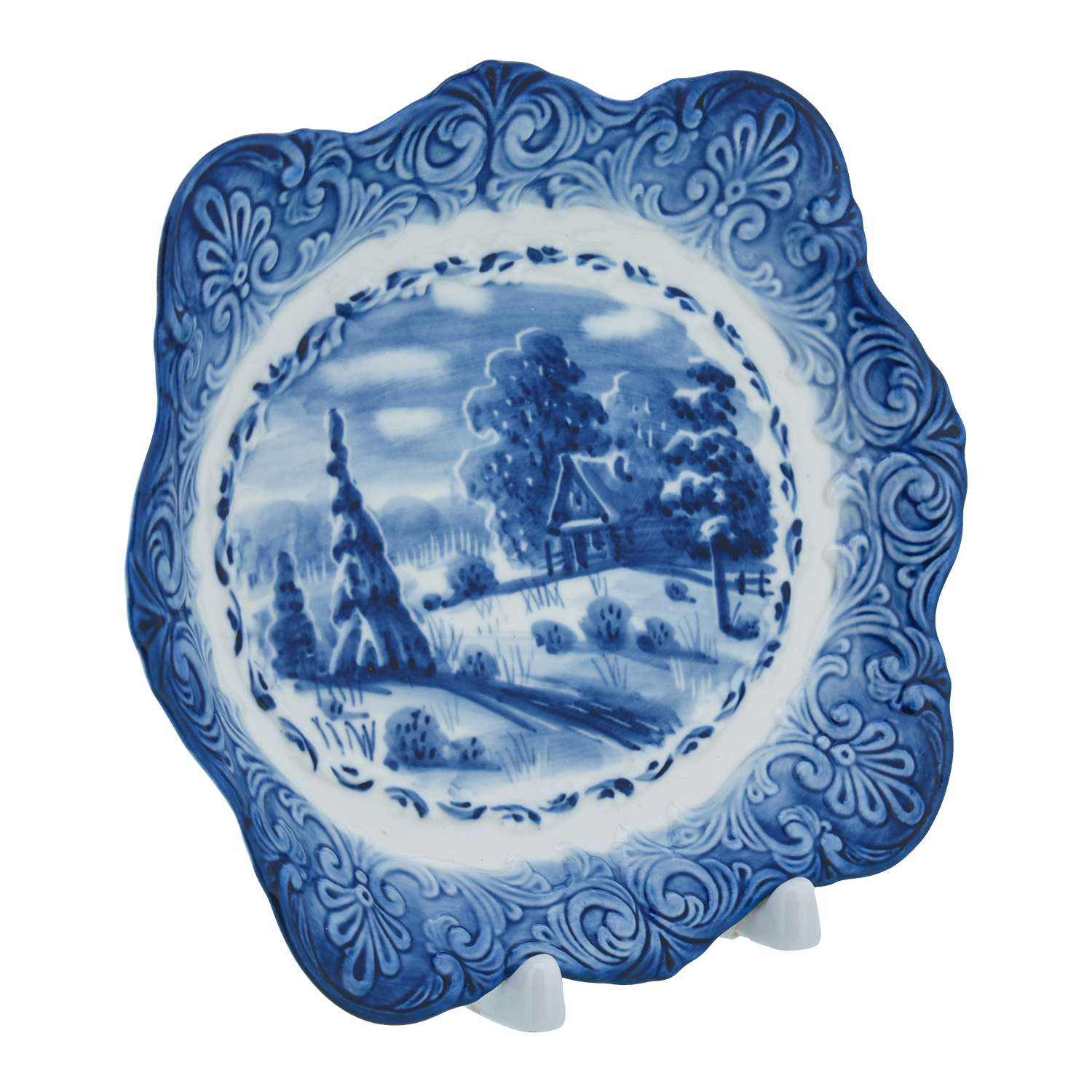 Русские подарки и сувениры → Интерьерные изделия → Декоративные тарелки → Тарелка сувенирная настенная "Зима в деревне". Гжель