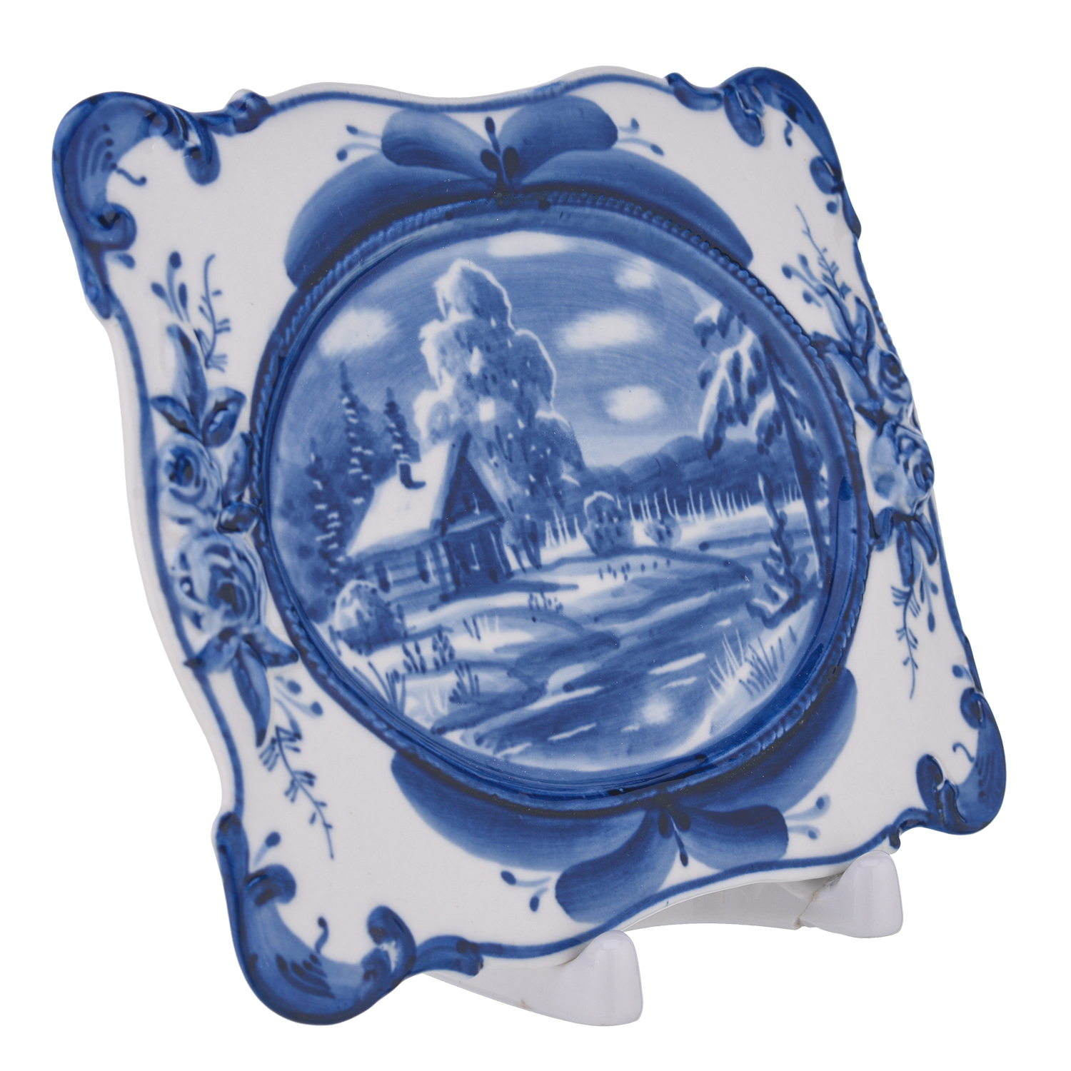 Тарелка декоративная "Зима в деревне". Гжель.Материал: фарфор.