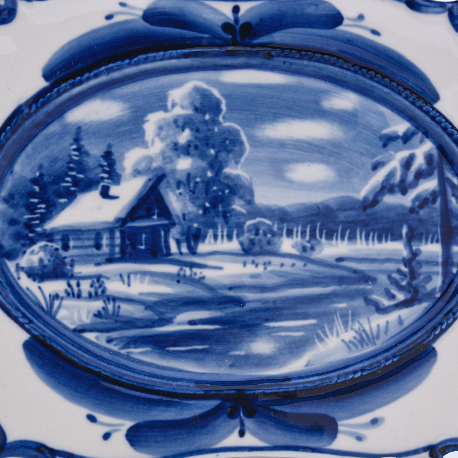 Тарелка декоративная "Зима в деревне". Гжель