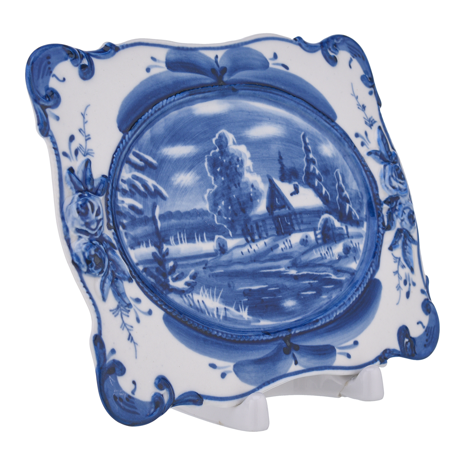 Тарелка декоративная "Зима в деревне". Гжель.Материал: фарфор.