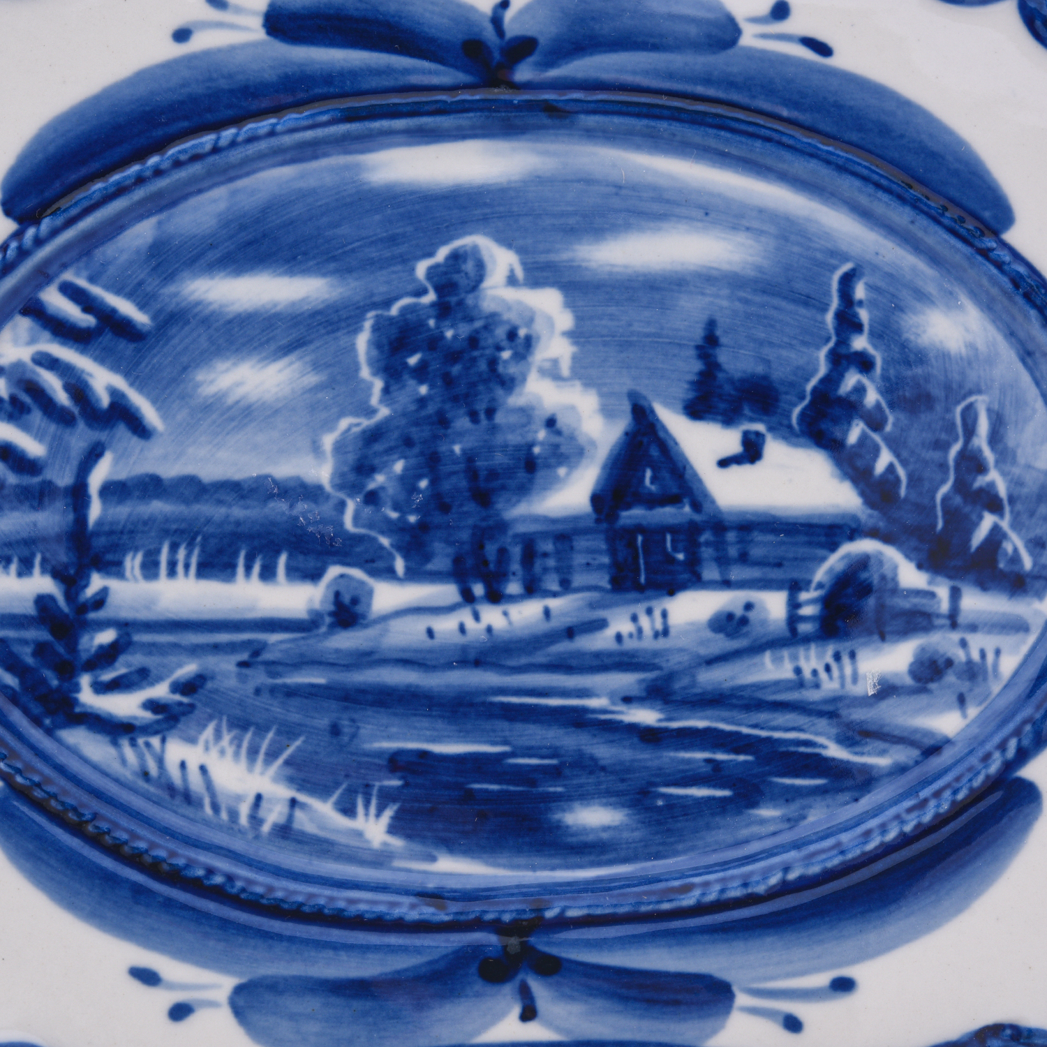 Тарелка декоративная "Зима в деревне". Гжель