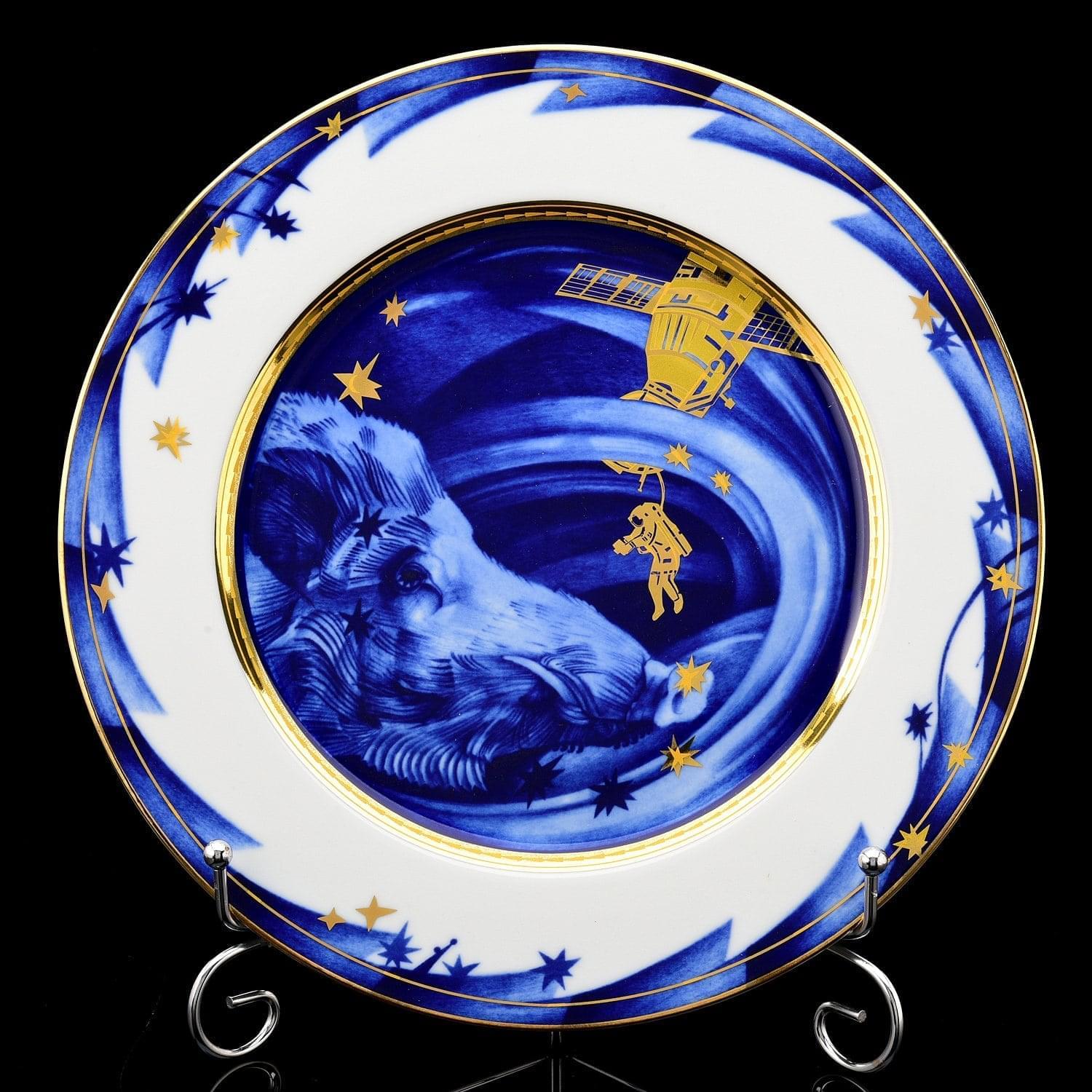 Тема природы и охоты полно и ярко отражены в творчестве Нелли Петровой, главного художника Императорского фарфорового завода. В ее работах часто встречается, например, кабан.Нелли Львовна против реалистичного образа охоты, ей ближе фантастические идеи, воплощенные в фарфоре. На изделии волшебным способом звезды превращаются в дикое животное. Золоченный орнамент, словно вспышка светового потока, покрывает кобальтовые просторы Вселенной, а пролетающий мимо астронавт фиксирует на камеру уникальное природное явление. Для росписи использованы классические кобальт и золото, которые оживают благодаря Петровой - декоративная композиция производит праздничное и восторженное впечатление.