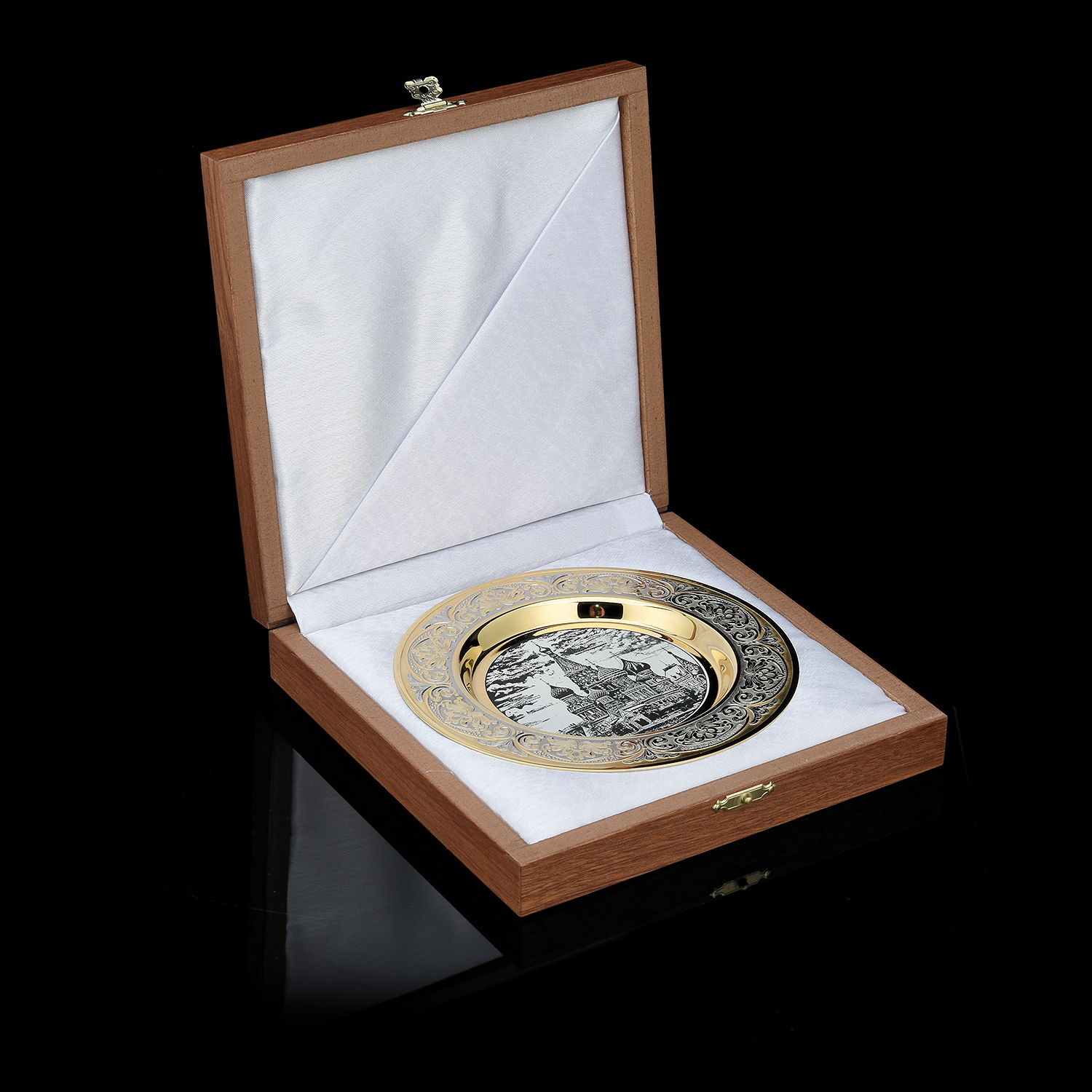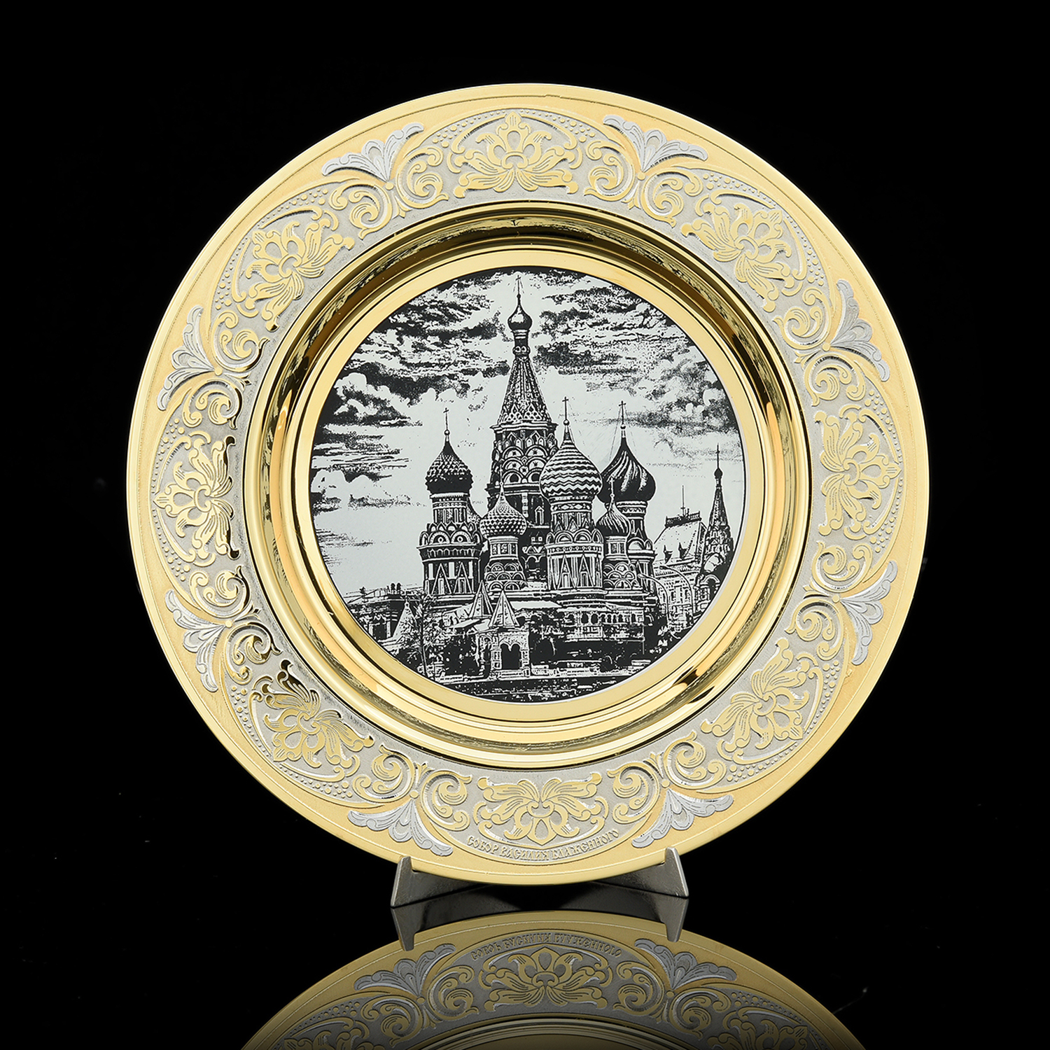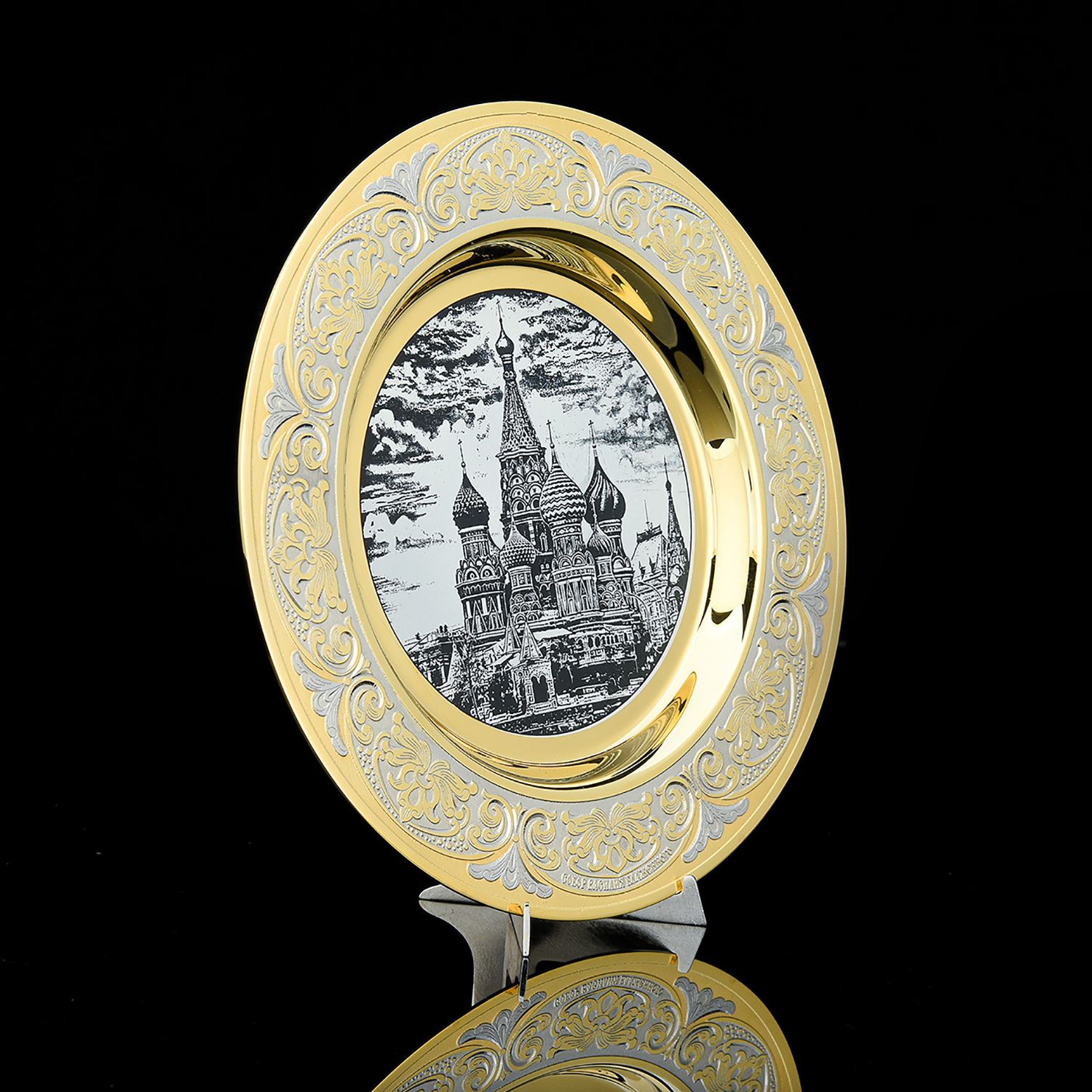 Декоративная тарелка "Храм Василия Блаженного". Златоуст.Материалы: латунь, никель, золото 999,9*, чернение.