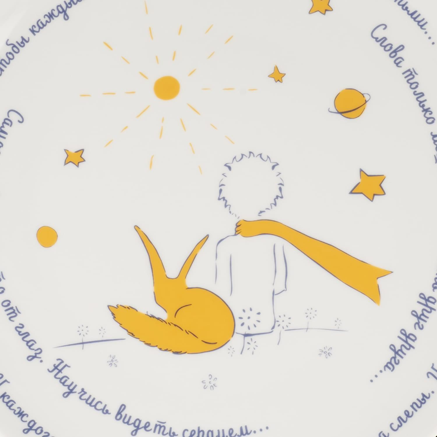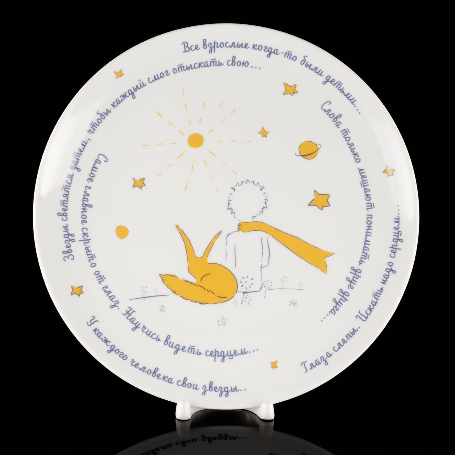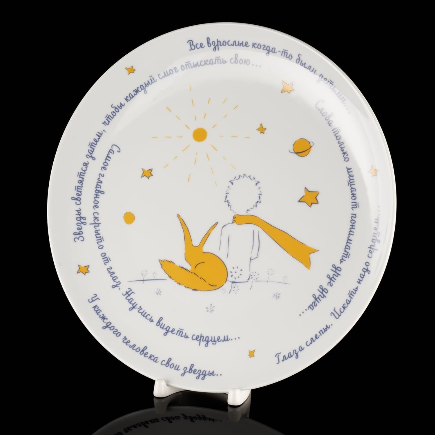 Идея тарелки навеяна мудростью «человечной» притчи французского писателя Антуана де Сент-Экзюпери, просто и пронзительно рассказывающей о дружбе, любви, долге, верности, красоте и нетерпимости к злу. «Все мы родом из детства», - напоминает автор. А еще призывать жить, «искать сердцем», так как «глаза слепы». Его сказка для взрослых получилась легкой и доброй, несмотря на нотки грусти и недетской глубины. Персонажи имеют реальных прототипов. Принца Антуан «списал» с маленького себя, Лиса - с близкой подруги, Розу - с капризной и чувствительной как садовая роза супруги. Иллюстрации подготовил сам Экзюпери: мальчика с желтой шевелюрой; милых барашка и слоненка; лиса с острыми, похожими на заячьи ушами. Из популярных цитат: «У каждого человека свои звезды...». «Слова только мешают понимать друг друга...». «Вот мой секрет, он очень прост: зорко одно лишь сердце. Самого главного глазами не увидишь». «Слова только мешают понимать друг друга». «Самое главное скрыто от глаз. Научись видеть сердем...». ....