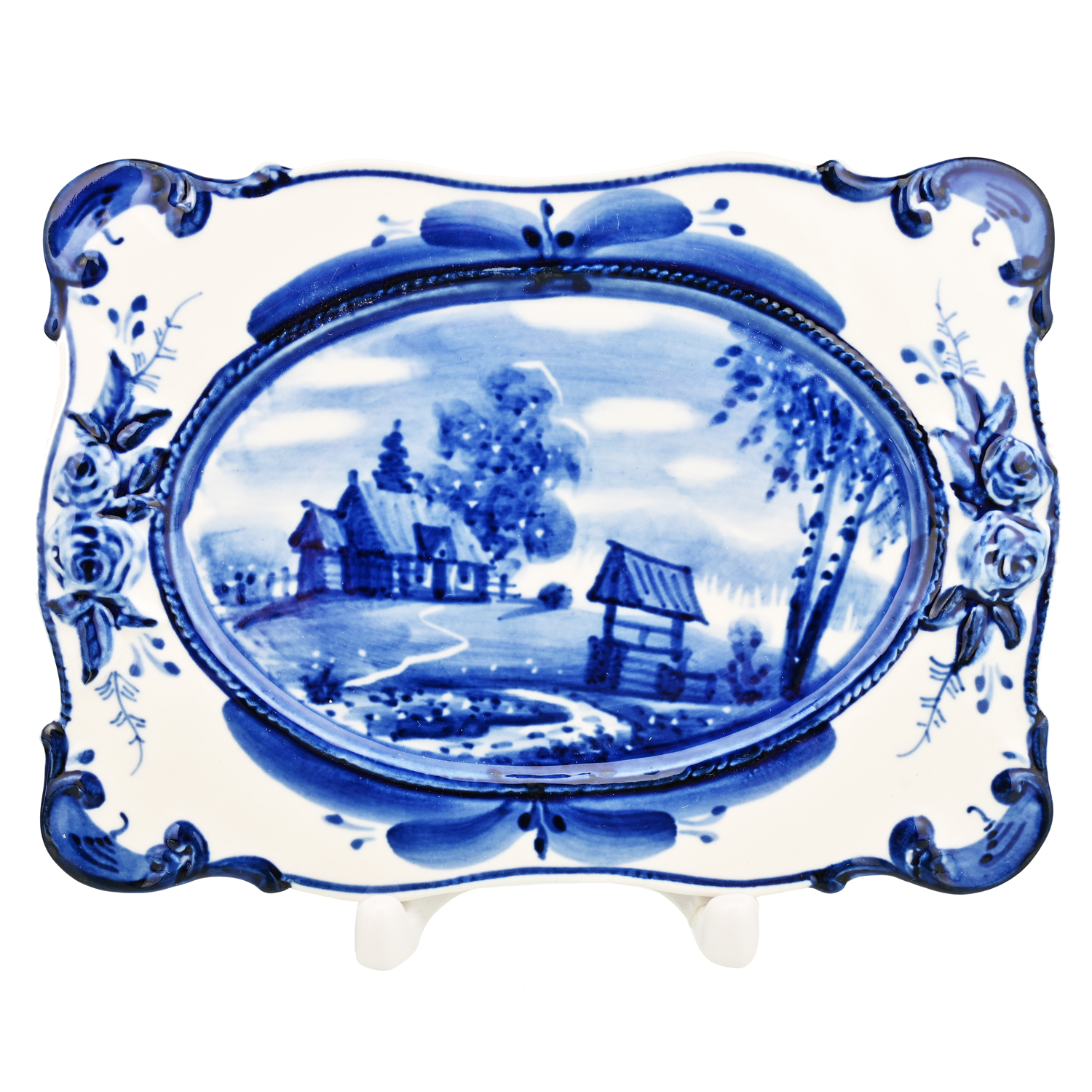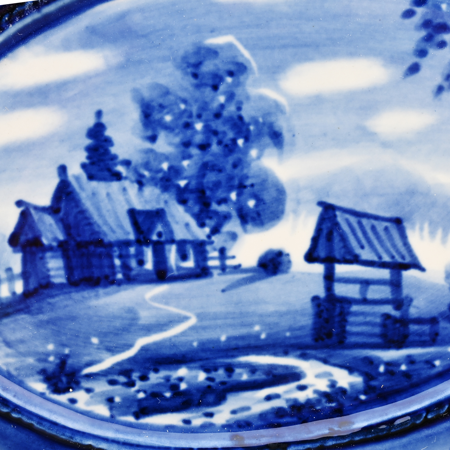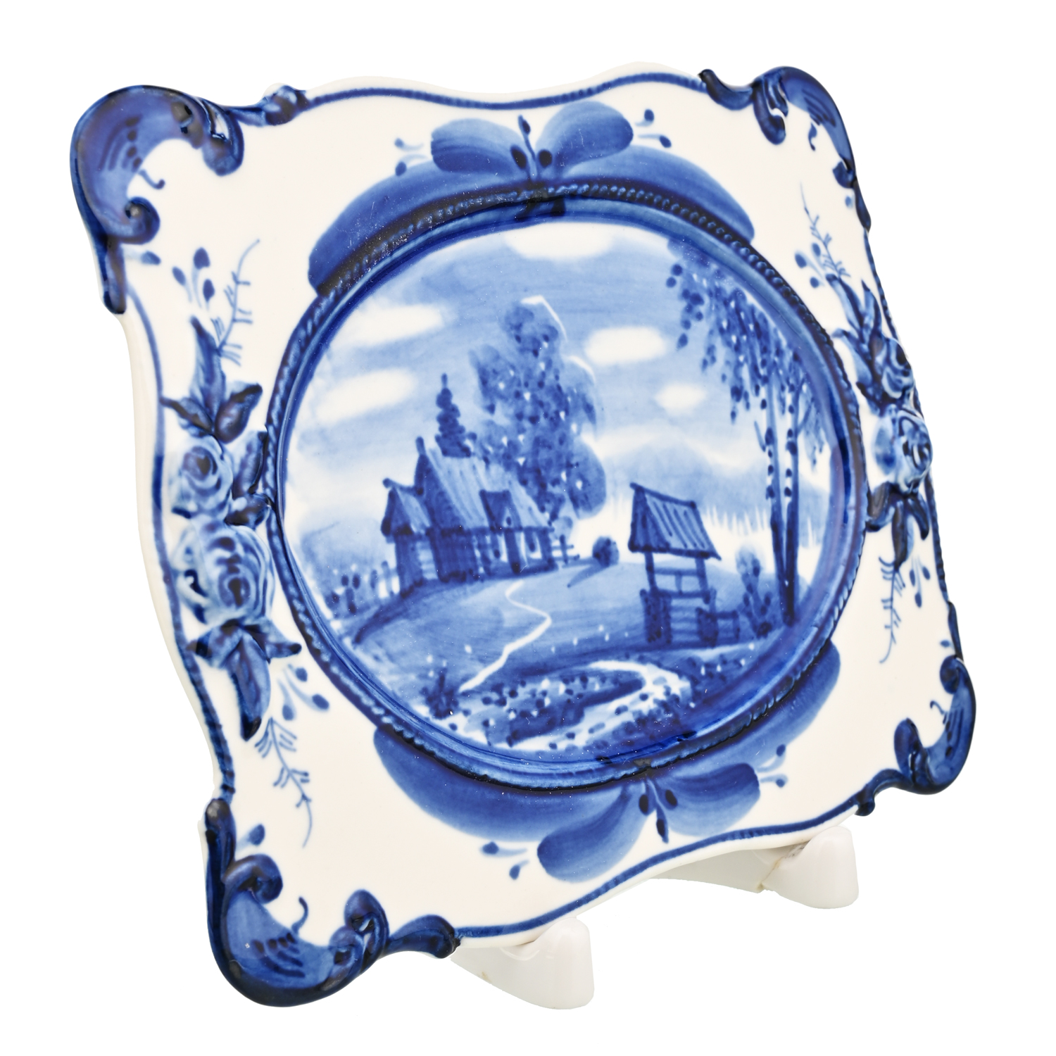 Русские подарки и сувениры → Интерьерные изделия → Декоративные тарелки → Тарелка декоративная с росписью "Лето в деревне". Гжель