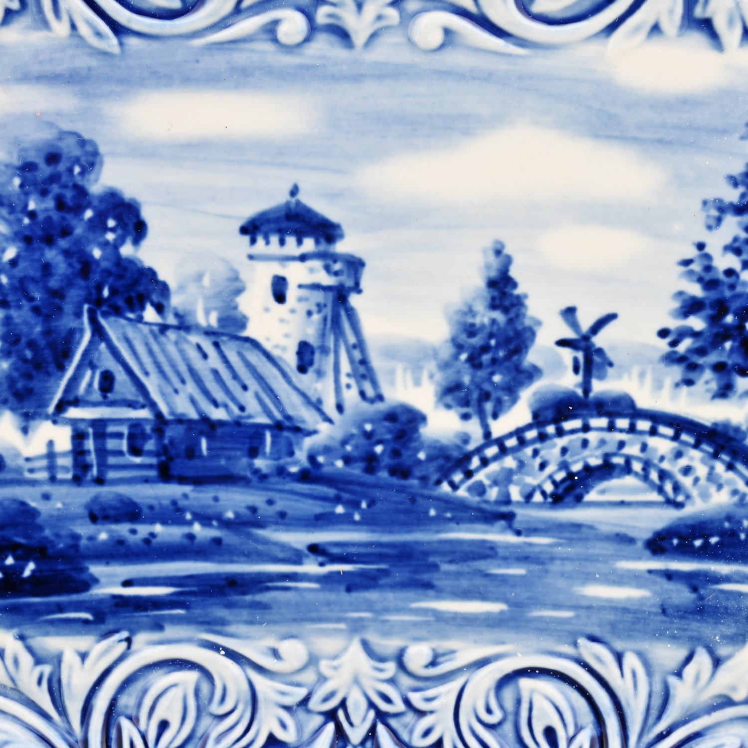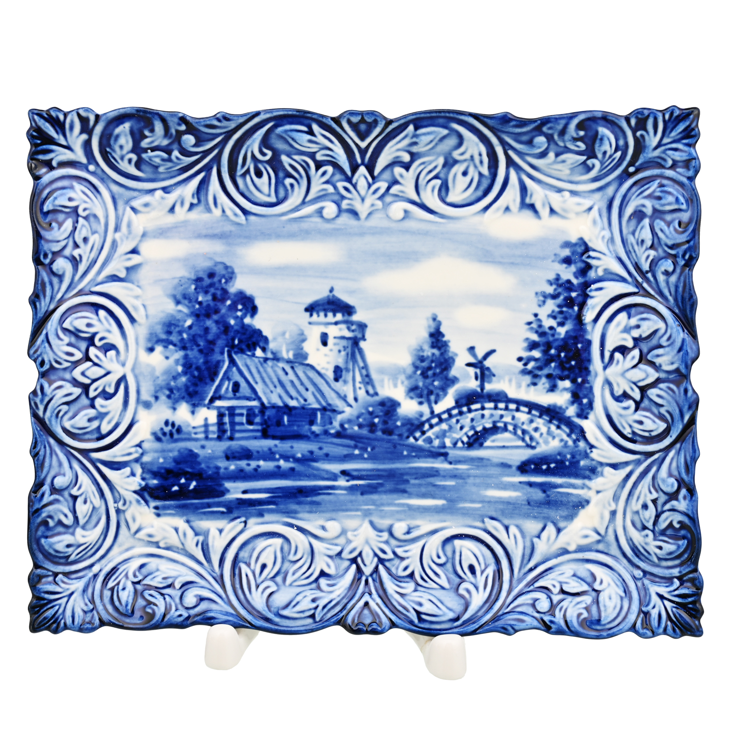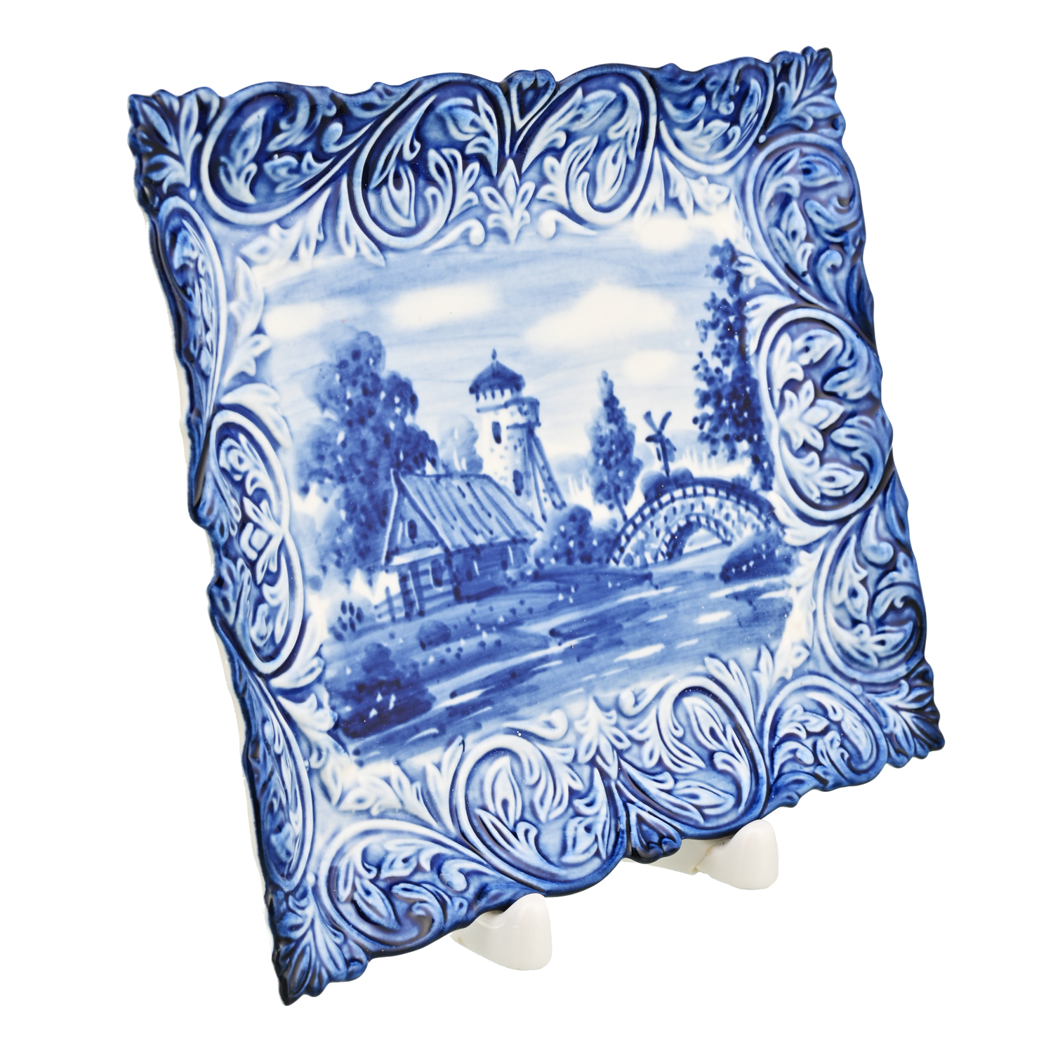 Тарелка декоративная с росписью "Мельница". Гжель