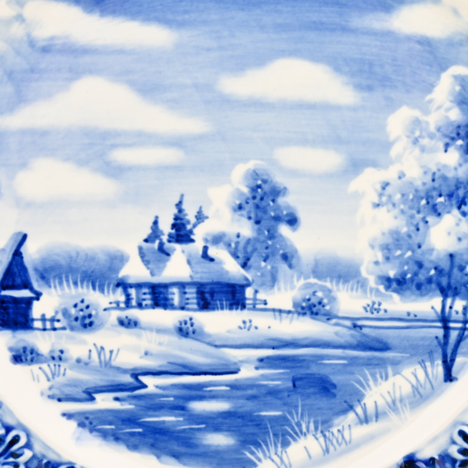 Русские подарки и сувениры → Интерьерные изделия → Декоративные тарелки → Тарелка декоративная с росписью "Зима в деревне". Гжель