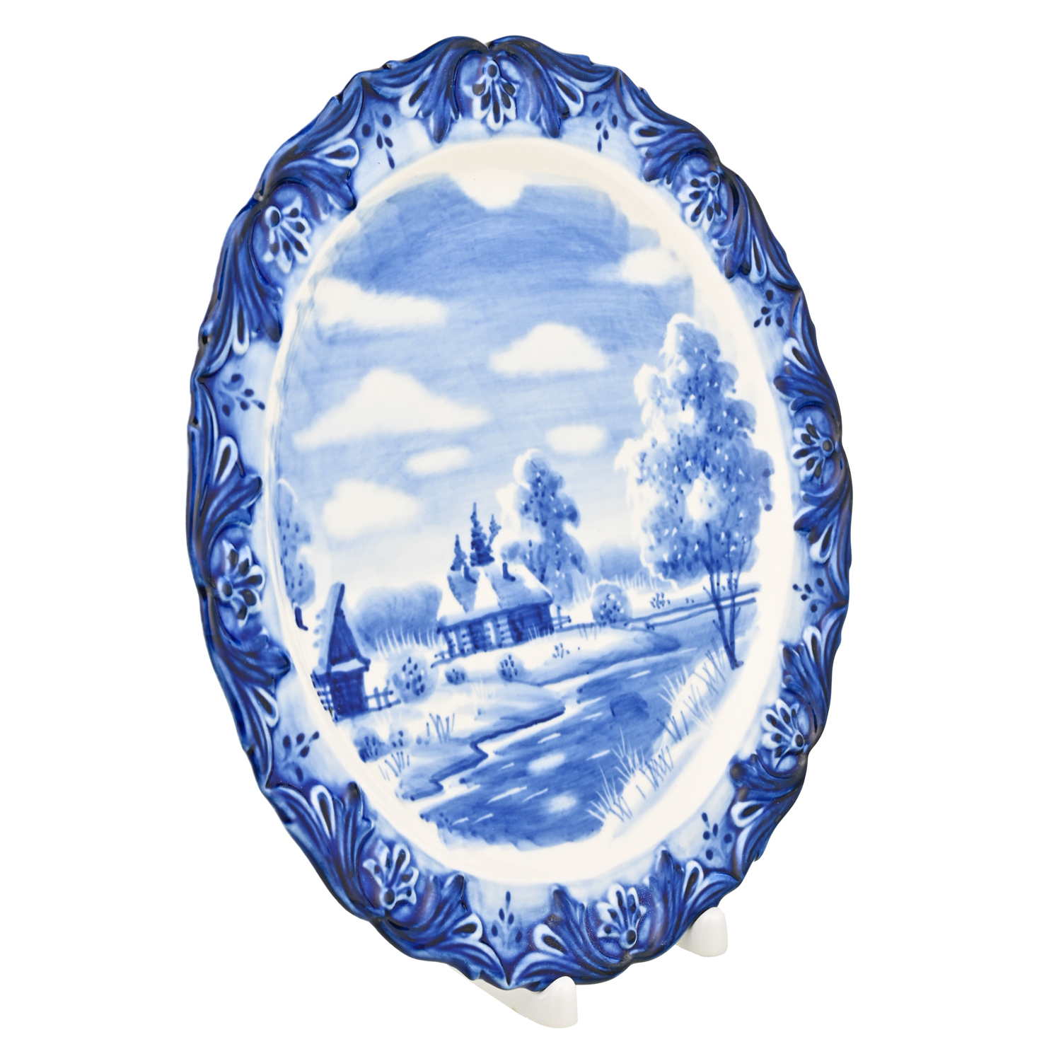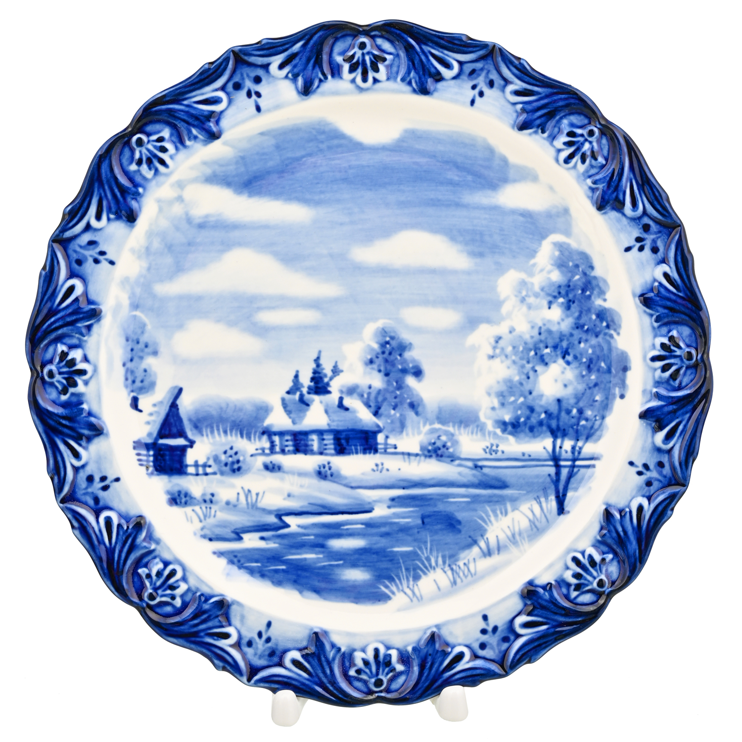 Тарелка декоративная с росписью "Зима в деревне". Гжель