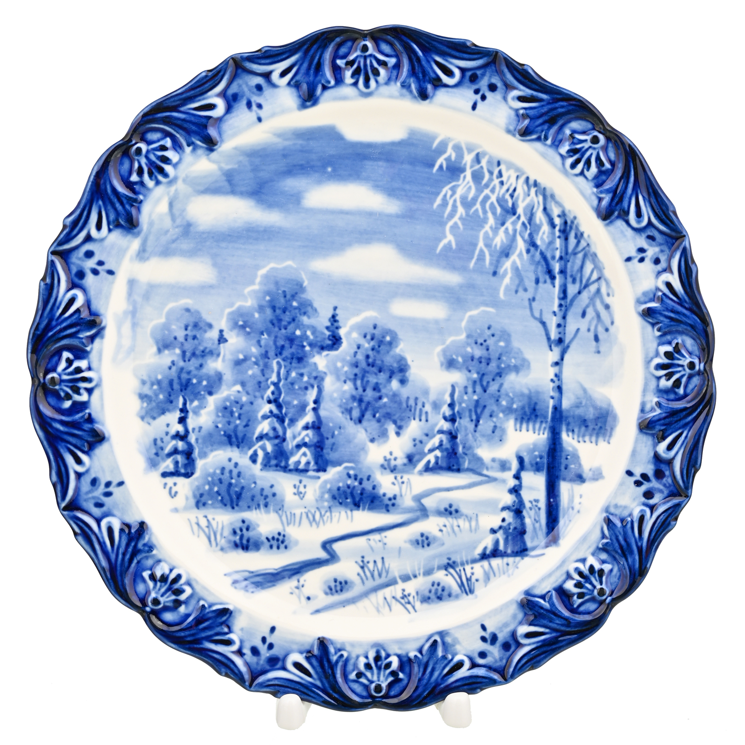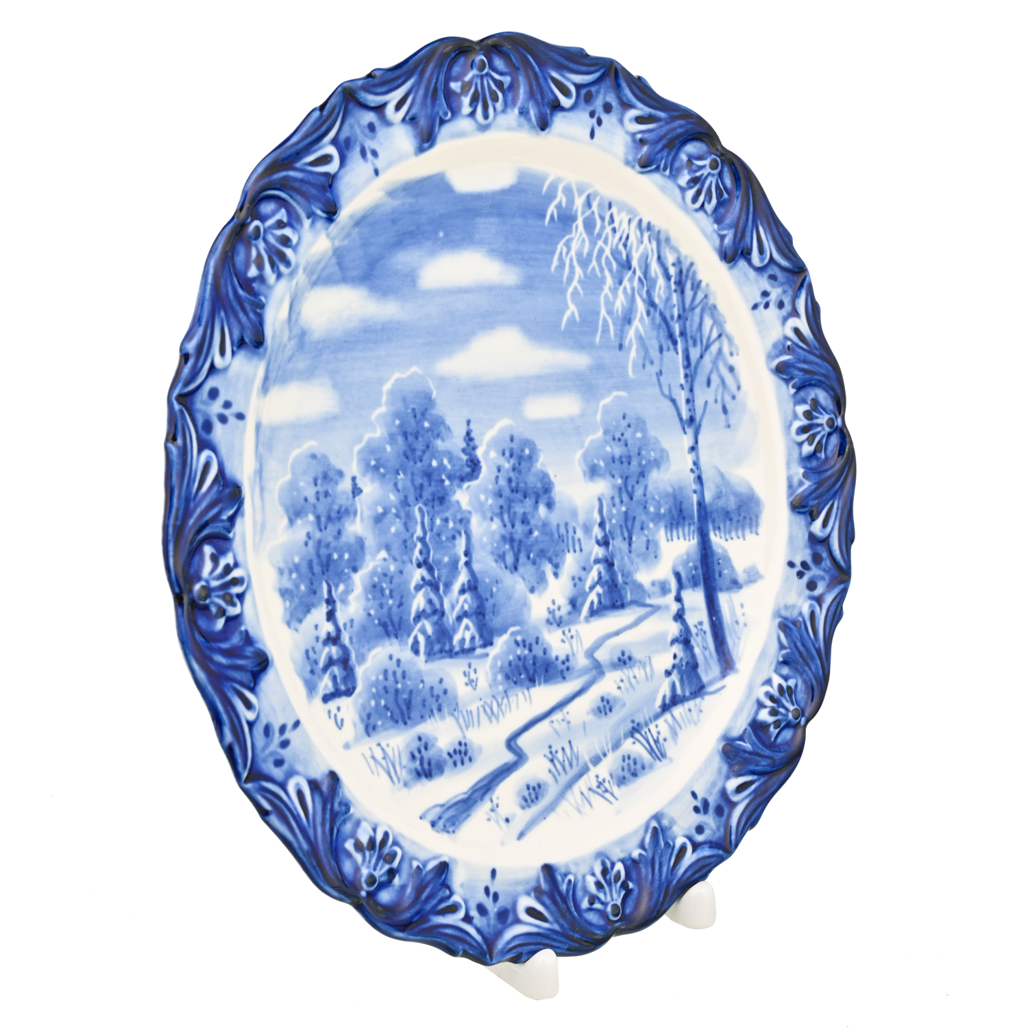 Тарелка декоративная с росписью "Зимний пейзаж". Гжель.