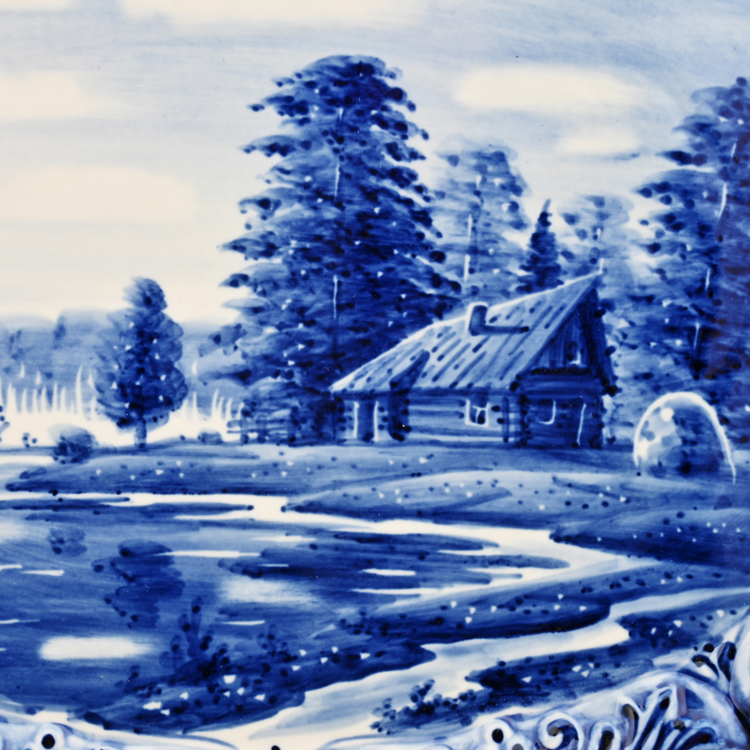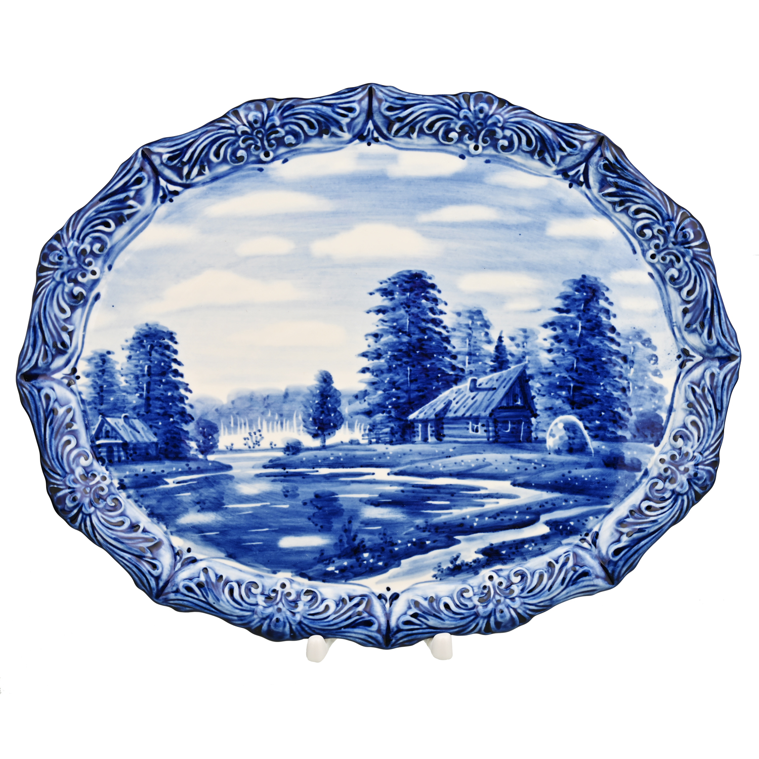 Русские подарки и сувениры → Интерьерные изделия → Декоративные тарелки → Тарелка декоративная с росписью "Лето в деревне". Гжель