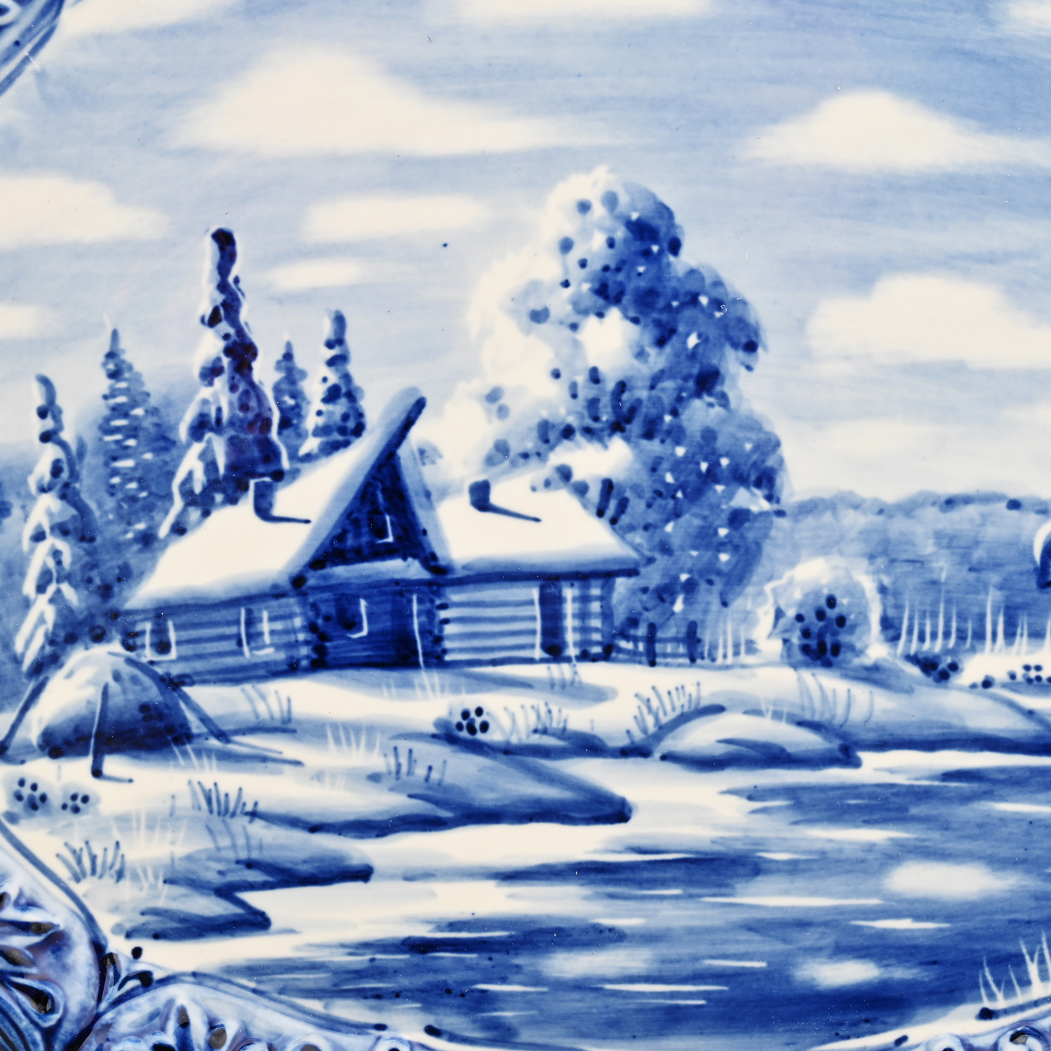 Русские подарки и сувениры → Интерьерные изделия → Декоративные тарелки → Тарелка декоративная с росписью "Зима в деревне". Гжель