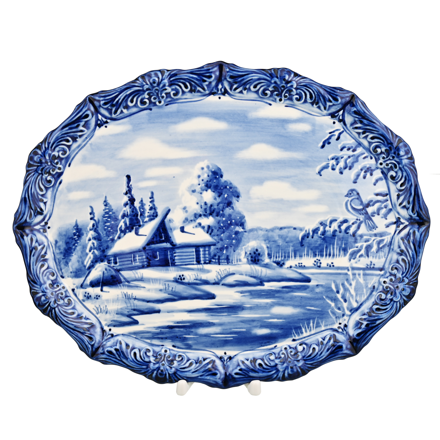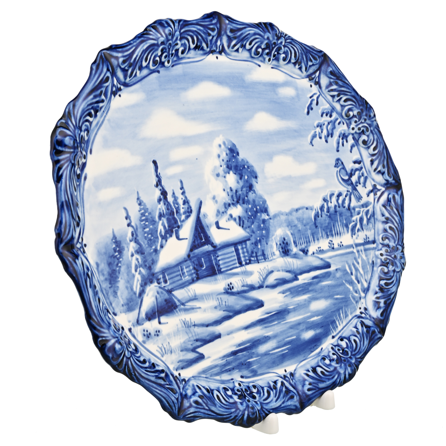 Тарелка декоративная с росписью "Зима в деревне". Гжель