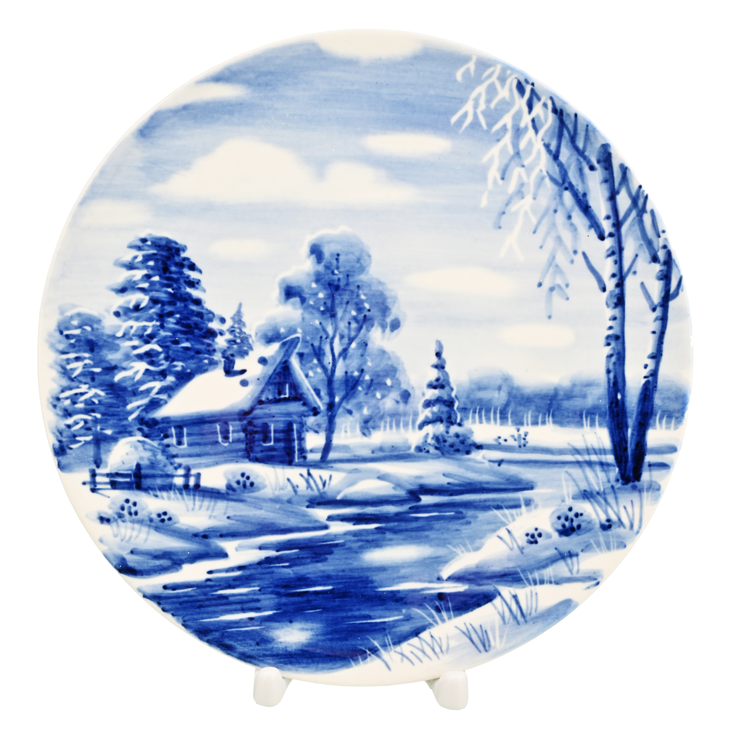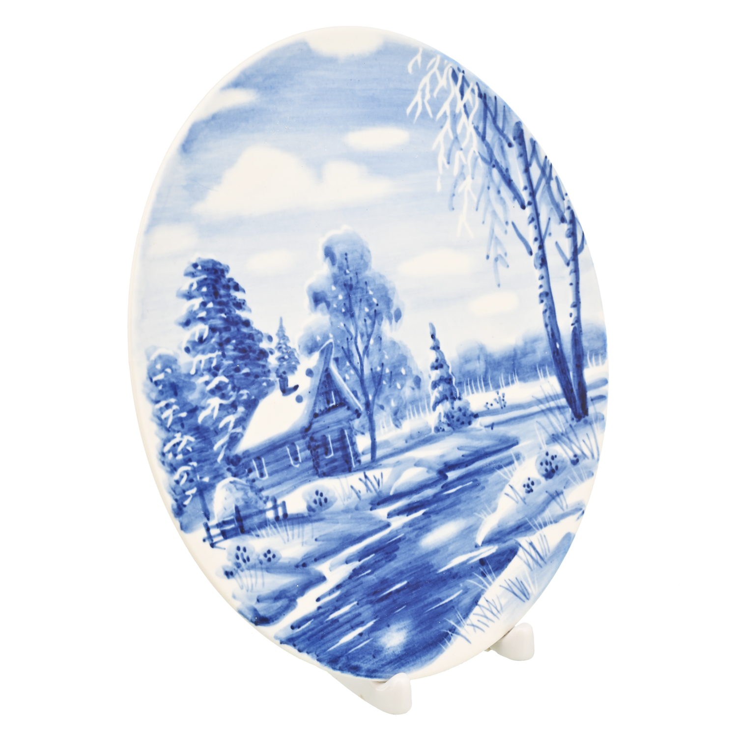 Тарелка декоративная с росписью "Зима в деревне". Гжель