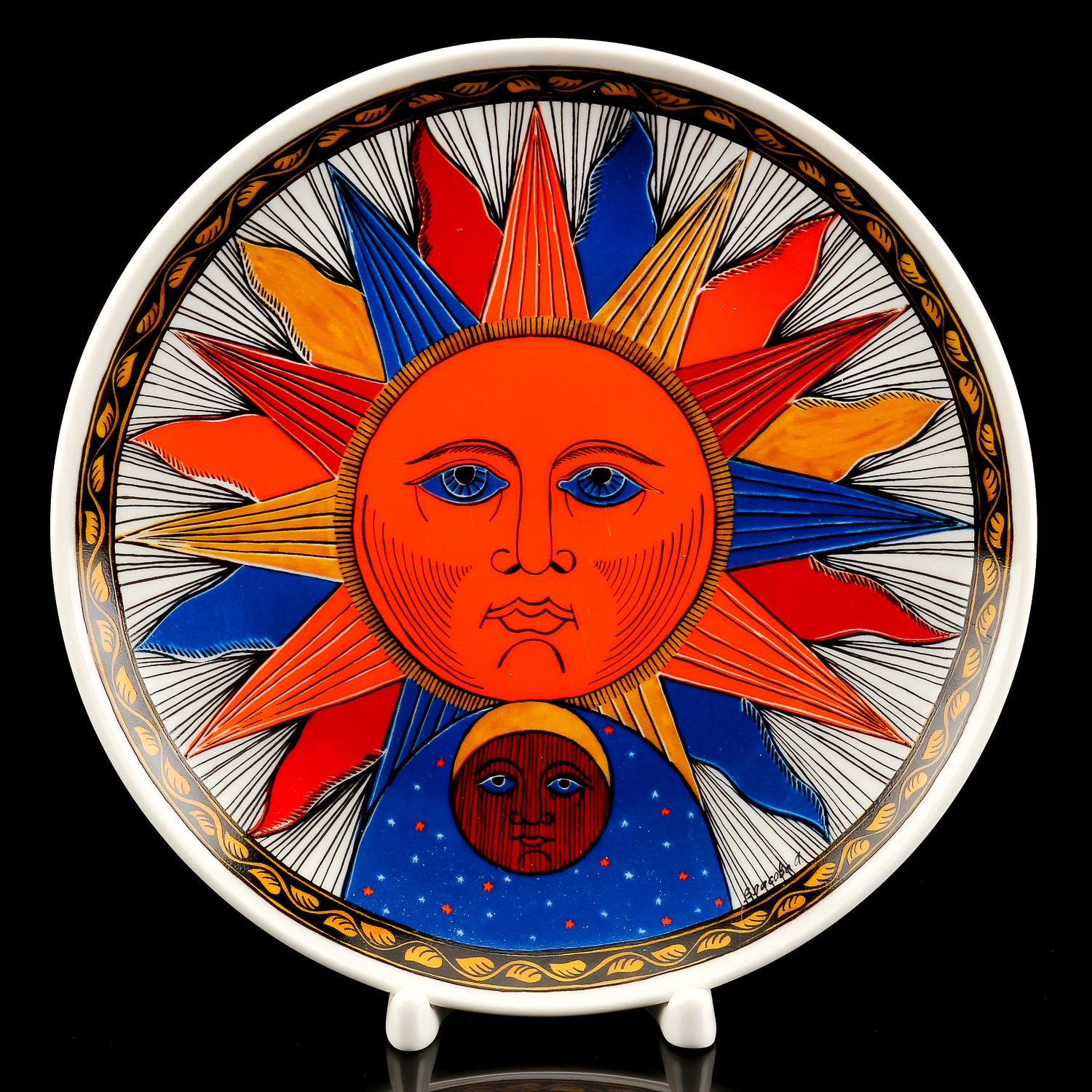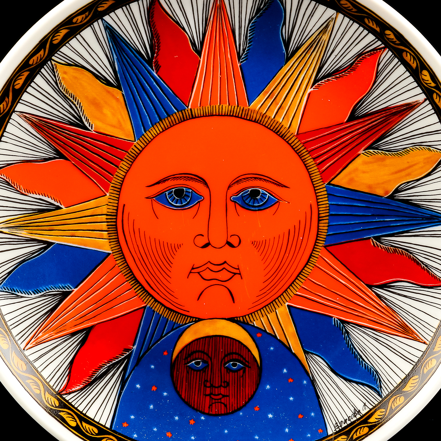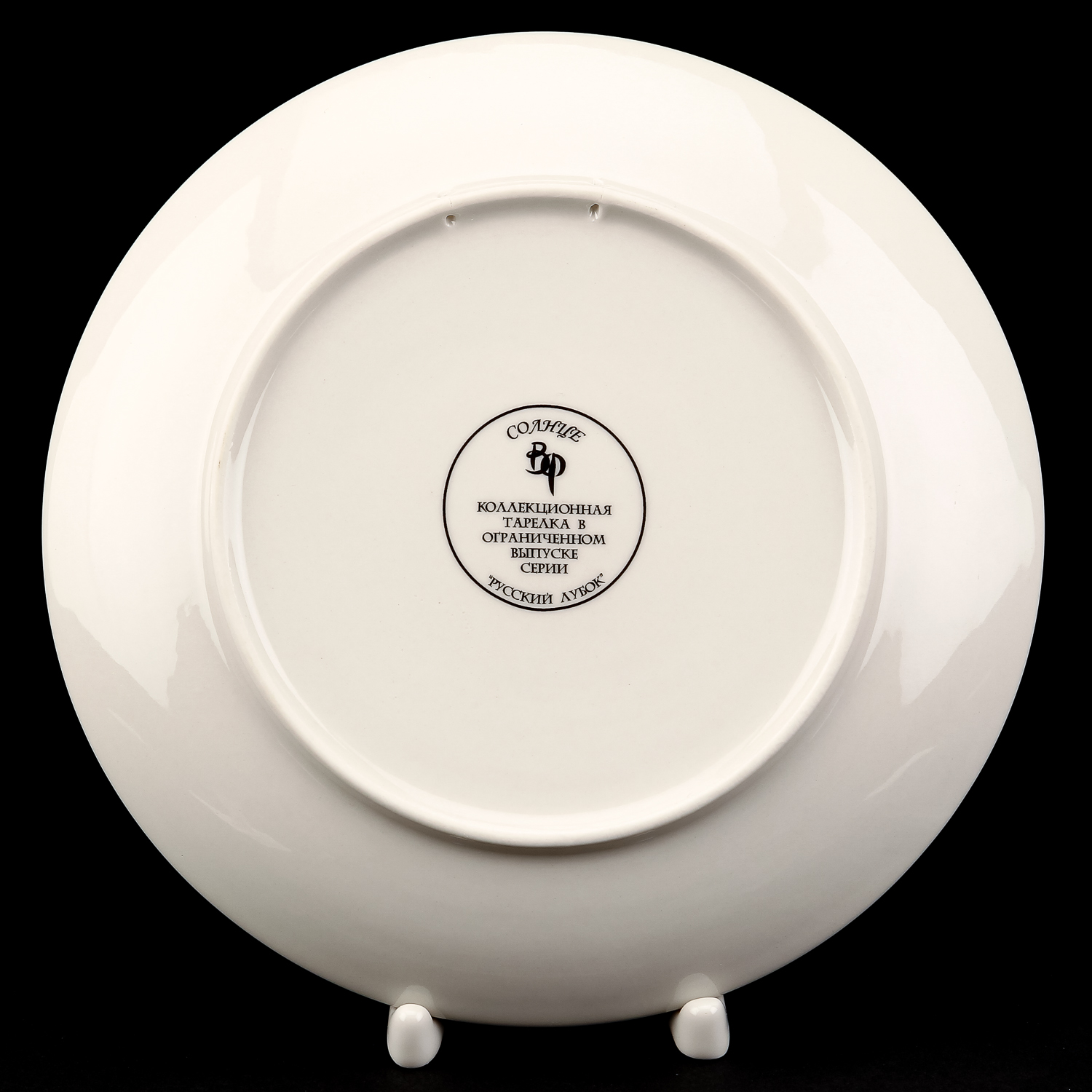 Коллекционная тарелка Русский лубок "Солнце".На тарелке изображен фрагмент известной гравюры «Солнце с Зодиаками». Это роспись потолка Парадных сеней деревянного дворца царя Алексея Михайловича в Коломенском под Москвой. Солнце и Луна с человеческими лицами, знаки Зодиака и четыре времени года служили тогда своеобразным календарем. Известно, что уже в XVII веке царские покои были украшены лубочными листами.