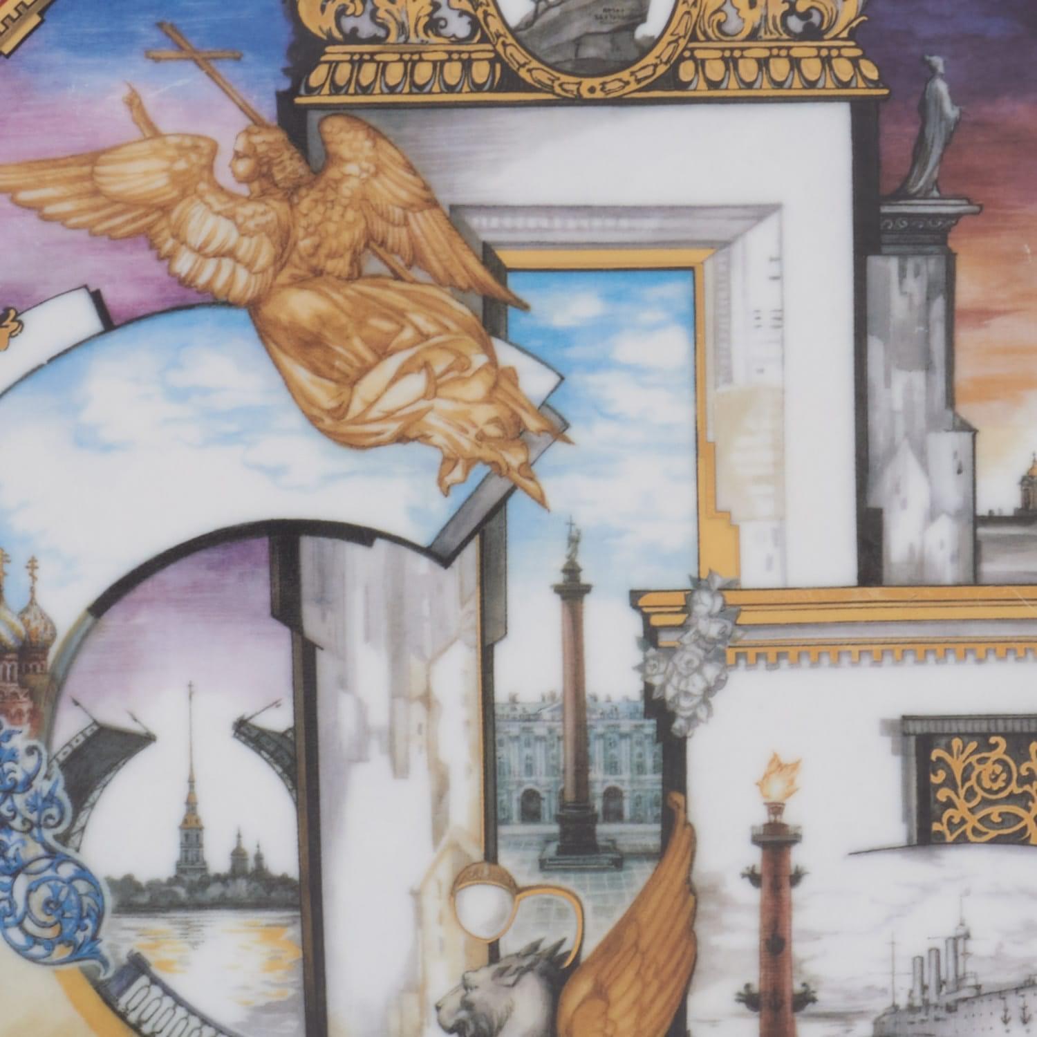 Тарелка изображает Санкт-Петербург. Здесь находится музей Эрмитаж с 3 миллионами экспонатов, расположенный в шести зданиях. Коллекции занимают 365 залов - понадобится 8 лет, чтобы единовременно все осмотреть. Александровскую колонну, установленную в честь победы в войне с Наполеоном, высотой 47 метров, весом 700 тысяч килограммов в вертикальном положении удерживают особая геометрическая форма и вес. Самый старый домик - принадлежавший Петру I. Монарх забросил его в 1721 году, после чего строение приобрело историческую ценность. Петербург построен на болоте на укрепляющих сваях. Исаакиевский собор, например, стоит на 10 760 сваях. Над зданием адмиралтейства установлен 70-метровый шпиль. На верху находится корабль, покрытый двумя килограммами золота. Под ним хранится шар с коллекцией золотых монет, изготовленных со времен основания здания. В Петродворце функционируют 170 фонтанов и 3 каскада. ....