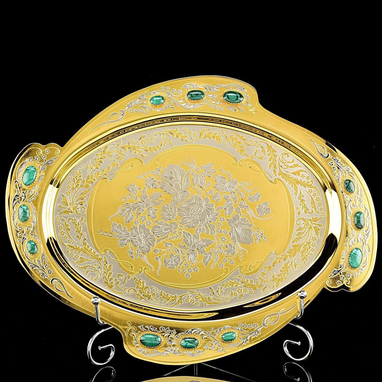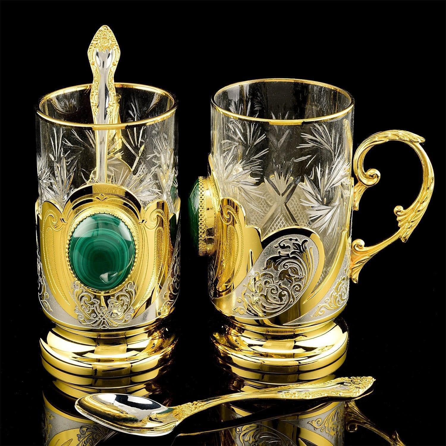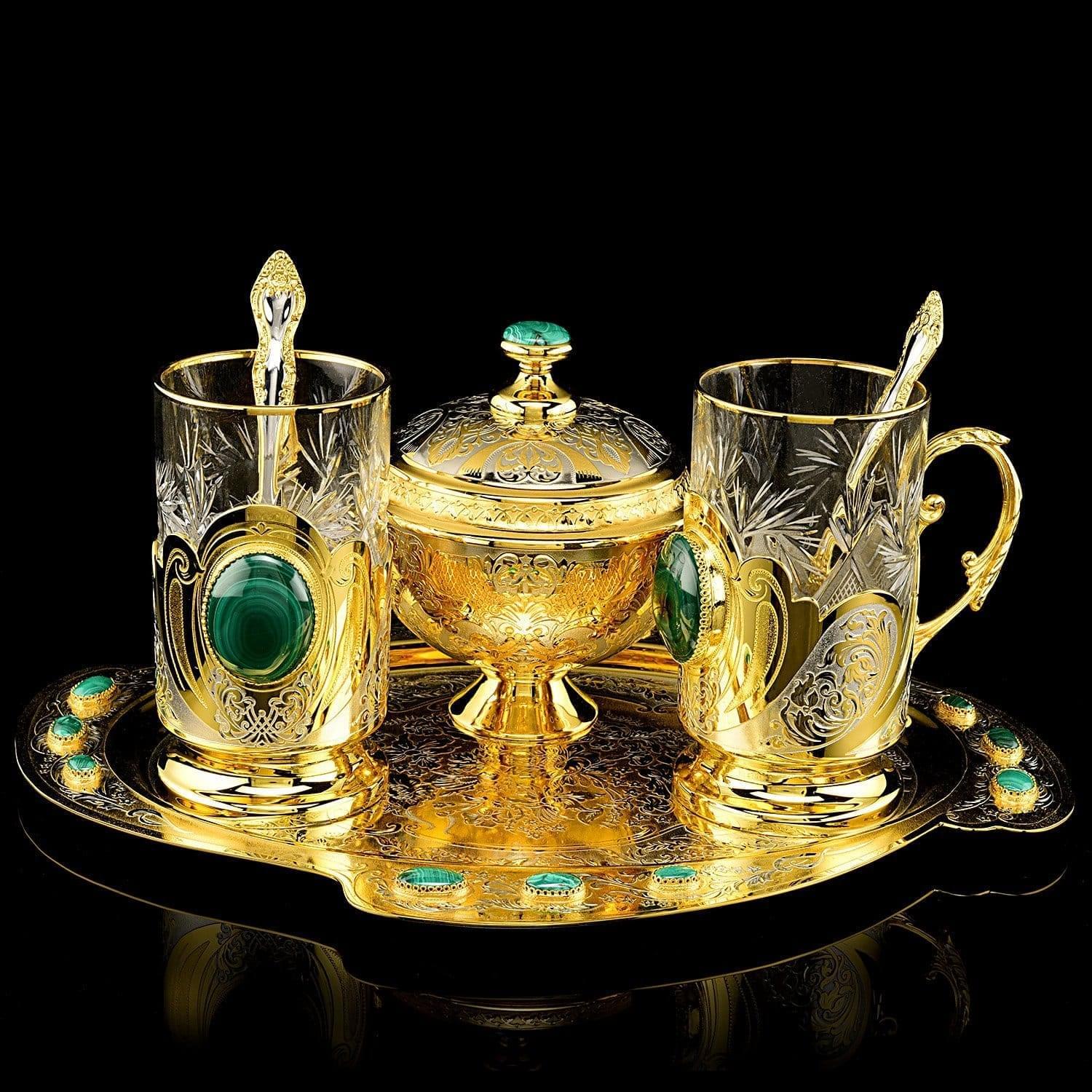 Чайный набор, включающий в себя сахарницу, поднос, ложки и подстаканники, рассчитан на две персоны. В своей работе мастера использовали только качественные, экологически чистые материалы. Изготовленный из латуни корпус подстаканников имеет оригинальную форму. Он покрыт золотом, декорирован кабошонами из малахита и искусно расписан причудливым орнаментом. Несмотря на небольшие размеры полотна – диаметр подстаканников всего 7,5 сантиметров – мастерам удалось создать полноценную, отличающуюся оригинальностью композицию. Поднос и сахарница также покрыты золотом и декорированы натуральными камнями.