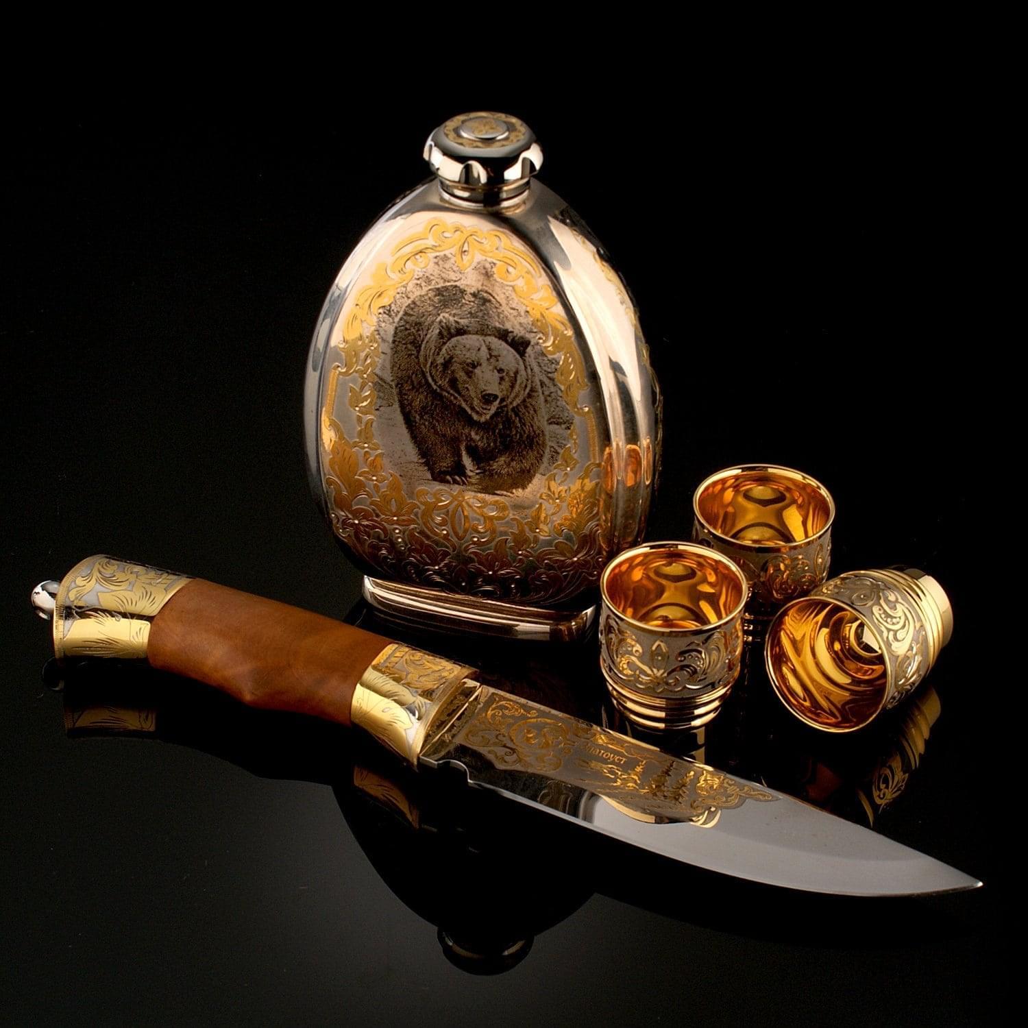 Княжеский стиль! Этот авторский набор из пары питейных сосудов вместе с флягой в имперском стиле и ножом в ножнах с выгравированными на них вручную композициями и орнаментами изготовлен вручную мастерами Златоуста - поставщиками посуды, холодного оружия и элементов декора ручной работы для главной резиденции президента России, Московского Кремля.