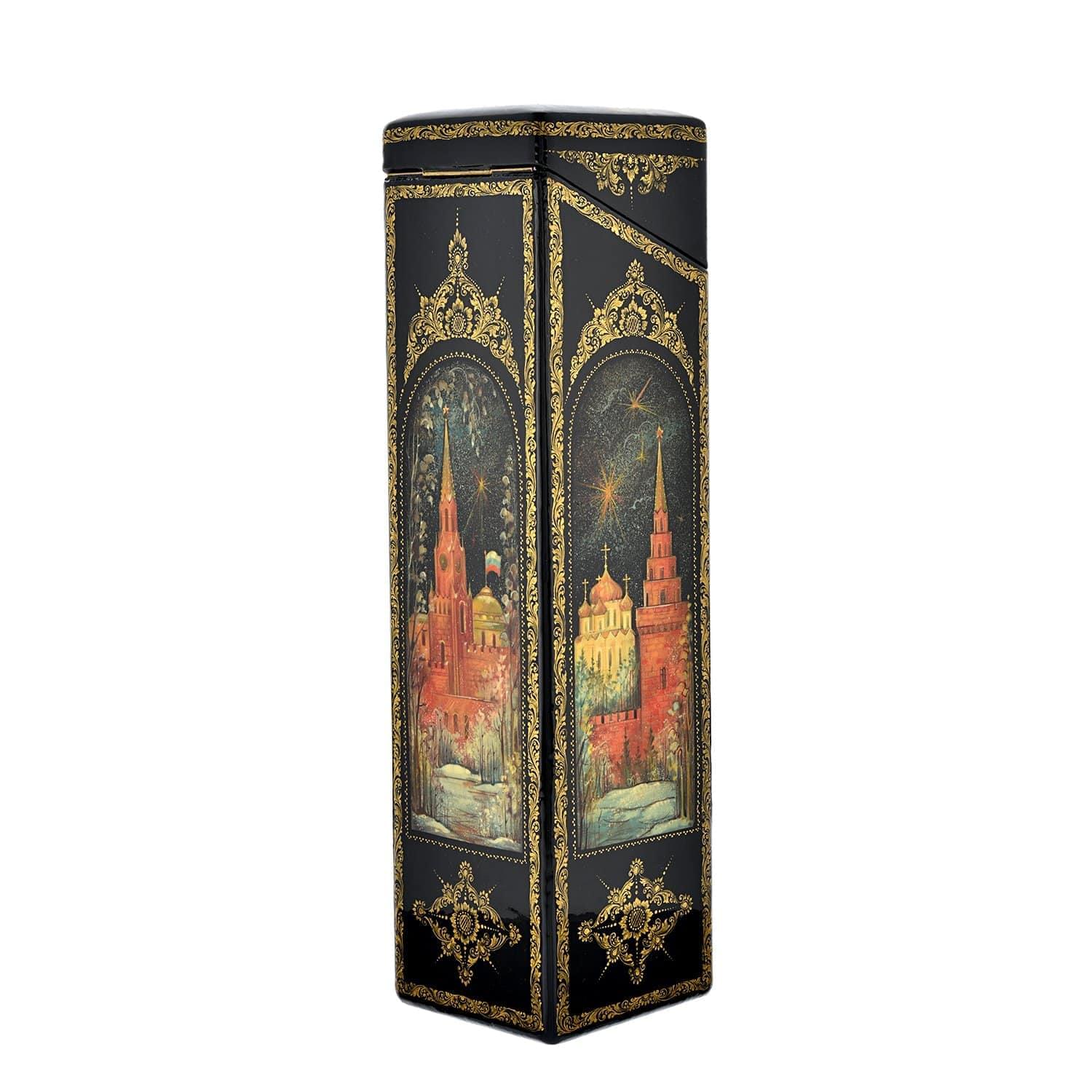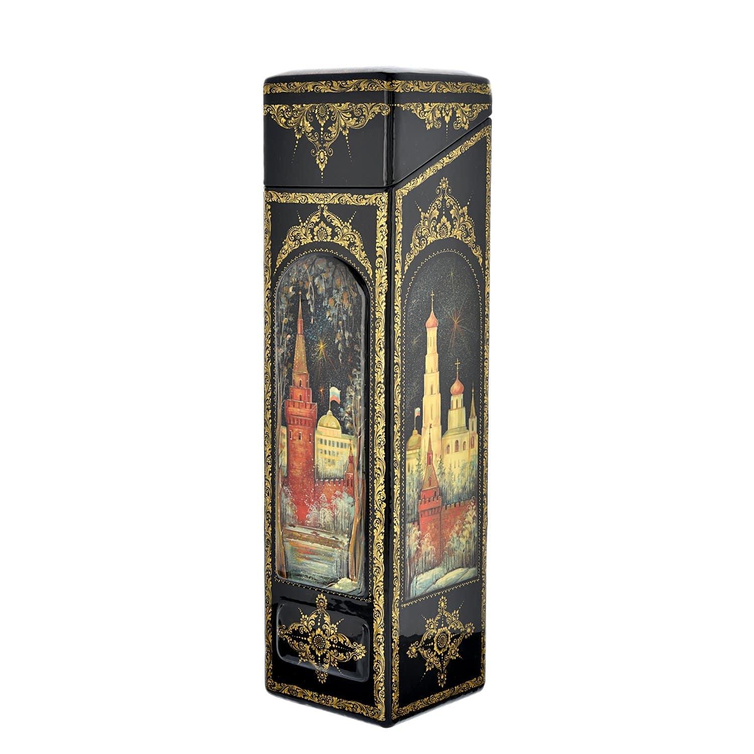 Этот футляр для хранения и дарения элитного спиртного с московскими пейзажами представляет собой образец старинного российского промысла, образец декоративно-прикладного искусства России с художественной и коллекционной ценностью. Бар с изображением Кремля, главной резиденции президента России, - это вариант представительного подарка, который подчеркивает статус.
