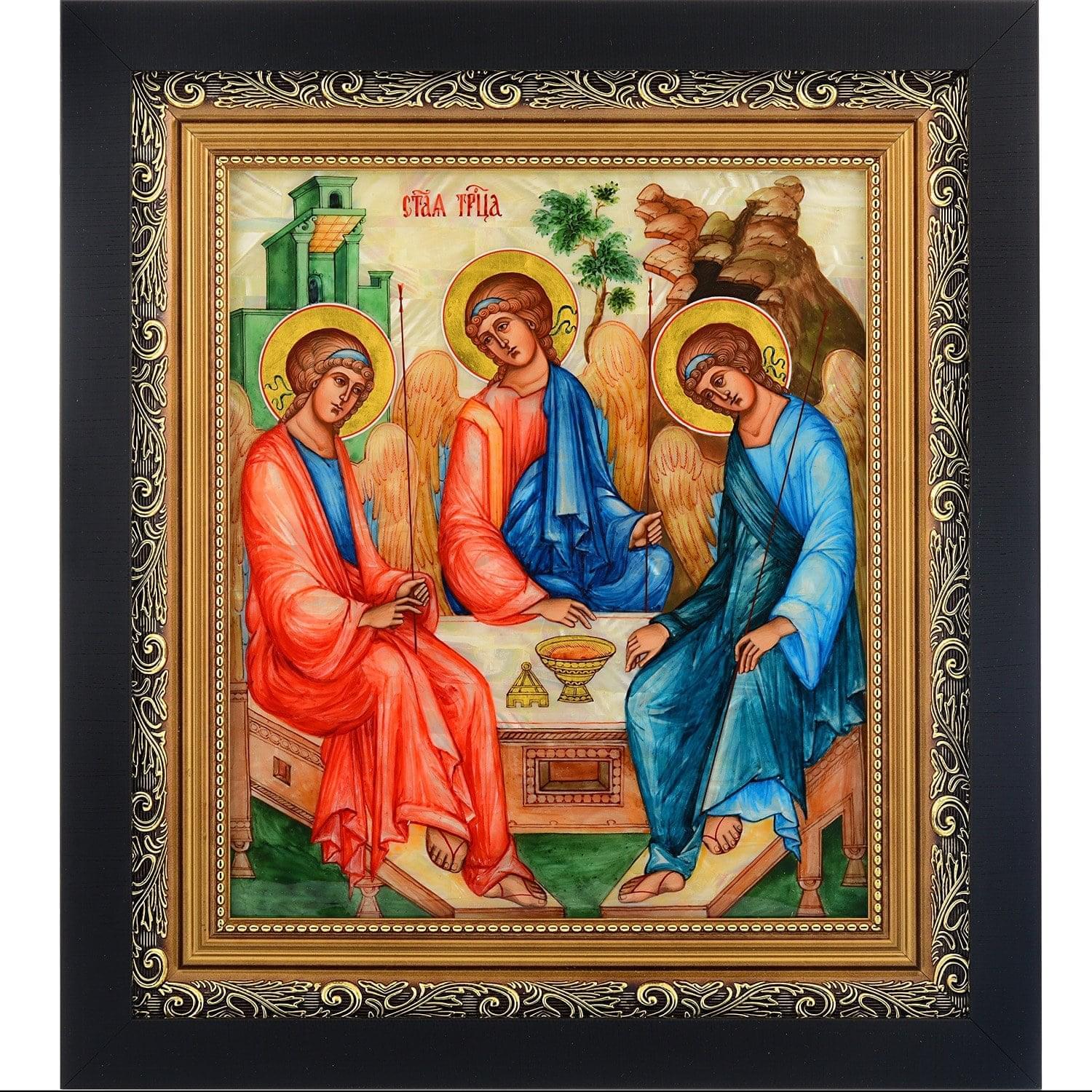 Троица отражает христианское учение о трех Лицах единого по существу Бога. Впервые термин засвидетельствован у Феофила Антиохийского (II век): «Три дня, которые были прежде создания светил, суть образы Троицы, Бога и Его Слова и Его Премудрости». Все три Лица (Ипостаси, Личности) Троицы существуют в единстве, которое творит мир, промышляет о нем и освящает его. Среди католиков, православных, лютеран, англикан вопрос о догмате Троицы никогда не был таким камнем преткновения. Однако в кругах теологов это вопрос принципиальный. День Святой Троицы, Троицын день, иногда Духов день - один из главных христианских праздников. Православная церковь отмечает его в воскресенье в день Пятидесятницы, сошествия Святого Духа на апостолов, на 57-й день после Пасхи. В киоте икона защищена от выли и выцветания. Эта икона-праздник - исповедальный образ, перед которым молятся об отпущении грехов, разрешении драматических и сложных ситуаций в жизни. Написана в стиле русско-византийской иконописи на пластине из перламутра, который создает эффект свечения. .