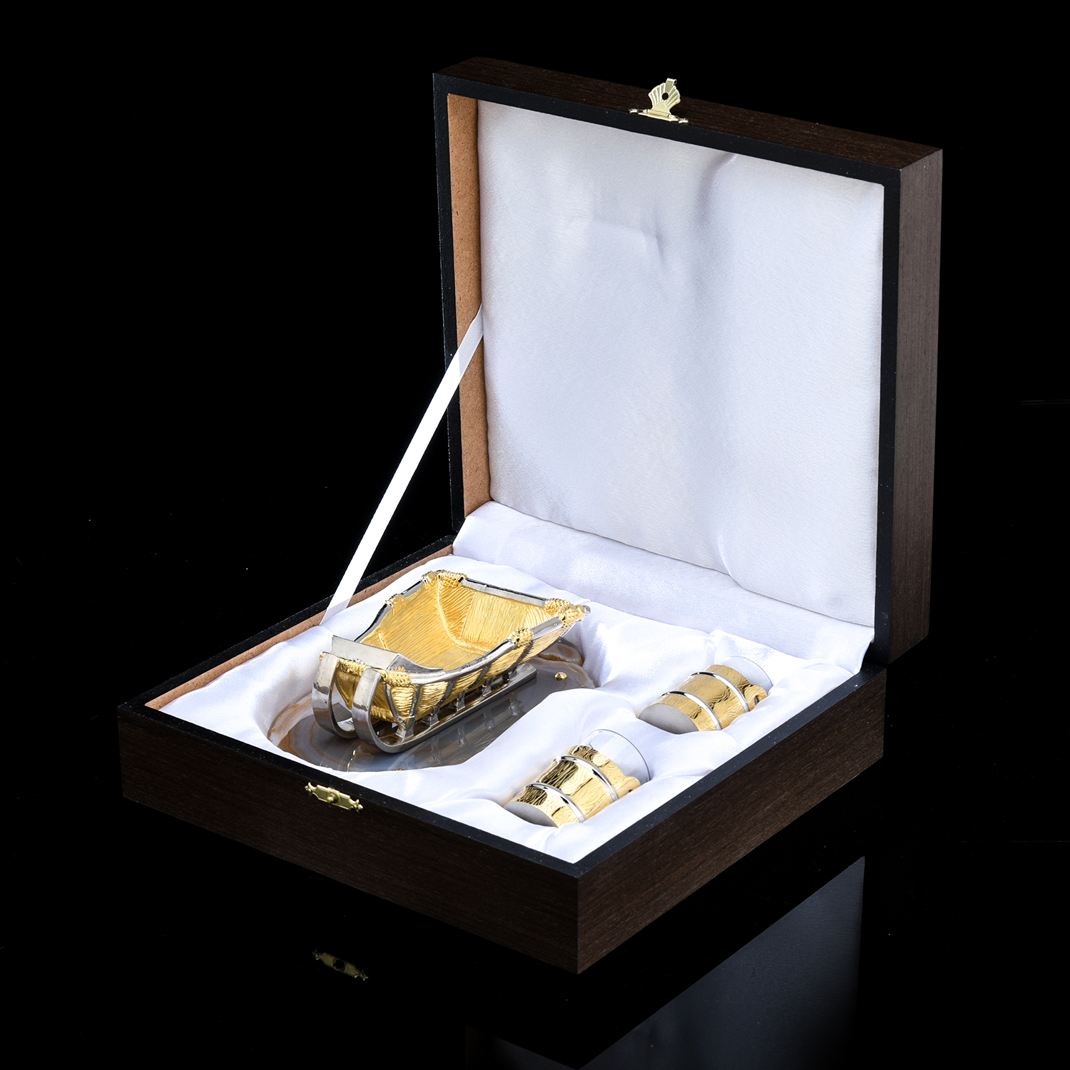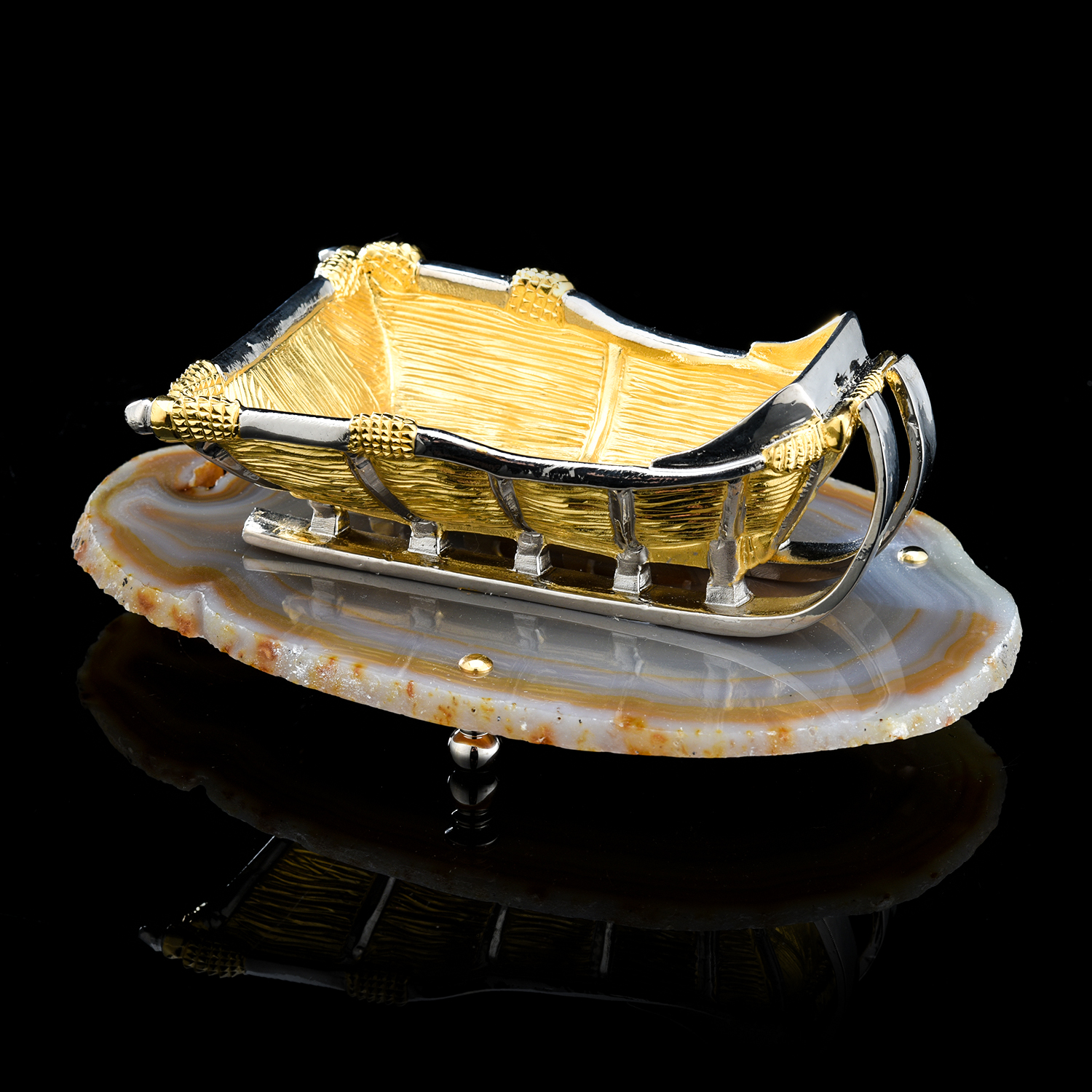 Икорница со стопками "Сани". Златоуст.Материалы: латунь, никель, золото 999,9*, агат, стекло.