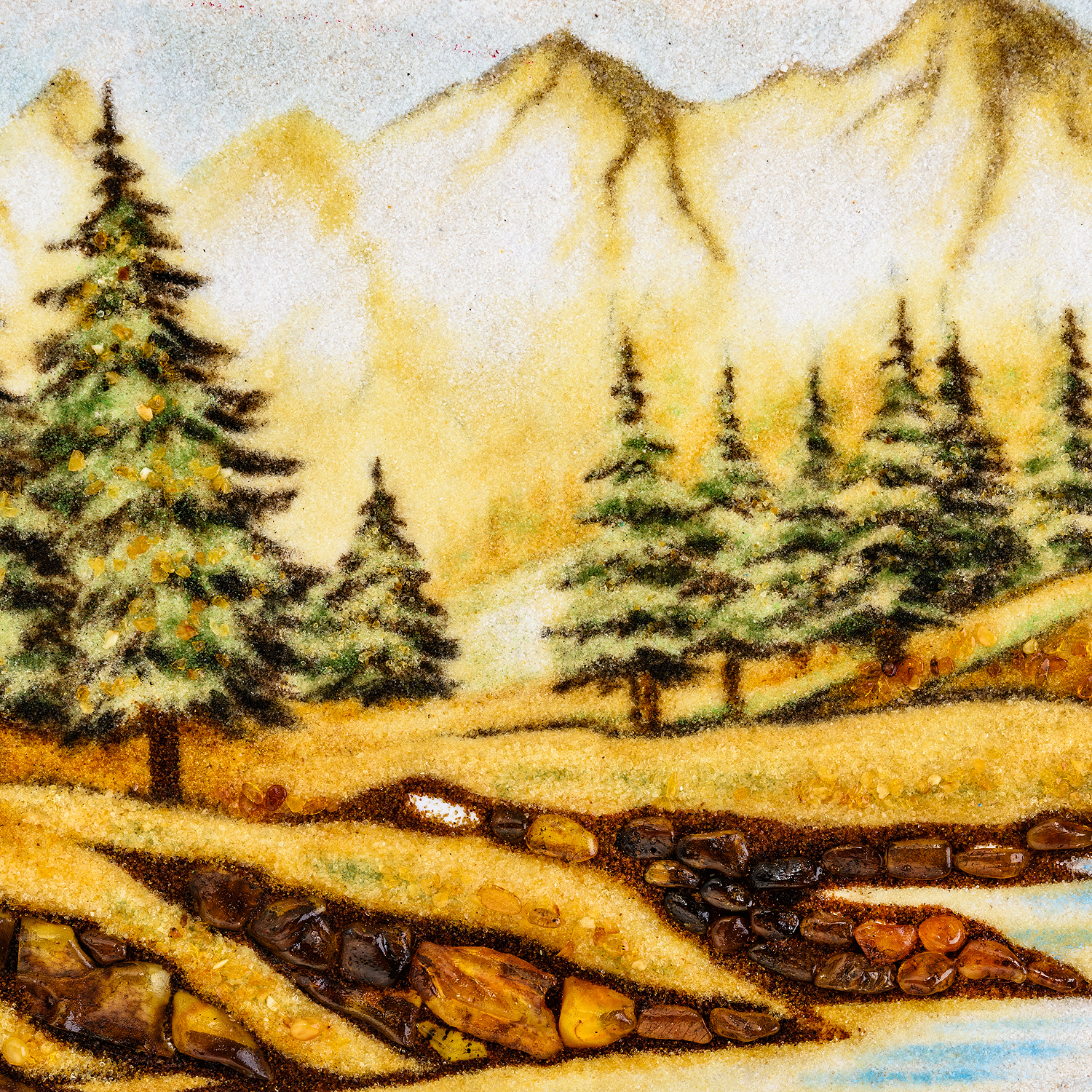 Водопад символизирует вечное движение, катализатор процесса обновления и регенерации, источник первородной жизненной энергетики и перерождения. Русские придумали технологию высыпки каменной крошки на панно. Картины изготавливаются из отборного янтаря-сырца разных оттенков: от мелкой крошки до крупных кабошонов, чьи размеры варьируются в зависимости от размера панно. Рельефная мозаика из самоцветов делает изображение объемным и реалистичным. Для создания его нужно от 12 оттенков янтаря. Для получения эффектного и гармоничного образа все цвета должны плавно перетекать друг в друга. Материалы: янтарь, янтарная крошка, деревянный багет.