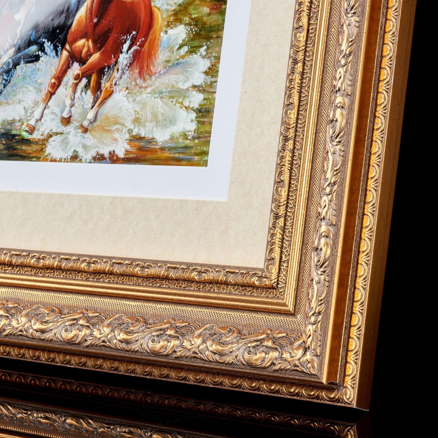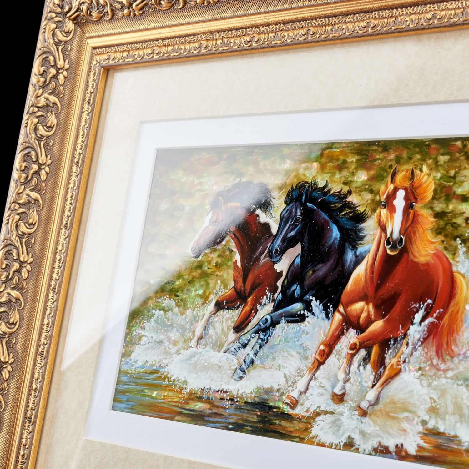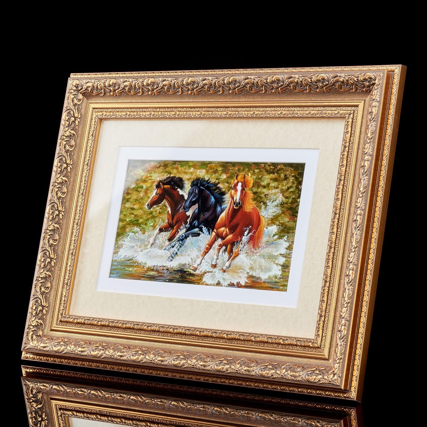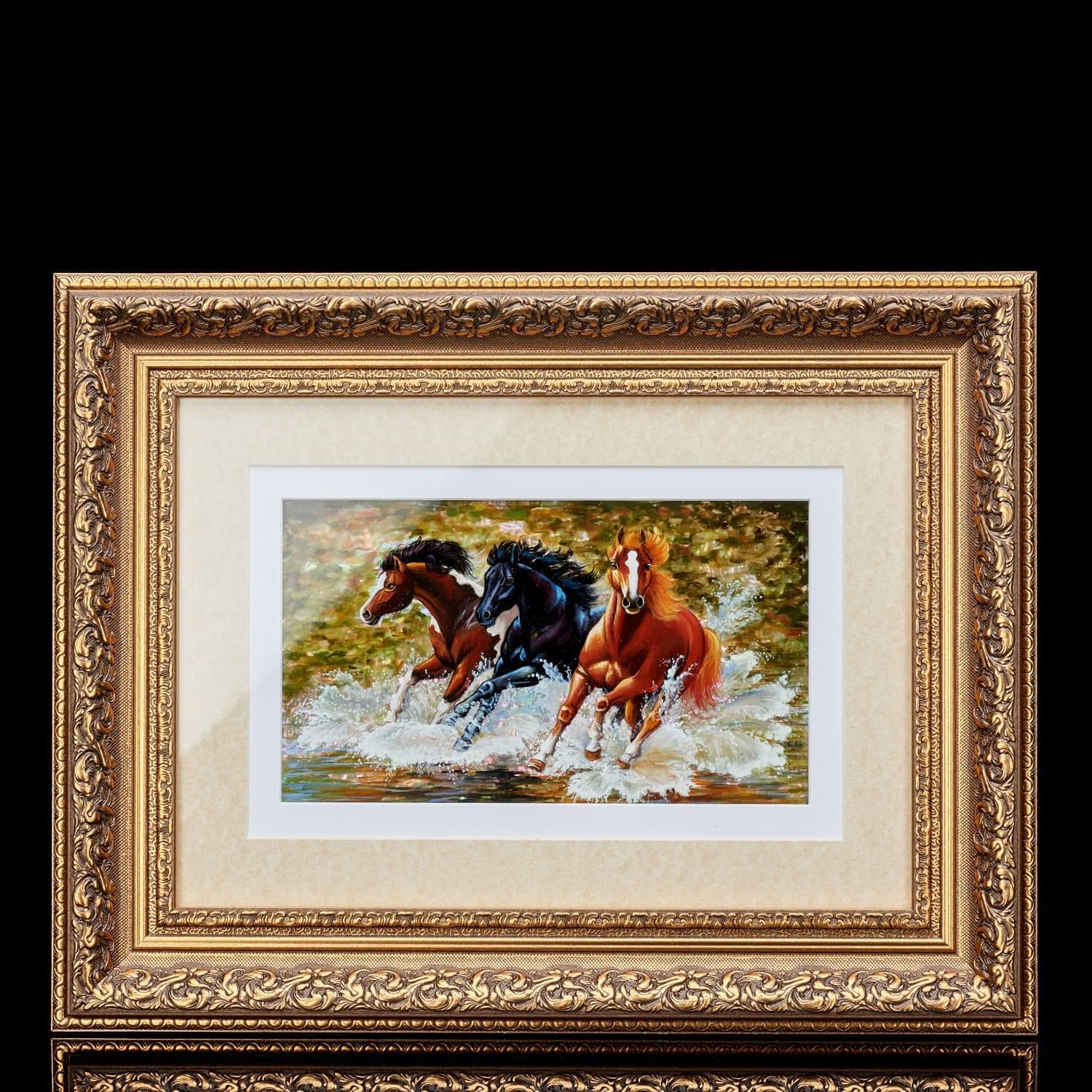 Тройка коней привередливых несется так же стремительно как и жизнь человеческая... Картина с образом тройки лошадей станет местом силы в интерьере вашего дома или офиса. Лошадь символизирует силу, красоту, грациозность, мощь, гармонию, верность, свободу, славу, знатность, мудрость, интеллект. По Библии, конь воплощает совершенное творение Бога. Конь олицетворяет комбинацию силы и поднимающегося духа человека. В наскальной живописи лошади «плывут по поверхности», воплощая стихии и энергию жизни. Она обладает инстинктивной звериной натурой. Фольклор наделяет лошадей магической силой предсказания, плодородия. В христианском искусстве животное - эмблема мужества и благородства. У древних славян конь служил символом смерти и воскресения, подобно Солнцу. Материалы: багет, паспарту, перламутр.